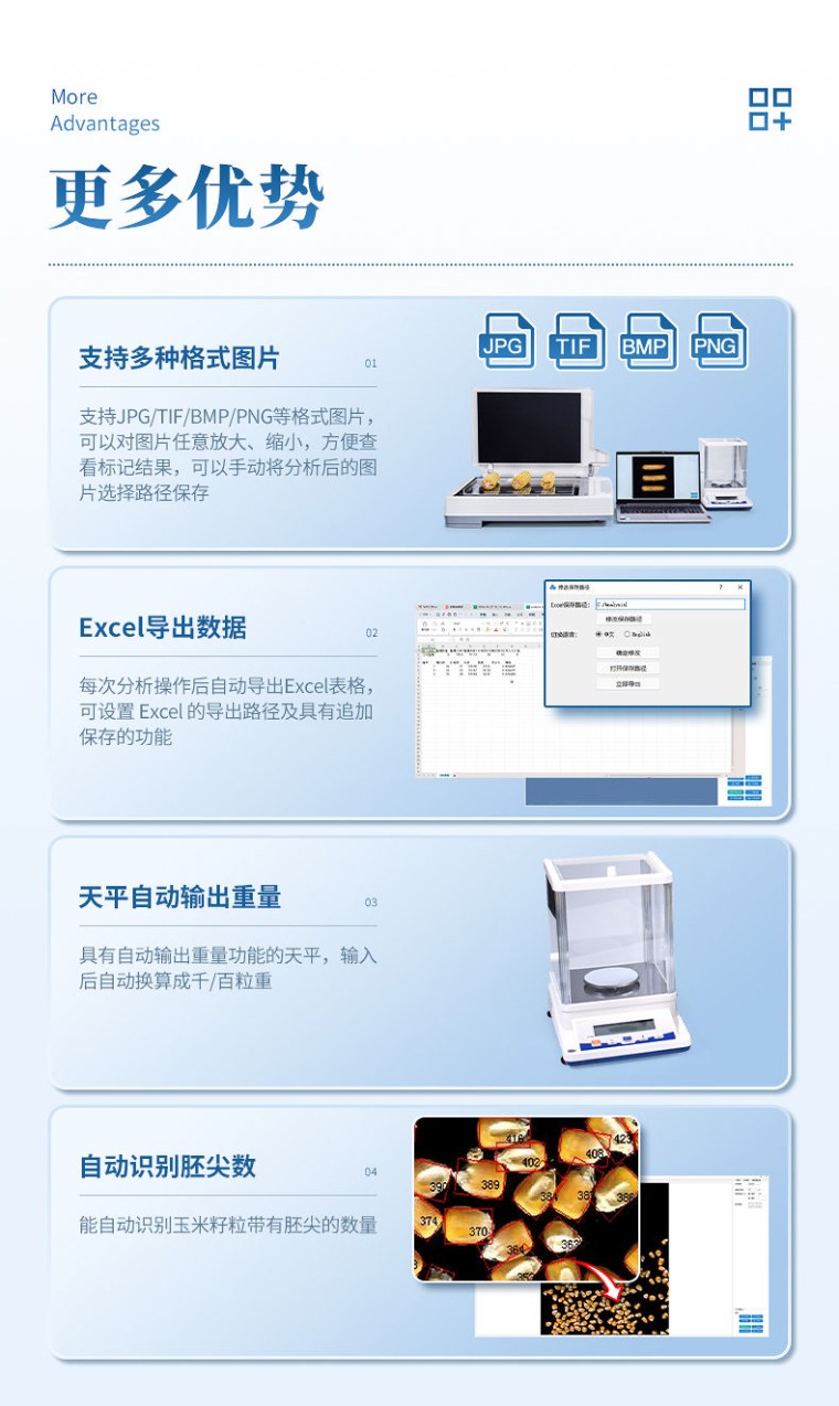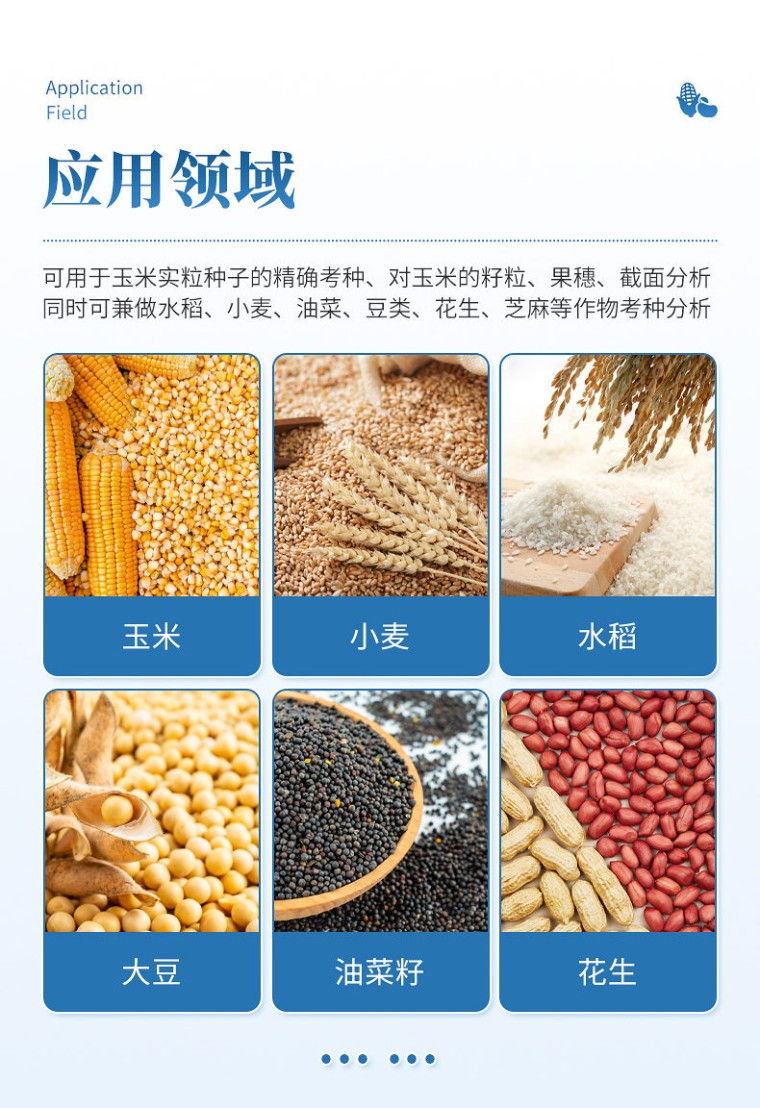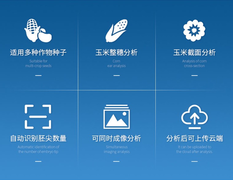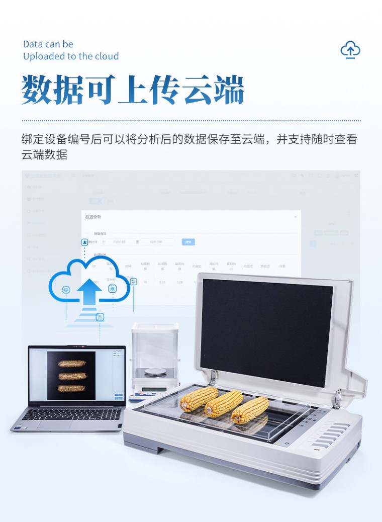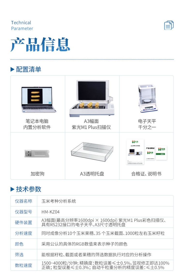 仪器用途 自动玉米考种分析及千粒重系统是根据图像识别原理来实现自动分析的。可用于玉米实粒种子的精确考种、对玉米的籽粒、果穗、截面分析。同时可兼做水稻、小麦、油菜、豆类、花生、芝麻等作物考种分析。 仪器功能 1、适用于玉米,水稻,小麦,大豆、油菜,蔬菜等同粒型种子的粒型指标分析。 2、玉米整穗分析功能:自动测出各玉米的穗行数、行粒数、穗长、穗粗、秃尖长、穗色、穗粒数,秃尖比例,穗重(仅限单个玉米整穗)。 3、玉米截面分析功能:玉米的穗粗、穗直径、轴粗、轴直径、穗粒数、粒长、粒宽、粒周长、粒面积,一次性最少可测35个截面。 4、水稻,小麦,大豆,油菜,蔬菜等种子籽粒分析计算:数量、千粒重/百粒重、每粒种子粒型(包括长、宽、长宽比、标准差、周长、面积) 5、可分析各类种子总结果:所有种子平均值(长、宽、长宽比、周长、面积) 6、硬件装置: A3幅面(最高分辨率1600dpi X 1600dpi) 紫光M1 Plus彩色扫描仪、具有RS232接口的电子天平、A3尺寸透明托盘。 7、分析速度:可同时成像分析10个玉米果穗、35 个玉米截面、1000粒左右玉米籽粒。 8、图像:支持JPG/TIF/BMP/PNG等格式图片,可以对图片任意放大、缩小,方便查看标记结果,可以手动将分析后的图片选择路径保存。 9、数据:每次分析操作后自动导出Excel表格,可设置Excel的导出路径及具有追加保存的功能。 10、重量:具有自动输出重量功能的天平,输入后自动换算成千/百粒重。 11、颜色:采用公认的具体的RGB数值来表示种子的颜色。 12、胚尖数:能自动识别玉米籽粒带有胚尖的数量 13、筛选:能根据籽粒、截面或者果穗的筛选数据执行对应的分析操作。 14、上传云端:绑定设备编号后可以将分析后的数据保存至云端,并支持随时查看云端数据。 15、数粒速度: 1500~4000粒/分钟; 精确度:数粒误差≤士0.5%,监视修正即达100%正确。粒型误差≤士0.3%。自动千粒重分析的精度误差:≤土0.5%。 16、内置中英文双语显示,一键切换,无缝对接 17、软件只适配Windows 10及Windows 10以上系统。