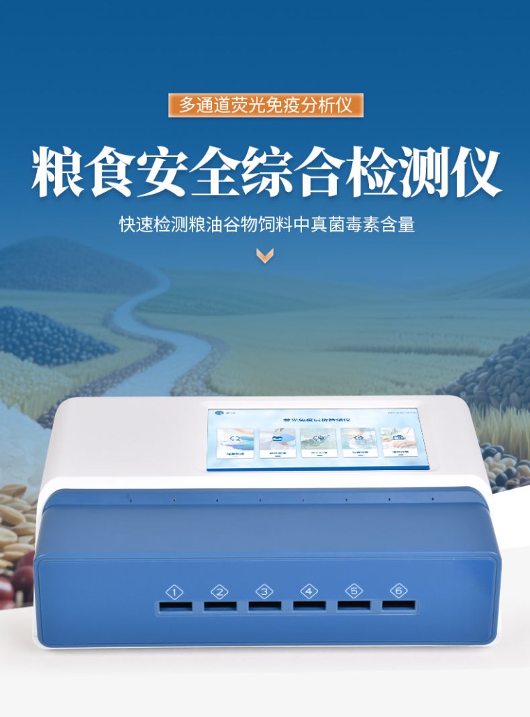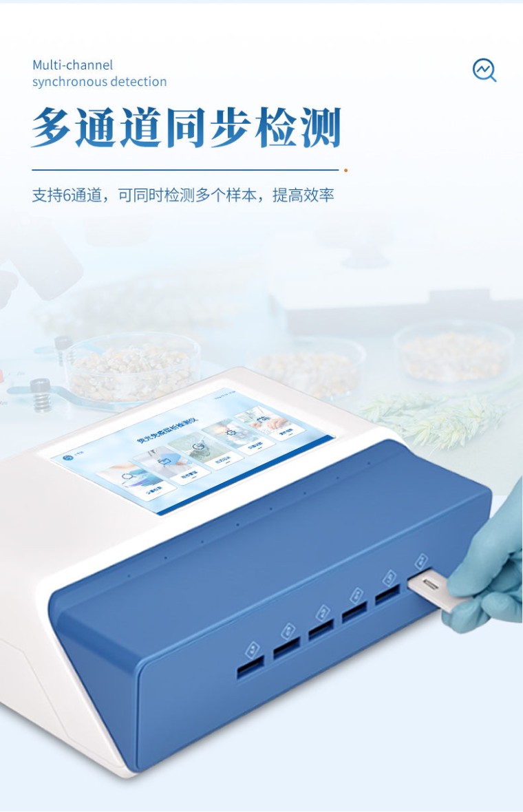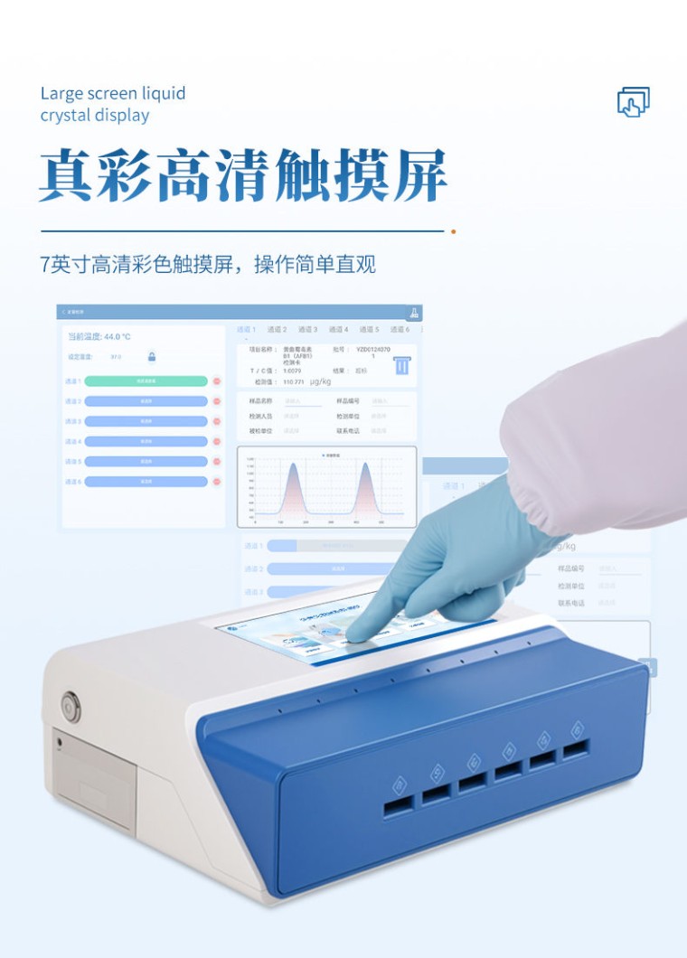 一、产品简介 多通道荧光免疫分析仪采用荧光定量快速检测原理,主要检测食品中真菌毒素、重金属、农药残留、抗生素等;该设备广泛应用于蔬菜批发市场、超市、商场、食药监、地方粮库、谷物生产企业、饲料厂、各类畜牧养殖企业、面粉厂、食品加工厂、第三方检测机构及各级政府监管部门; 二、仪器特点 1、 Android触控系统结合大尺寸高清屏幕,界面友好,操作简单流畅,无需外接设备; 2、 6通道可以同时检测不同项目,显著提升检测效率,满足批量样本快速处理需求; 3、 二维码扫描录入样本信息,避免人工错误 4、 8G超大容量内存,支持按日期灵活查询、预览、删除结果,并生成多样化专业报告。 5、 内置热敏打印机,检测完成即可现场打印标准报告,提升工作效率。 6、 关键部件实时自诊断功能,保障仪器长期稳定运行。 7、 高速有线/无线网络及蓝牙,构建完善的数据监控平台,实现数据实时上传、远程查询、统计分析和监管协同。 8、 丰富的接口设计,轻松连接电脑、U盘、网络及上位机系统,支持U盘导出。 9、 孵育模块为特定试纸条反应提供准确温度环境。 10、 流线型结构,紧凑轻便,兼顾实验室耐用性与检测需求。 11、 插卡判断:检测卡未插入检测通道不能内置质控功能,可设备送检、设备自检、试剂卡自检测方式:孵育检测、即时检测(对检测数据复检核实) 12、 检测曲线:可以对试剂卡的检测核验,防止误判 13、 检测结果:报告出检测项目、被测物质的浓度、检测单位、被检查单位、检验员、检测时间、检测限等信息可在触摸屏上显示,可通过仪器内置打印机输出 14、 项目管理:支持检测项目拓展功能 15、 界面设置:可修改标题和页尾信息,灵活展示仪器信息 三、技术参数 1、 7英寸电容式触摸屏,分辨率:1920:x:1200,内部存储:1+8GB 2、 操作系统:Android:7.1 3、 检测方式:反射式光电适配卡壳:70mm*20mm 4、 语言:中/英文: 5、 存储数量:10万+ 6、 准确性:误差值≤:5% 7、 稳定性:SW(波动系数)≤5% 8、 重复性:CV(变异系数)≤3% 9、 分辨率:0.001 10、 检测通道:6通道检测时间:<5秒(单卡及多联卡);可对样本进行胶体金定性/半定量检测。 11、 数据传输:WiFi、蓝牙、USB、射频读卡、外置扫码模块(选配) 12、 数据处理:可通过通讯端口进行数据汇总、上传监管平台等 13、 检测通道孵育检测一体,温度范围::室温:+5℃:~:60℃ 14、 打印机:热敏打印机(热敏打印纸:57*20mm) 15、 接口:USB接口:2个;USB-B接口:1个;LAN接口:1个:;DC电源接口:5.5/2.1mm 16、 电源:输入:AC100V-240V/1.3A 50Hz;输出:DC12V/5A 17、 使用环境:温度:0~50℃;湿度:0~90%: 18、 主机尺寸::308mm*205mm*91mm 主机重量:约:2.7kg 四、检测项目