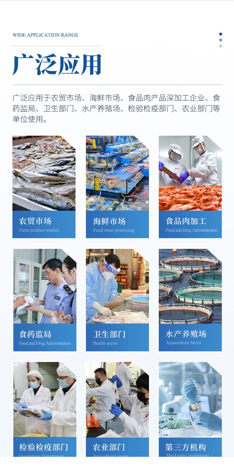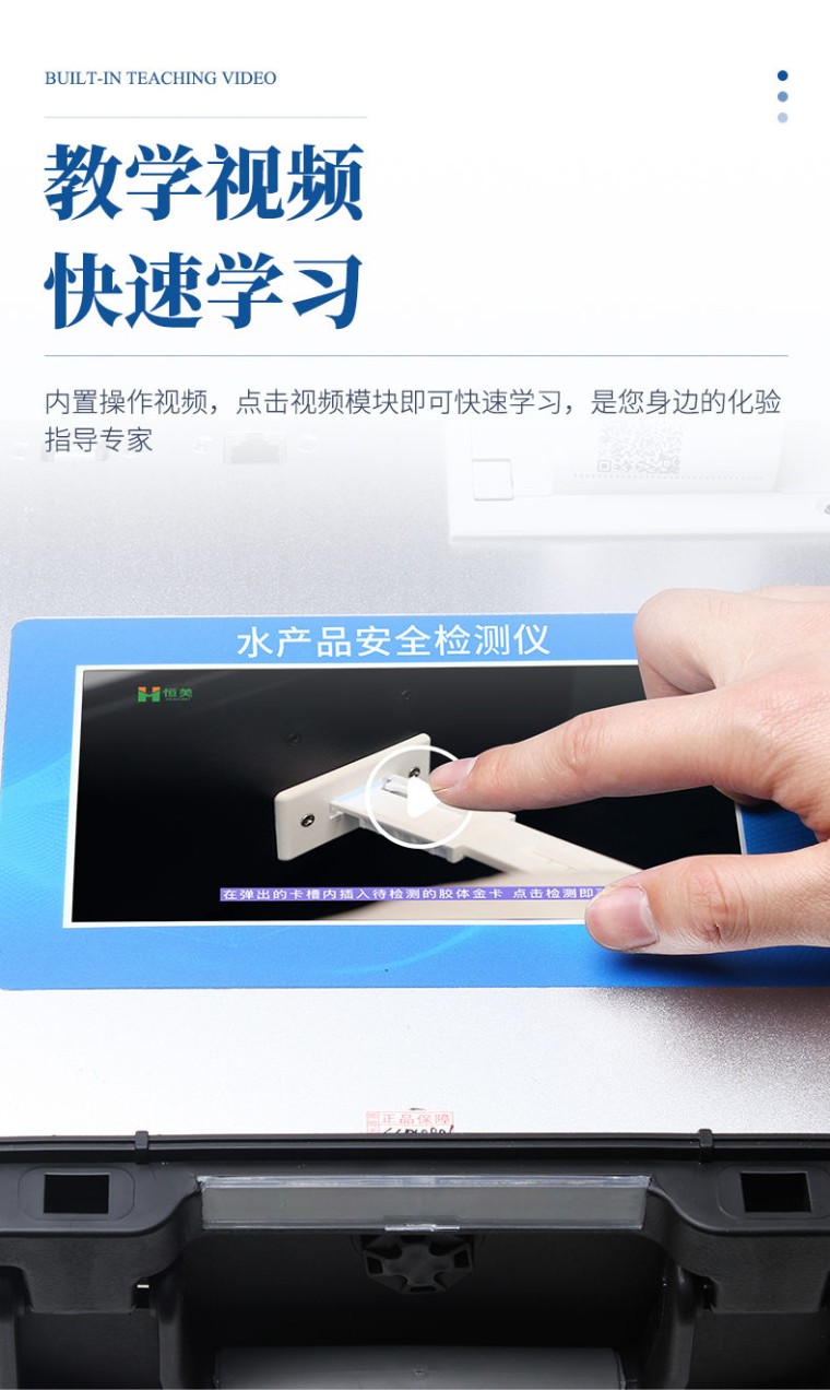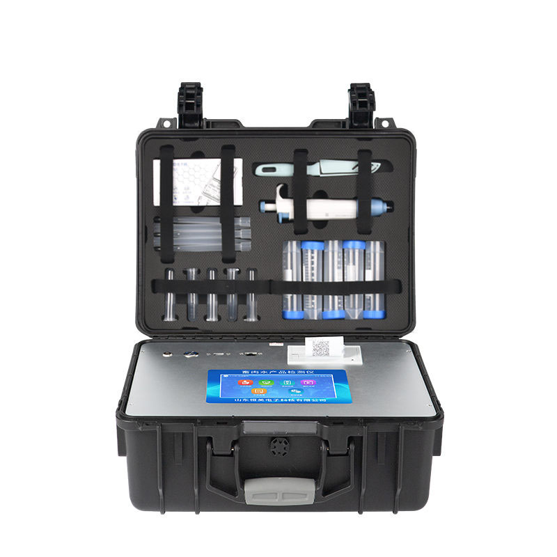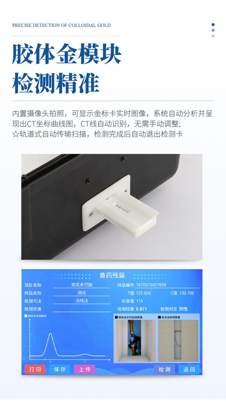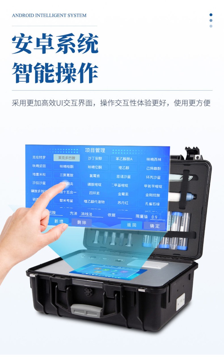 一、产品介绍: 该设备可快速检测鱼、虾等水产类中的氯霉素、孔雀石绿残留,氯霉素快速检测卡整个检测过程只需要30分钟左右, 灵敏度为 0.3 μg/kg (ppb)。该快速检测系统设备为集成化食品安全快速检测分析设备,广泛应用于农贸市场、海鲜市场、食品肉产品深加工企业、食药监局、卫生部门、水产养殖场、检验检疫部门、农业部门、第三方机构等单位使用。 二、检测原理: 该快速检测系统设备利用抑制免疫层析的原理,如样本中的氯霉素在侧向移动的过程中与胶体金标记的特异性单克隆抗体结合,抑制了抗体和NC膜检测线上氯霉素-BSA偶联物的结合,快速判断氯霉素残留。 三、功能特点: 1、安卓智能系统,采用更加高效UI交互界面,操作交互性体验更好,使用更方便。 2、仪器具有wifi、蓝牙、4G联网传输,数据可无线上传,还具有网线连接功能。 3、智能化程度高,仪器具有自检功能:具有开机自检和调零功能,具有自动检测重复性功能。 4、★仪器带有监管平台,数据可局域网和互联网数据上传,检测结果直接传至食品安全监管平台。进行区域食品安全监管及大数据分析处理与数据统计,检测区域食品安全长短期动态,达到食品安全问题预估、预警 5、一体化便携式快检设备,满足现场及流动检测使用需求,能够在同一软件下实现所有检测项目的检测,并可通过同一窗口直观显示检测结果。 6、胶体金模块检测方式:轨道式自动传输扫描,检测完成后自动退出检测卡。 7、★仪器内置摄像头拍照,可显示金标卡实时图像,系统自动分析并呈现出CT坐标曲线图,CT线自动识别,无需手动调整。 8、内置强大的数据库,具有多品类多种类样品菜单功能,可灵活选择检测样品,不同的检测通道可同时检测不同的样品项目。也可在仪器上直接编辑录入样品名称、检测指标、送检单位等信息并保存进样品数据库。 9、★仪器内置操作视频,点击视频模块即可快速学习,是您身边的化验指导专家。 10、样品处理简单省力,整体操作快速、安全、便捷。 11、新一代高速热敏打印机,检测完成可自动打印或批量打印检测报告和二维码。 12、★仪器可配置身份识别功能,通过密码或刷证件开机,防止非工作人员操作等。 13、高灵敏度,高检测精度,高重复性精度,扫描式高精度光学传感器。 14、结果判定线可修改,对照值标定值可保存,断电不丢失数据。 15、兼容市场上所有的胶体金卡,使用耗材不受限制,极大增强用户使用体验。 16、仪器具有重新校准、锁定、恢复出厂设置功能。 四、主要参数: 1、主控芯片采用ARM Cortex-A7,RK3288/4核处理器,主频1.88Ghz,运转速度更快速,稳定性更强。 2、显示方式:7英寸液晶触摸屏显示,人性化中文操作界面,读数直观、简单。 3、交直流两用,直流12V供电,可连接车载电源,可配6ah大容量充电锂电池,方便户外流动测试。 4、智能恒流稳压,光强自动调节与校准,长时间连续工作光源无温漂现象。 5、★内置新国家限量标准,与所测结果进行现场比对,并持续更新标准。 6、不间断进样,连续检测 7、样本编号自动累加。 8、数据无线上传平台,并可从平台导出为Excel表格。 9、检测结果存储容量20万条。 10、★同时支持U盘拷贝,标准USB接口,免驱动插拔。 11、检测项目可扩充,固件可升级 12、仪器尺寸:43×35×19cm, 主机净重:5.2kg ★厂家须有食品安全检测知识产权管理体系认证证书 ★厂家具有高新技术企业认证 ★仪器具有食品安全转件著作权 ★仪器具有***计量研究院出具的计量报告 ★试剂具有***计量研究院出具的试剂测试报告 ★具有ISO9001质量管理体系认证 ★厂家须有独立商标知识产权
