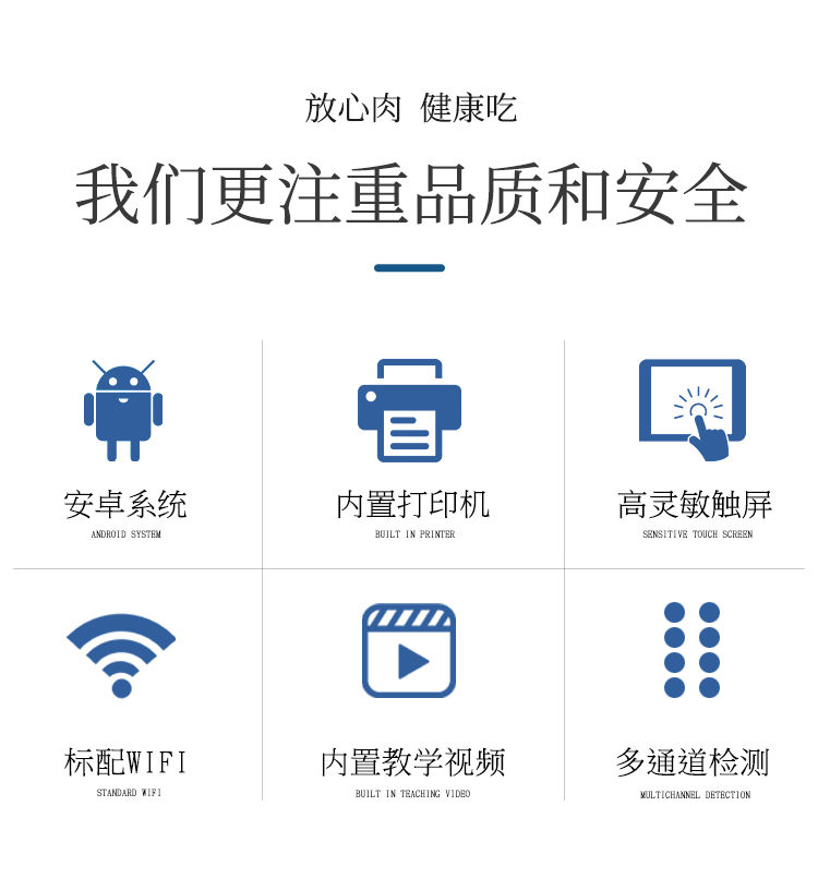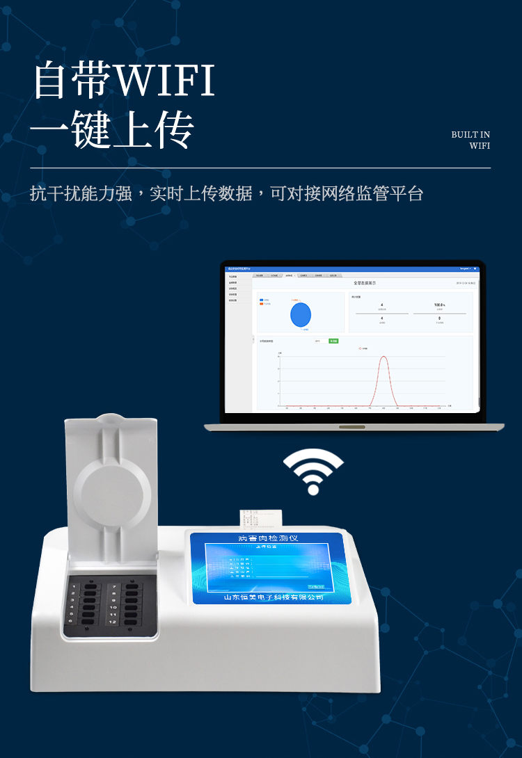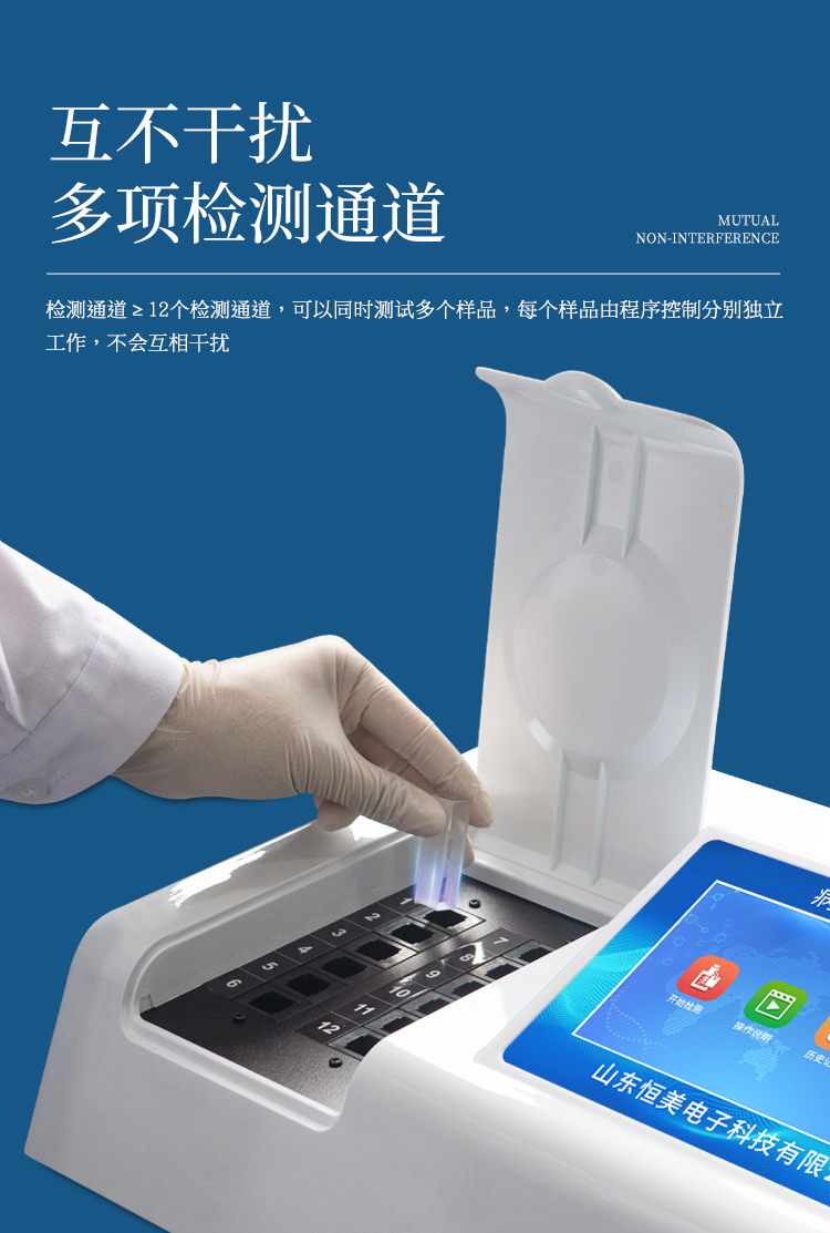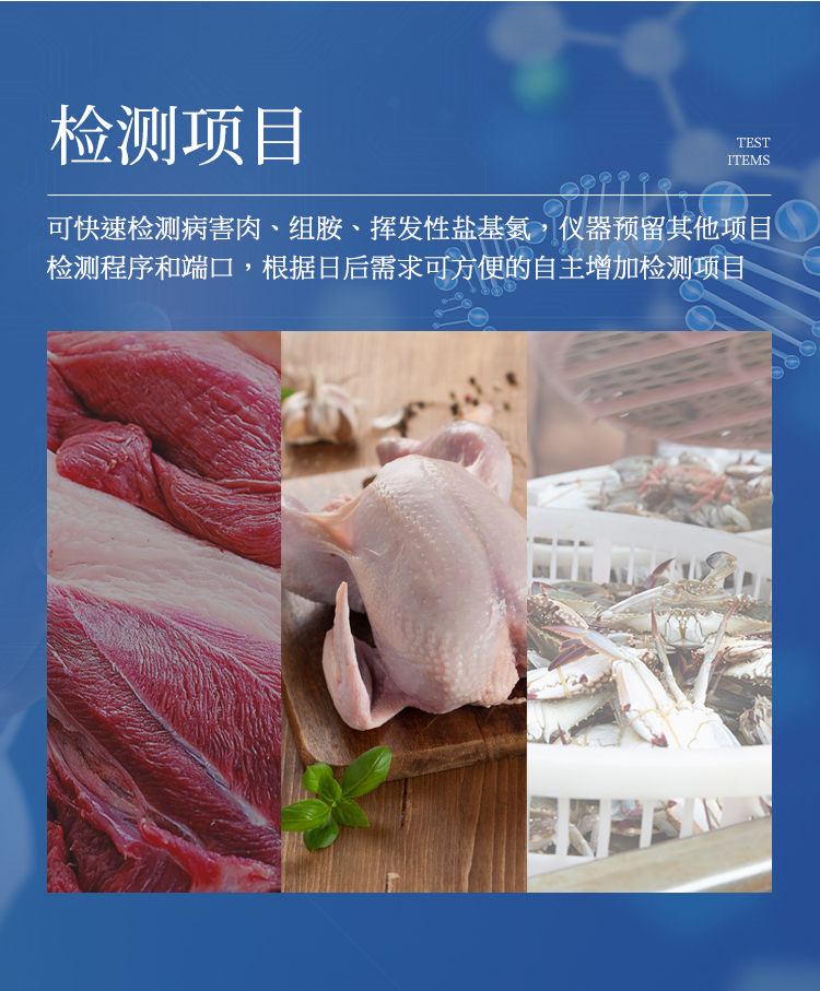 产品用途: 该病害肉检测仪为集成一体化食品安全快速检测分析设备,广泛应用于市场监管局、食品肉产品深加工企业、学校食堂、卫生部门、畜牧部门、屠宰场、检验检疫部门等单位使用。 检测项目: 可快速检测病害肉、组胺、挥发性盐基氮,仪器预留其他项目检测程序和端口,根据日后需求可方便的自主增加检测项目。 【适用样品】 猪肉、牛肉、羊肉、鱼类等 功能介绍: 1、安卓智能操作系统,采用更加高效和人性化操作,仪器具有网线连接、wifi联网上传、GPRS无线远传功能,快速上传数据。 2、智能化程度高,仪器具有自检功能:具有开机自检和调零功能,具有自动检测重复性功能。 3、检测通道:≥12个检测通道,可以同时测试多个样品,每个样品由程序控制分别独立工作,不会互相干扰。 4、显示方式:≥8英寸液晶触摸屏显示,人性化中文操作界面,读数直观、简单。 5、配备新一代嵌入式热敏打印机,可选择手动打印或者自动打印,检测完成可自动打印检测报告和二维码。 6、光源采用进口超高亮发光二极管,高精度、稳定性强、光源可控、可以关掉不使用的光源,功耗更低。 7、采用USB2.0接口设计,方便数据的存贮和移动,并可随时与计算机直接相连,并且可用计算机控制仪器。实现数据查询、浏览、分析、统计、打印等。 8、仪器带有监管平台。数据可局域网和互联网数据上传,检测结果直接传至食品安全监管平台。进行区域食品安全监管及大数据分析处理,检测区域食品安全长短期动态,达到食品安全问题预估、预警 9、仪器具有品类多种类样品菜单库,可灵活选择检测样品,不同的检测通道可同时检测不同的样品项目。 10、样品处理简单省力,整体操作快速、安全、便捷。 11、仪器具有自身保护功能,可设置用户名及密码,防止非工作人员操作等。 12、高灵敏度,高检测精度,高重复性精度,扫描式高精度光学传感器。 13、内置强大的数据库,可在仪器上直接选择样品名称、检测指标、送检单位等信息,也可在仪器上直接编辑录入样品名称、检测指标、送检单位等信息并保存进样品数据库。 14、仪器具有重新校准、锁定、恢复出厂设置功能。 15、支持U盘存储。 结果判定线可修改,对照值标定值可保存,断电不丢失数据。 主要参数: 1、主控芯片采用ARM Cortex-A7,RK3288/4核处理器,主频1.88Ghz,运转速度更快速,稳定性更强。 2、直流12V供电,可连接车载电源,可配6ah大容量充电锂电池,方便户外流动测试。 3、双波长冷光源,每个通道均配置405nm、520nm波长光源,标配先进的光路切换装置,专利光路切换功能可实现最多64波长,并且所有检测项目可实现所有通道同时检测。 4、光源亮度自动调节与校准 5、智能恒流稳压,光强自动校准,长时间连续工作光源无温漂现象。 6、不间断进样,连续检测 7、样本编号自动累加。 8、检测项目可扩充。 9、检测结果可批量打印,批量上传。 10、检测结果为Excel表格,连接电脑即可拷贝。 11、检测结果存储容量20万条 12、标准USB接口,免驱动安装。 13、可配置大容量锂电池,固件可升级 技术参数: ☆精度误差:±3% ☆线性误差:±5‰ ☆稳 定 性: ±0.001A/hr ☆波长准确度:<2.0nm ☆波长范围:450nm ☆波长范围:410nm ☆波长范围:480nm ☆新鲜度:检测下限 20mg/kg 线性范围 0-1000mg/kg ☆组胺:检测下限:50mg/kg 线性范围:50-2000mg/kg ☆挥发性盐基氮:检测下限:10mg/kg 线性范围:0-300mg/kg ☆透射比重复性:±1% ☆数据储存80,00条 ☆比色皿:10×10mm标准样品池 ☆外观尺寸:400x300X180(mm) 【符合标准】 GB2707-2005《鲜(冻)畜肉卫生标准》规定:鲜畜产品、冻畜产品TVB-N应≤15mg/100g, GB16869-2005《鲜(冻)禽肉卫生标准》规定鲜禽产品、冻禽产品TVB-N应≤15mg/100g, GB2733-2005《鲜(冻)动物性水产品卫生标准》规定海水鱼、虾、头足类TVB-N应≤30mg/100g,淡水鱼、虾TVB-N应≤20mg/100g.