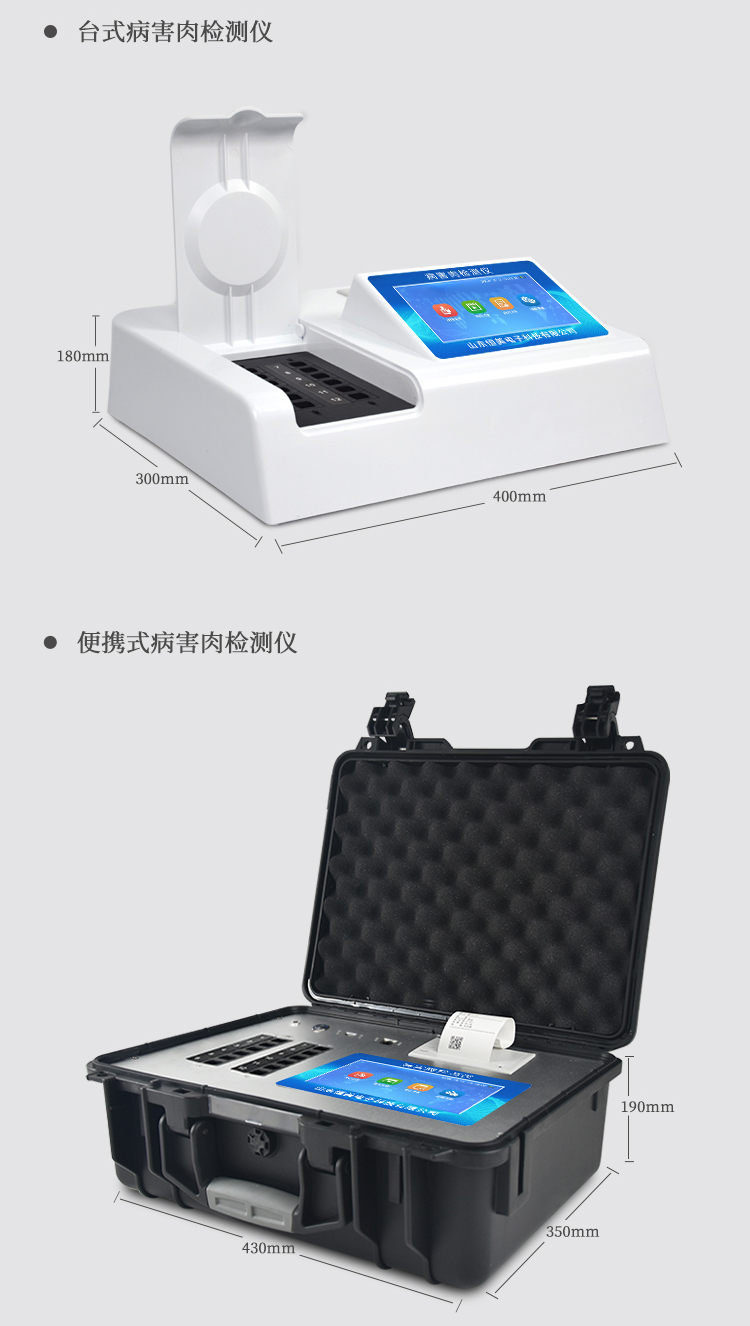 产品用途: 该病害肉快速分析仪为集成化食品安全快速检测分析设备,广泛应用于市场监管局、食品肉产品深加工企业、学校食堂、卫生部门、畜牧部门、屠宰场、检验检疫部门等单位使用。 检测项目: 可快速检测病害肉、组胺、挥发性盐基氮,仪器预留其他项目检测程序和端口,根据日后需求可方便的自主增加检测项目。 【适用样品】 猪肉、牛肉、羊肉、鱼类等 功能介绍: 1、安卓智能操作系统,采用更加高效和人性化操作,仪器具有网线连接、wifi联网上传、GPRS无线远传功能,快速上传数据。 2、智能化程度高,仪器具有自检功能:具有开机自检和调零功能,具有自动检测重复性功能。 3、检测通道:≥12个检测通道,可以同时测试多个样品,每个样品由程序控制分别独立工作,不会互相干扰。 4、显示方式:≥8英寸液晶触摸屏显示,人性化中文操作界面,读数直观、简单。 5、配备新一代嵌入式热敏打印机,可选择手动打印或者自动打印,检测完成可自动打印检测报告和二维码。 6、光源采用进口超高亮发光二极管,高精度、稳定性强、光源可控、可以关掉不使用的光源,功耗更低。 7、采用USB2.0接口设计,方便数据的存贮和移动,并可随时与计算机直接相连,并且可用计算机控制仪器。实现数据查询、浏览、分析、统计、打印等。 8、仪器带有监管平台。数据可局域网和互联网数据上传,检测结果直接传至食品安全监管平台。进行区域食品安全监管及大数据分析处理,检测区域食品安全长短期动态,达到食品安全问题预估、预警 9、一体化便携式快检设备,满足现场及流动检测使用需求,能够在同一软件下实现所有检测项目的检测,并可通过同一窗口直观显示检测结果。 10、仪器具有品类多种类样品菜单库,可灵活选择检测样品,不同的检测通道可同时检测不同的样品项目。 11、样品处理简单省力,整体操作快速、安全、便捷。 12、仪器具有自身保护功能,可设置用户名及密码,防止非工作人员操作等。 13、高灵敏度,高检测精度,高重复性精度,扫描式高精度光学传感器。 14、内置强大的数据库,可在仪器上直接选择样品名称、检测指标、送检单位等信息,也可在仪器上直接编辑录入样品名称、检测指标、送检单位等信息并保存进样品数据库。 15、仪器具有重新校准、锁定、恢复出厂设置功能。 16、支持U盘存储。 结果判定线可修改,对照值标定值可保存,断电不丢失数据。 主要参数: 1、主控芯片采用ARM Cortex-A7,RK3288/4核处理器,主频1.88Ghz,运转速度更快速,稳定性更强。 2、直流12V供电,可连接车载电源,可配6ah大容量充电锂电池,方便户外流动测试。 3、双波长冷光源,每个通道均配置405nm、520nm波长光源,标配先进的光路切换装置,专利光路切换功能可实现最多64波长,并且所有检测项目可实现所有通道同时检测。 4、光源亮度自动调节与校准 5、智能恒流稳压,光强自动校准,长时间连续工作光源无温漂现象。 6、内置新国家限量标准,与所测结果进行现场比对,并持续更新标准。 7、不间断进样,连续检测 8、样本编号自动累加。 9、检测项目可扩充。 10、检测结果可批量打印,批量上传。 11、检测结果为Excel表格,连接电脑即可拷贝。 12、检测结果存储容量20万条 13、标准USB接口,免驱动安装。 14、可配置大容量锂电池,固件可升级 技术参数: ☆精度误差:±3% ☆线性误差:±5‰ ☆稳 定 性: ±0.001A/hr ☆波长准确度:<2.0nm ☆波长范围:450nm ☆波长范围:410nm ☆波长范围:480nm ☆新鲜度:检测下限 20mg/kg 线性范围 0-1000mg/kg ☆组胺:检测下限:50mg/kg 线性范围:50-2000mg/kg ☆细菌毒素:检测下限:0.1mg/kg线性范围:0.1-5 mg/kg ☆透射比重复性:±1% ☆数据储存80,00条 ☆比色皿:10×10mm标准样品池 ☆外观尺寸:430x350X190(mm) 【符合标准】 GB2707-2005《鲜(冻)畜肉卫生标准》规定:鲜畜产品、冻畜产品TVB-N应≤15mg/100g, GB16869-2005《鲜(冻)禽肉卫生标准》规定鲜禽产品、冻禽产品TVB-N应≤15mg/100g, GB2733-2005《鲜(冻)动物性水产品卫生标准》规定海水鱼、虾、头足类TVB-N应≤ 30mg/100g,淡水鱼、虾TVB-N应≤20mg/100g.