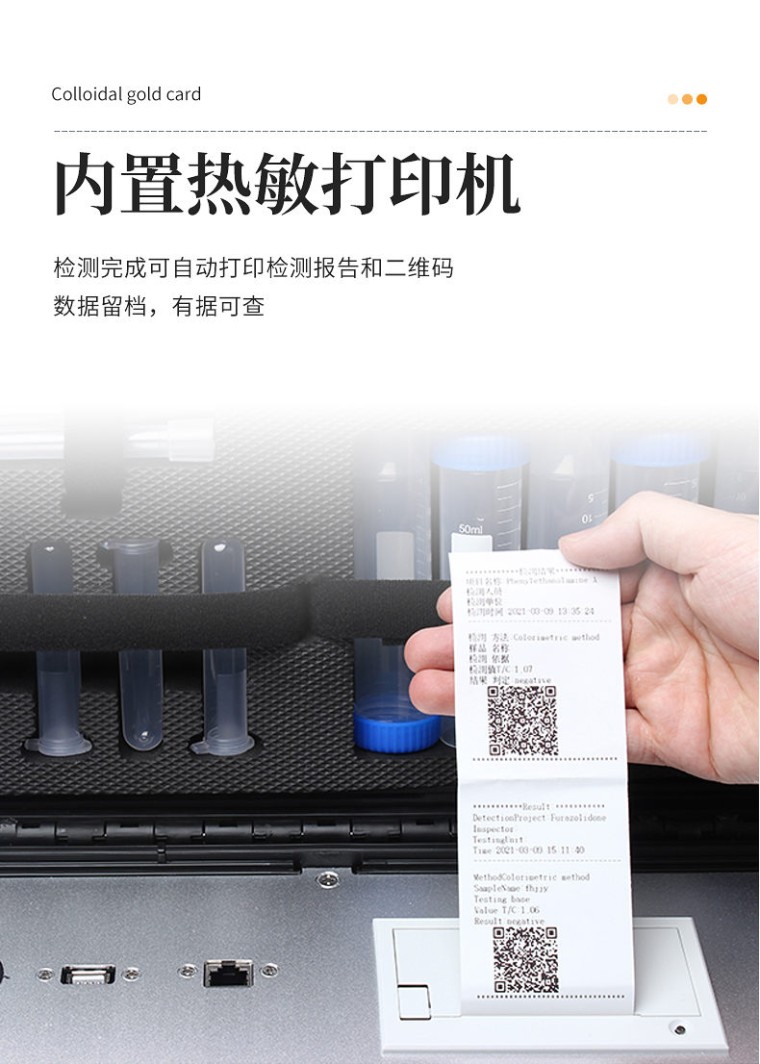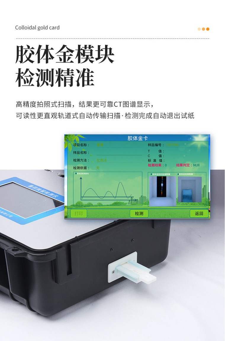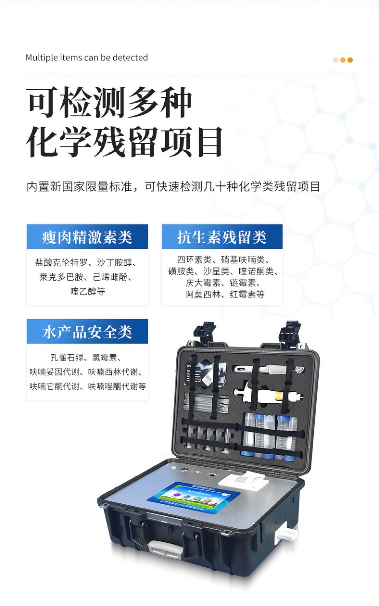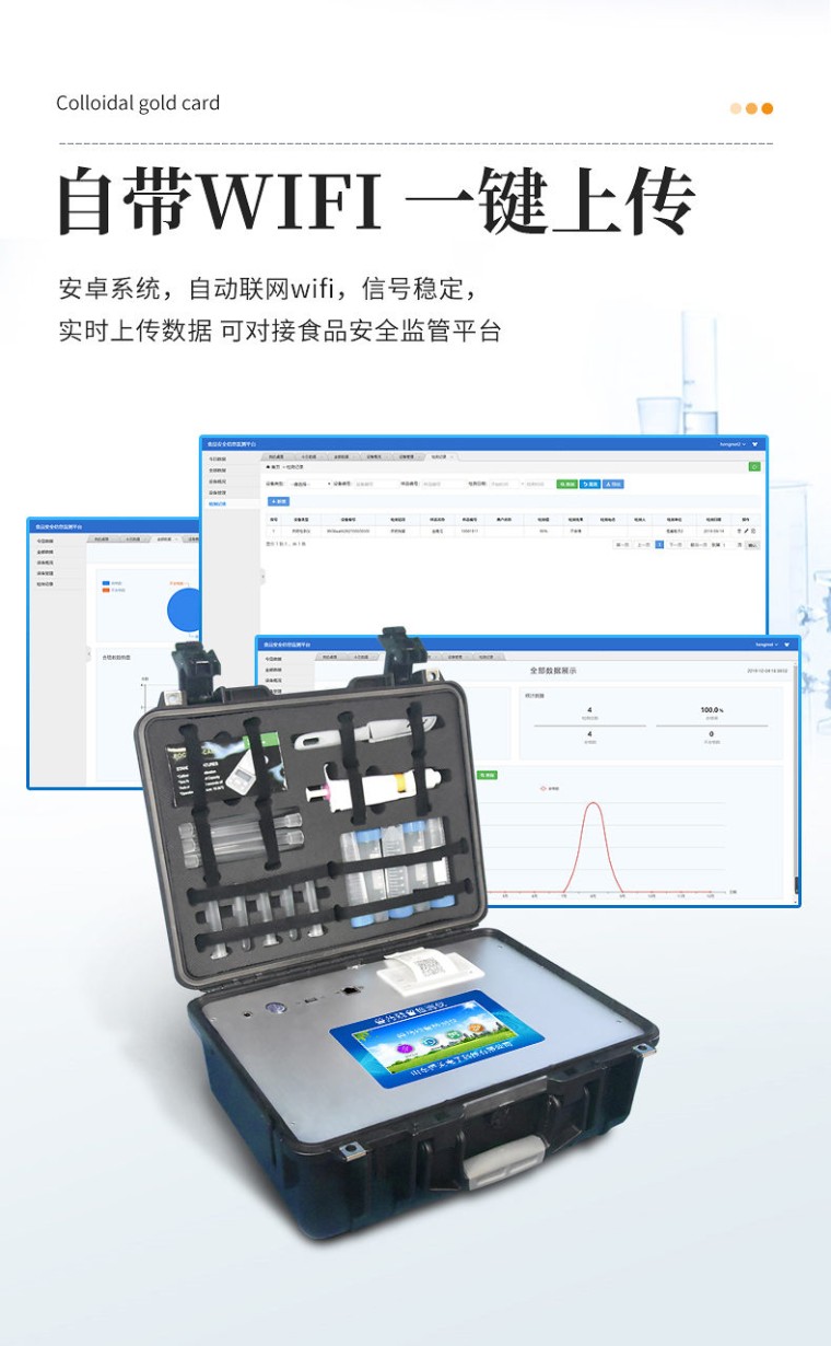 氯霉素检测仪可快速检测肌肉组织(鱼、虾等水产类)中的氯霉素残留,氯霉素快速检测卡整个检测过程只需要30分钟左右, 灵敏度为 0.3 μg/kg (ppb),该设备还可应用于四环素类、硝基呋喃类、磺胺类、沙星类、孔雀石绿等快速检测。 系统配置: 该设备完整配套氮吹仪、离心机、粉碎机、压缩机,系统解决用户操作难问题。 检测原理: 该设备利用抑制免疫层析的原理,样本中的氯霉素在侧向移动的过程中与胶体金标记的特异性单克隆抗体结合,抑制了抗体和NC膜检测线上氯霉素-BSA偶联物的结合,快速判断氯霉素残留。 产品用途: 该设备为集成化食品安全快速检测分析设备,广泛应用于养殖场、屠宰场、食品肉产品深加工企业、检验检疫部门、食药监局、卫生部门、高教院校、科研院所、农业部门等单位使用。 产品性能: 1、安卓智能操作系统,采用更加高效和人性化操作,仪器具有网线连接、wifi联网上传、GPRS无线远传功能,快速上传数据。 2、智能化程度高,仪器具有自检功能:具有开机自检和调零功能,具有自动检测重复性功能。 3、新一代高速热敏打印机,检测完成可自动打印检测报告和二维码。 4、仪器带有监管平台。数据可局域网和互联网数据上传,检测结果直接传至食品安全监管平台。进行区域食品安全监管及大数据分析处理与数据统计,检测区域食品安全长短期动态,达到食品安全问题预估、预警。 6、一体化便携式快检设备,满足现场及流动检测使用需求,能够在同一软件下实现所有检测项目的检测,并可通过同一窗口直观显示检测结果。 7、胶体金模块检测方式:轨道式自动传输扫描,检测完成后自动退出检测卡。 8、CT线自动识别,无需手动调整。 9、仪器具有品类多种类样品菜单库,可灵活选择检测样品,不同的检测通道可同时检测不同的样品项目。 10、样品处理简单省力,整体操作快速、安全、便捷。 11、仪器具有自身保护功能,可设置用户名及密码,防止非工作人员操作等。 12、高灵敏度,高检测精度,高重复性精度,扫描式高精度光学传感器。 13、内置强大的数据库,可在仪器上直接选择样品名称、检测指标、送检单位等信息,也可在仪器上直接编辑录入样品名称、检测指标、送检单位等信息并保存进样品数据库。 14、仪器具有重新校准、锁定、恢复出厂设置功能。 15、支持U盘存储。 结果判定线可修改,对照值标定值可保存,断电不丢失数据。 16、兼容市场上所有的胶体金卡,使用耗材不受限制,极大增强用户使用体验。 主要参数: 1、主控芯片采用ARM Cortex-A7,RK3288/4核处理器,主频1.88Ghz,运转速度更快速,稳定性更强。 2、显示方式:7英寸液晶触摸屏显示,人性化中文操作界面,读数直观、简单。 3、交直流两用,直流12V供电,可连接车载电源,可配6ah大容量充电锂电池,方便户外流动测试。 5、光源亮度自动调节与校准 6、智能恒流稳压,光强自动校准,长时间连续工作光源无温漂现象。 7、内置新国家限量标准,与所测结果进行现场比对,并持续更新标准。 9、不间断进样,连续检测 8、样本编号自动累加。 10、检测项目可扩充。 11、检测结果可批量打印,批量上传。 12、检测结果为Excel表格,连接电脑即可拷贝。 13、检测结果存储容量20万条 14、标准USB接口,免驱动安装。 15、固件可升级