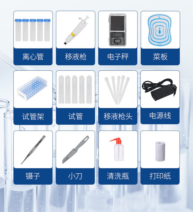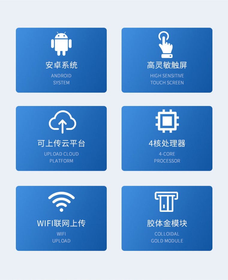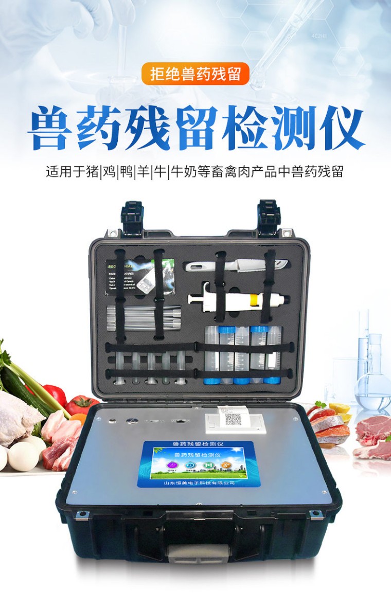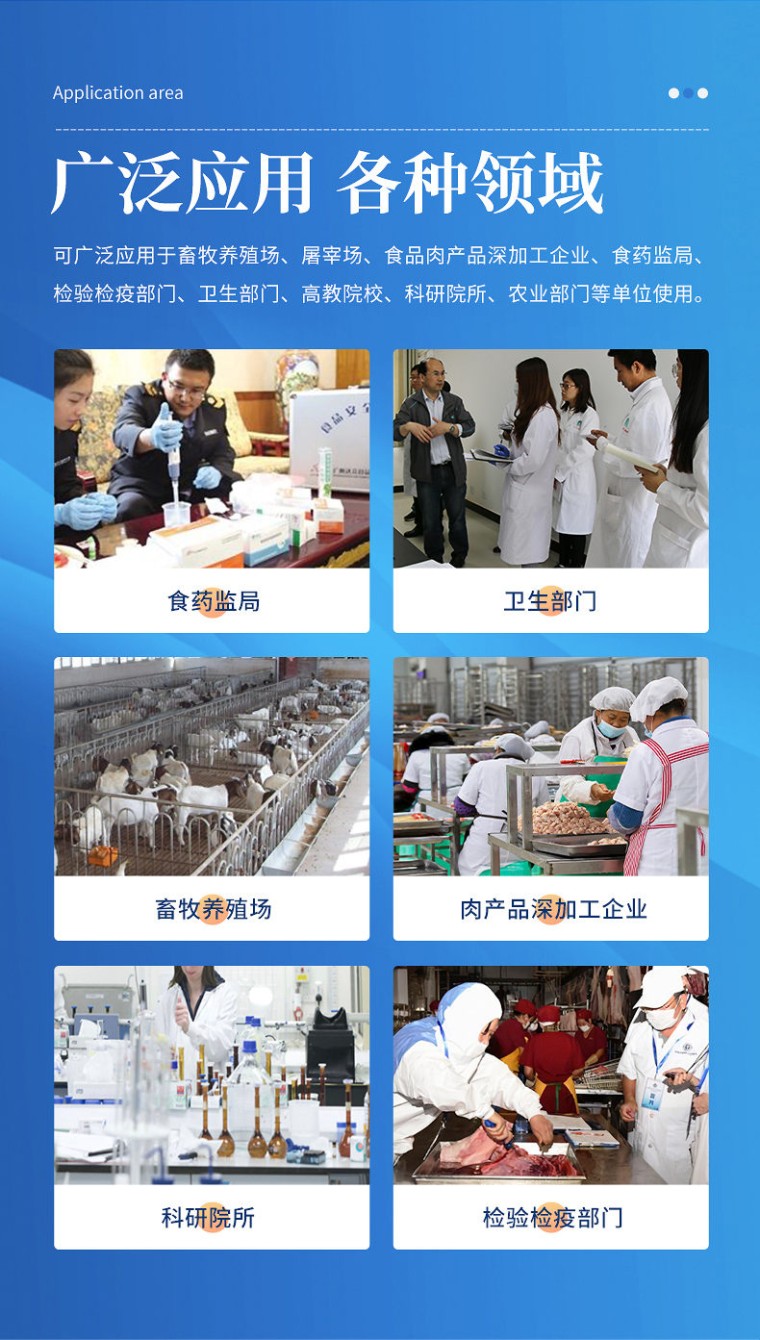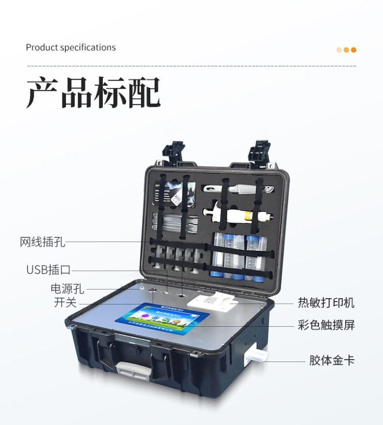 氯霉素检测仪可快速检测肌肉组织(鱼、虾等水产类)中的氯霉素残留,氯霉素快速检测卡整个检测过程只需要30分钟左右, 灵敏度为 0.3 μg/kg (ppb),该设备还可应用于四环素类、硝基呋喃类、磺胺类、沙星类、孔雀石绿等快速检测。 系统配置: 该设备完整配套氮吹仪、离心机、粉碎机、压缩机,系统解决用户操作难问题。 检测原理: 该设备利用抑制免疫层析的原理,样本中的氯霉素在侧向移动的过程中与胶体金标记的特异性单克隆抗体结合,抑制了抗体和NC膜检测线上氯霉素-BSA偶联物的结合,快速判断氯霉素残留。 产品用途: 该设备为集成化食品安全快速检测分析设备,广泛应用于养殖场、屠宰场、食品肉产品深加工企业、检验检疫部门、食药监局、卫生部门、高教院校、科研院所、农业部门等单位使用。 产品性能: 1、安卓智能操作系统,采用更加高效和人性化操作,仪器具有网线连接、wifi联网上传、GPRS无线远传功能,快速上传数据。 2、智能化程度高,仪器具有自检功能:具有开机自检和调零功能,具有自动检测重复性功能。 3、新一代高速热敏打印机,检测完成可自动打印检测报告和二维码。 4、仪器带有监管平台。数据可局域网和互联网数据上传,检测结果直接传至食品安全监管平台。进行区域食品安全监管及大数据分析处理与数据统计,检测区域食品安全长短期动态,达到食品安全问题预估、预警。 6、一体化便携式快检设备,满足现场及流动检测使用需求,能够在同一软件下实现所有检测项目的检测,并可通过同一窗口直观显示检测结果。 7、胶体金模块检测方式:轨道式自动传输扫描,检测完成后自动退出检测卡。 8、CT线自动识别,无需手动调整。 9、仪器具有品类多种类样品菜单库,可灵活选择检测样品,不同的检测通道可同时检测不同的样品项目。 10、样品处理简单省力,整体操作快速、安全、便捷。 11、仪器具有自身保护功能,可设置用户名及密码,防止非工作人员操作等。 12、高灵敏度,高检测精度,高重复性精度,扫描式高精度光学传感器。 13、内置强大的数据库,可在仪器上直接选择样品名称、检测指标、送检单位等信息,也可在仪器上直接编辑录入样品名称、检测指标、送检单位等信息并保存进样品数据库。 14、仪器具有重新校准、锁定、恢复出厂设置功能。 15、支持U盘存储。 结果判定线可修改,对照值标定值可保存,断电不丢失数据。 16、兼容市场上所有的胶体金卡,使用耗材不受限制,极大增强用户使用体验。 主要参数: 1、主控芯片采用ARM Cortex-A7,RK3288/4核处理器,主频1.88Ghz,运转速度更快速,稳定性更强。 2、显示方式:7英寸液晶触摸屏显示,人性化中文操作界面,读数直观、简单。 3、交直流两用,直流12V供电,可连接车载电源,可配6ah大容量充电锂电池,方便户外流动测试。 5、光源亮度自动调节与校准 6、智能恒流稳压,光强自动校准,长时间连续工作光源无温漂现象。 7、内置新国家限量标准,与所测结果进行现场比对,并持续更新标准。 9、不间断进样,连续检测 8、样本编号自动累加。 10、检测项目可扩充。 11、检测结果可批量打印,批量上传。 12、检测结果为Excel表格,连接电脑即可拷贝。 13、检测结果存储容量20万条 14、标准USB接口,免驱动安装。 15、固件可升级