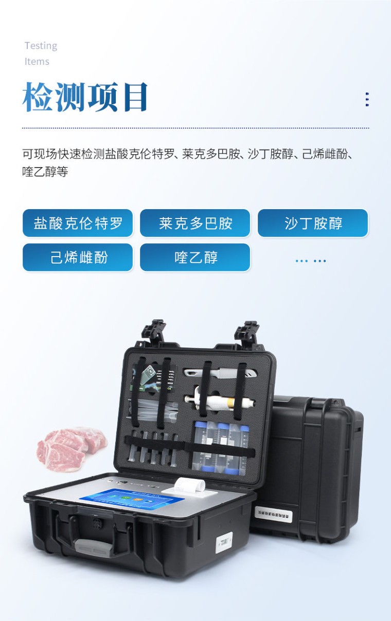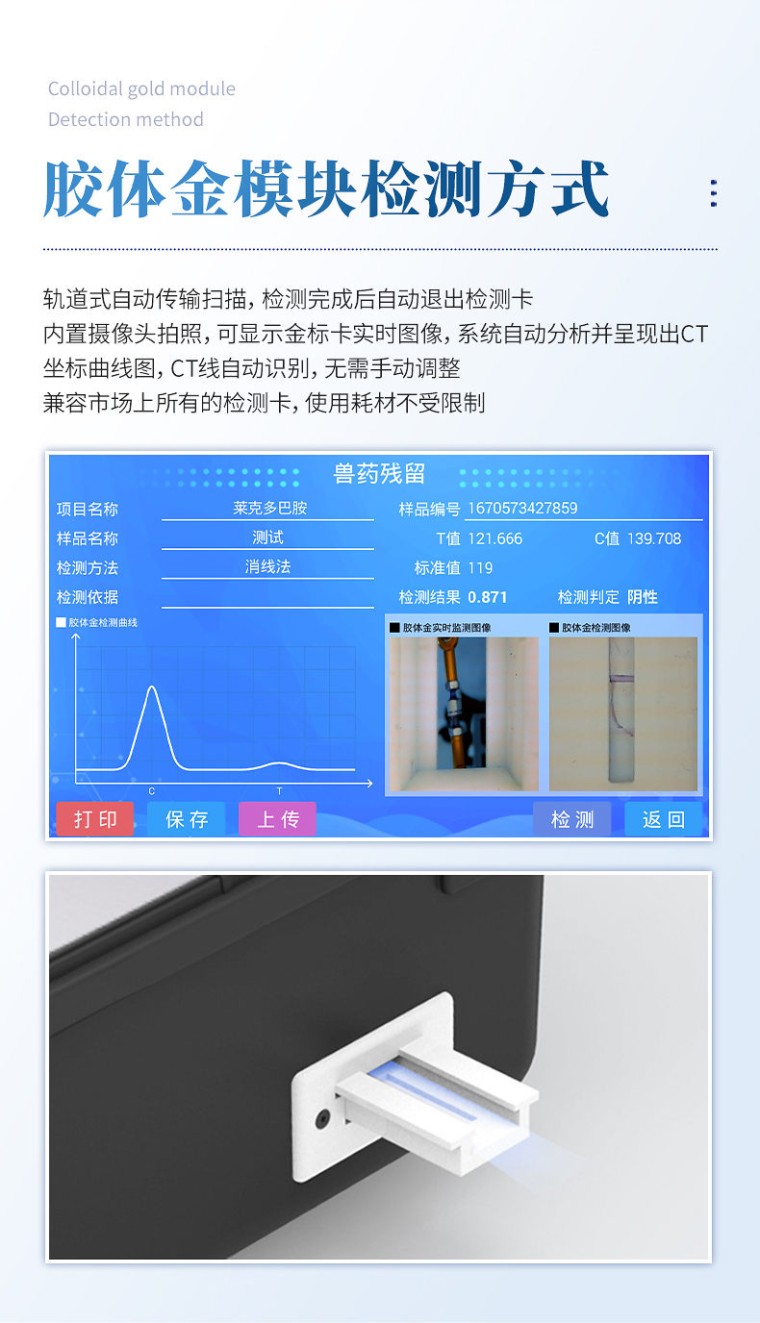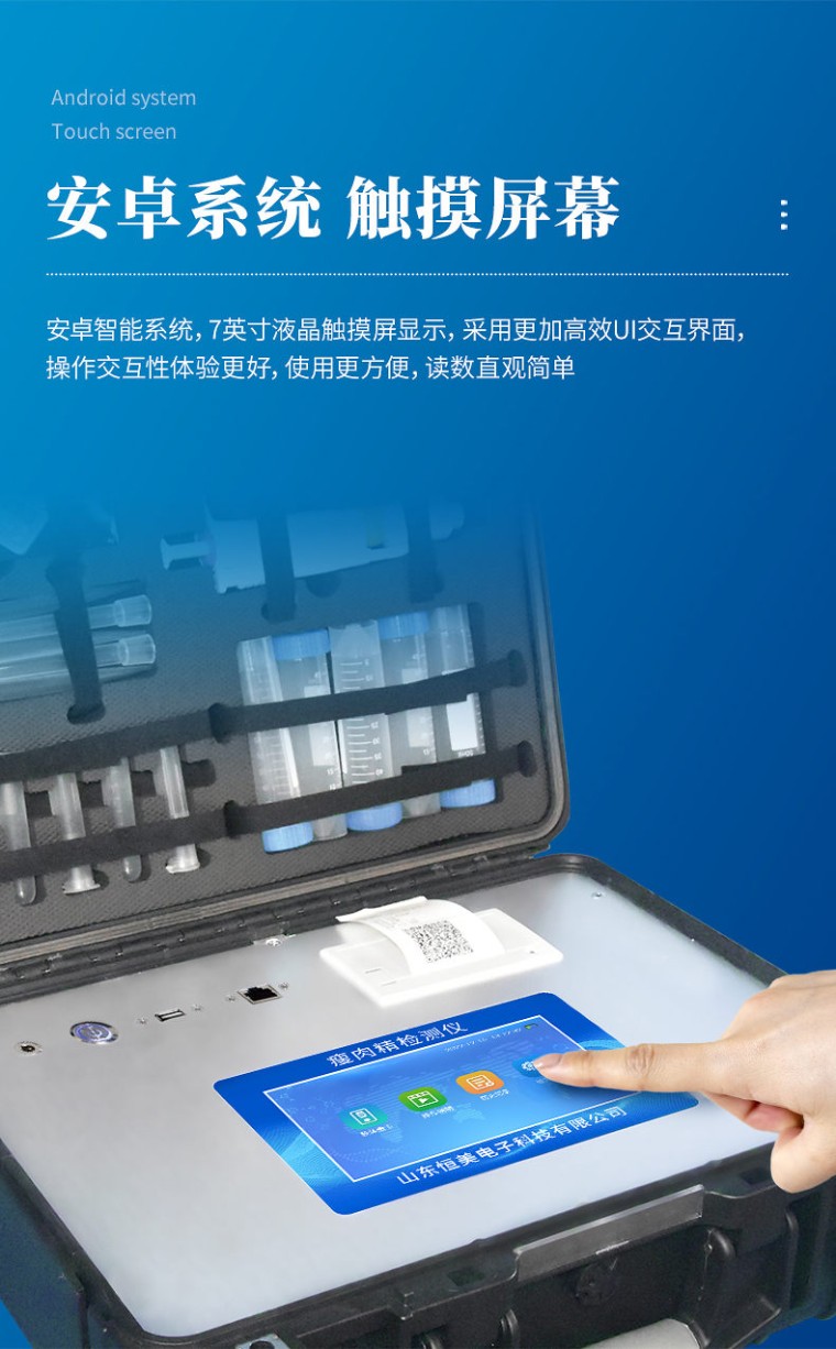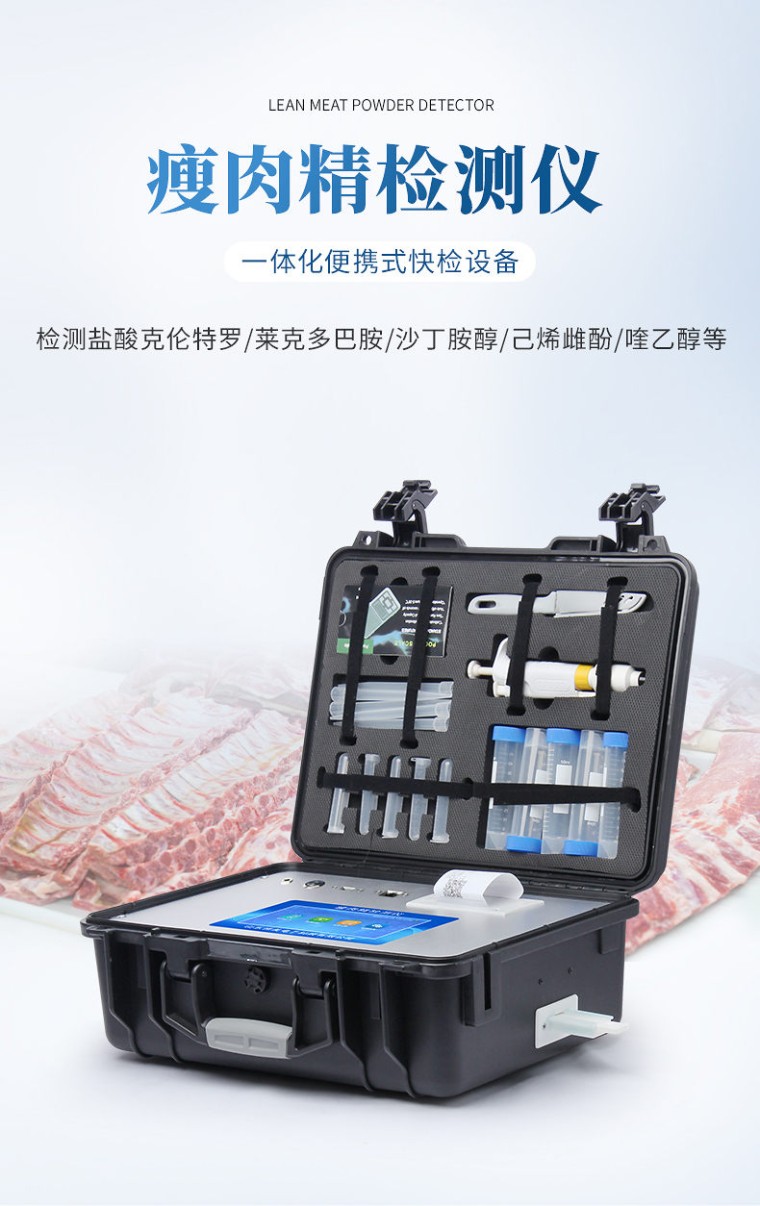产品用途: 该瘦肉精检测仪器广泛应用于食药监局、卫生部门、医学院校、科研院所、农业部门、养殖场、屠宰场、食品肉产品深加工企业、检验检疫部门等单位使用。 应用范围: 瘦肉精检测仪器可现场快速检测盐酸克伦te罗、莱克多巴胺、沙丁胺醇、己烯雌酚、喹乙醇等。仪器预留其他项目检测程序和端口,根据日后需求可方便的自主增加检测项目。日后可升级为检测抗生素、兽药残留、动物疫病、病害肉、的综合类型仪器。 产品性能: 1、安卓智能操作系统,采用更加高效和人性化操作,仪器具有wifi联网上传、4G联网传输、GPRS无线远传、网线连接功能,快速上传数据。 2、智能化程度高,仪器具有自检功能:具有开机自检和调零功能,具有自动检测重复性功能。 3、新一代高速热敏打印机,检测完成可自动打印检测报告和二维码。 4、仪器带有监管平台,数据可局域网和互联网数据上传,检测结果直接传至食品安全监管平台。进行区域食品安全监管及大数据分析处理与数据统计,检测区域食品安全长短期动态,达到食品安全问题预估、预警 5、一体化便携式快检设备,满足现场及流动检测使用需求,能够在同一软件下实现所有检测项目的检测,并可通过同一窗口直观显示检测结果。 6、胶体金模块检测方式:轨道式自动传输扫描,检测完成后自动退出检测卡。 7、仪器内置摄像头拍照,可显示金标卡实时图像,系统自动分析并呈现出CT曲线图,CT线自动识别,无需手动调整。 8、仪器具有品类多种类样品菜单库,可灵活选择检测样品,不同的检测通道可同时检测不同的样品项目。 9、样品处理简单省力,整体操作快速、安全、便捷。 10、高灵敏度,高检测精度,高重复性精度,扫描式高精度光学传感器。 11、内置强大的数据库,可在仪器上直接选择样品名称、检测指标、送检单位等信息,也可在仪器上直接编辑录入样品名称、检测指标、送检单位等信息并保存进样品数据库。 12、仪器具有自身保护功能,可设置用户名及密码,防止非工作人员操作等。 13、仪器具有重新校准、锁定、恢复出厂设置功能。 14、结果判定线可修改,对照值标定值可保存,断电不丢失数据。 15、兼容市场上所有的胶体金卡,使用耗材不受限制,极大增强用户使用体验。 主要参数: 1、主控芯片采用ARM Cortex-A7,RK3288/4核处理器,主频1.88Ghz,运转速度更快速,稳定性更强。 2、显示方式:7英寸液晶触摸屏显示,人性化中文操作界面,读数直观、简单。 3、交直流两用,直流12V供电,可连接车载电源,可配6ah大容量充电锂电池,方便户外流动测试。 4、光源亮度自动调节与校准 5、智能恒流稳压,光强自动校准,长时间连续工作光源无温漂现象。。 6、内置新国家限量标准,与所测结果进行现场比对,并持续更新标准。 7、不间断进样,连续检测 8、样本编号自动累加。 9、检测项目可扩充。 10、检测结果可批量打印,批量上传。 11、检测结果为Excel表格,连接电脑即可拷贝。 12、检测结果存储容量20万条 13、支持U盘存储,标准USB接口,免驱动安装。 14、固件可升级