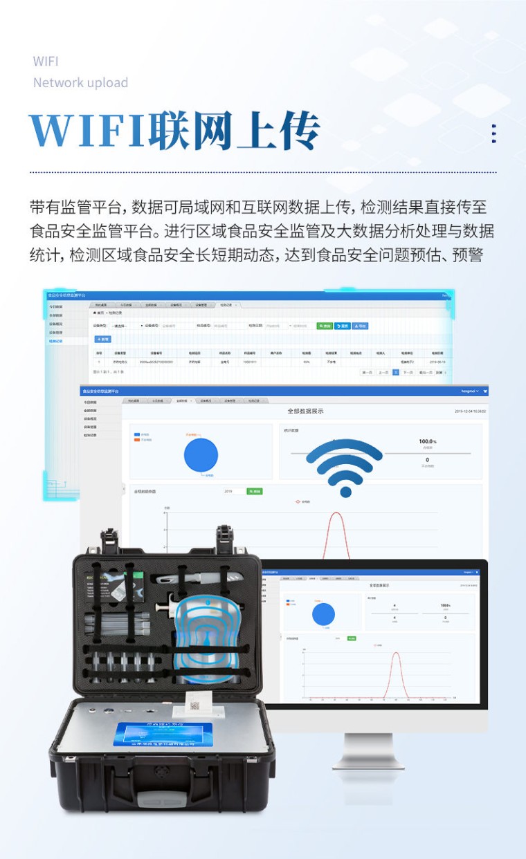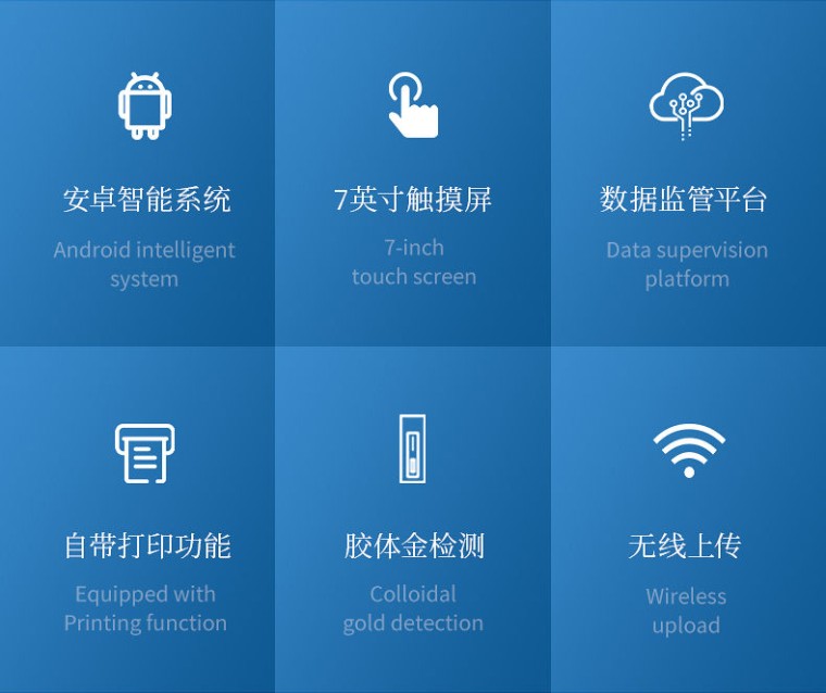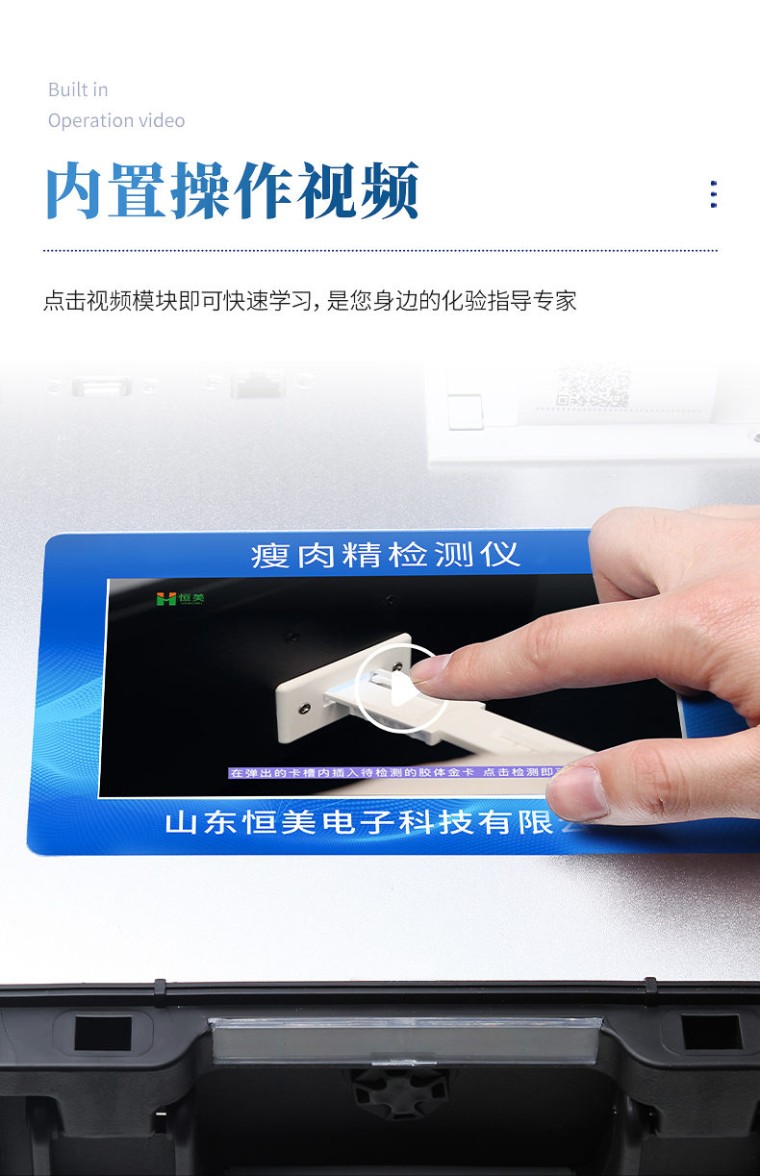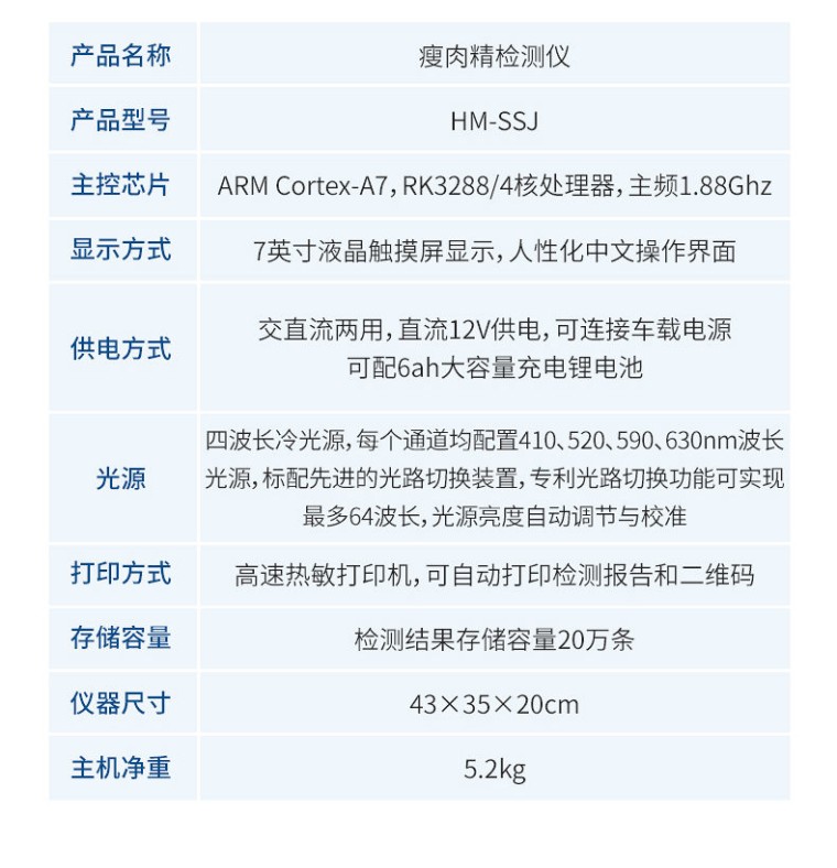 产品用途: 该瘦肉精检测仪器广泛应用于食药监局、卫生部门、医学院校、科研院所、农业部门、养殖场、屠宰场、食品肉产品深加工企业、检验检疫部门等单位使用。 应用范围: 瘦肉精检测仪器可现场快速检测盐酸克伦te罗、莱克多巴胺、沙丁胺醇、己烯雌酚、喹乙醇等。仪器预留其他项目检测程序和端口,根据日后需求可方便的自主增加检测项目。日后可升级为检测抗生素、兽药残留、动物疫病、病害肉、的综合类型仪器。 产品性能: 1、安卓智能操作系统,采用更加高效和人性化操作,仪器具有wifi联网上传、4G联网传输、GPRS无线远传、网线连接功能,快速上传数据。 2、智能化程度高,仪器具有自检功能:具有开机自检和调零功能,具有自动检测重复性功能。 3、新一代高速热敏打印机,检测完成可自动打印检测报告和二维码。 4、仪器带有监管平台,数据可局域网和互联网数据上传,检测结果直接传至食品安全监管平台。进行区域食品安全监管及大数据分析处理与数据统计,检测区域食品安全长短期动态,达到食品安全问题预估、预警 5、一体化便携式快检设备,满足现场及流动检测使用需求,能够在同一软件下实现所有检测项目的检测,并可通过同一窗口直观显示检测结果。 6、胶体金模块检测方式:轨道式自动传输扫描,检测完成后自动退出检测卡。 7、仪器内置摄像头拍照,可显示金标卡实时图像,系统自动分析并呈现出CT曲线图,CT线自动识别,无需手动调整。 8、仪器具有品类多种类样品菜单库,可灵活选择检测样品,不同的检测通道可同时检测不同的样品项目。 9、样品处理简单省力,整体操作快速、安全、便捷。 10、高灵敏度,高检测精度,高重复性精度,扫描式高精度光学传感器。 11、内置强大的数据库,可在仪器上直接选择样品名称、检测指标、送检单位等信息,也可在仪器上直接编辑录入样品名称、检测指标、送检单位等信息并保存进样品数据库。 12、仪器具有自身保护功能,可设置用户名及密码,防止非工作人员操作等。 13、仪器具有重新校准、锁定、恢复出厂设置功能。 14、结果判定线可修改,对照值标定值可保存,断电不丢失数据。 15、兼容市场上所有的胶体金卡,使用耗材不受限制,极大增强用户使用体验。 主要参数: 1、主控芯片采用ARM Cortex-A7,RK3288/4核处理器,主频1.88Ghz,运转速度更快速,稳定性更强。 2、显示方式:7英寸液晶触摸屏显示,人性化中文操作界面,读数直观、简单。 3、交直流两用,直流12V供电,可连接车载电源,可配6ah大容量充电锂电池,方便户外流动测试。 4、光源亮度自动调节与校准 5、智能恒流稳压,光强自动校准,长时间连续工作光源无温漂现象。。 6、内置新国家限量标准,与所测结果进行现场比对,并持续更新标准。 7、不间断进样,连续检测 8、样本编号自动累加。 9、检测项目可扩充。 10、检测结果可批量打印,批量上传。 11、检测结果为Excel表格,连接电脑即可拷贝。 12、检测结果存储容量20万条 13、支持U盘存储,标准USB接口,免驱动安装。 14、固件可升级