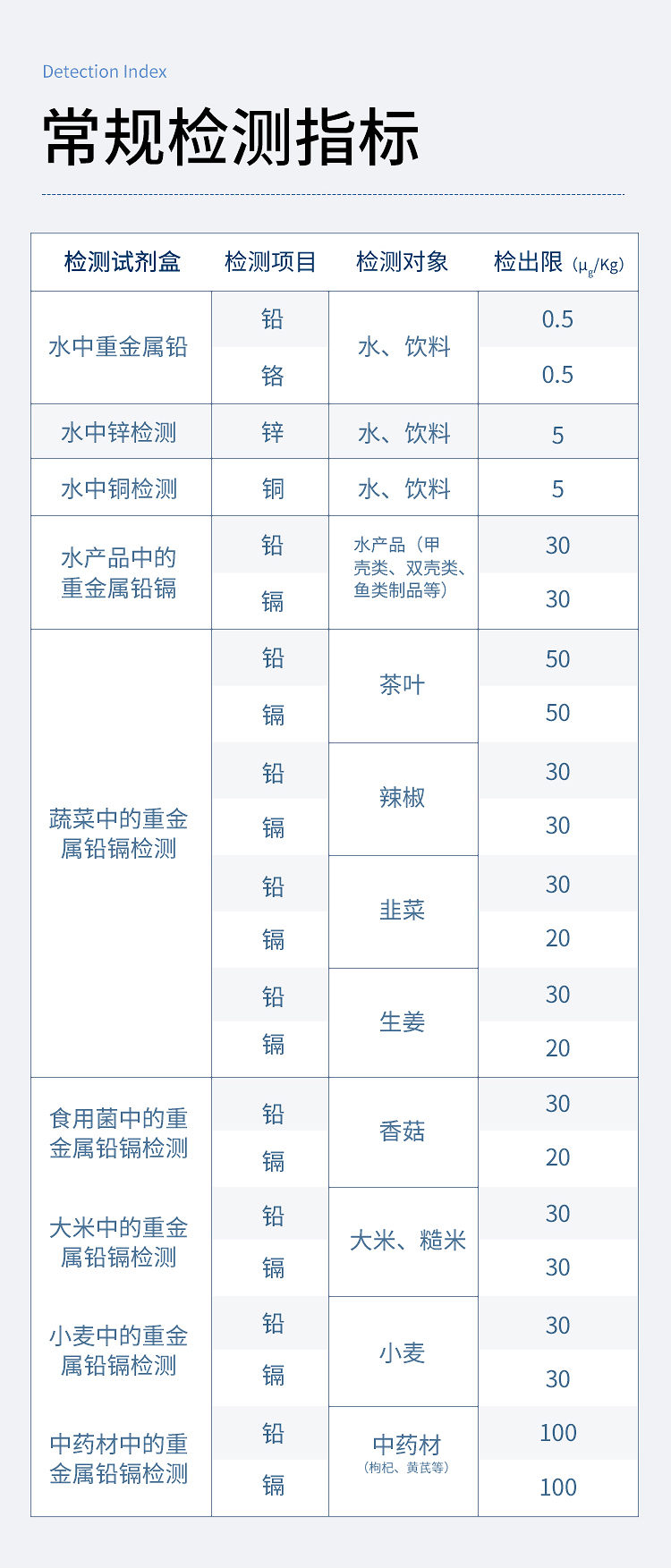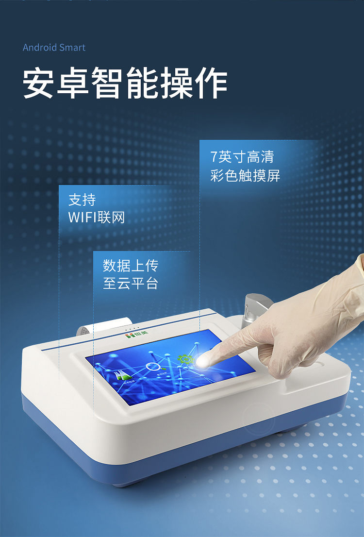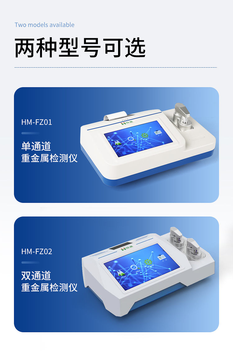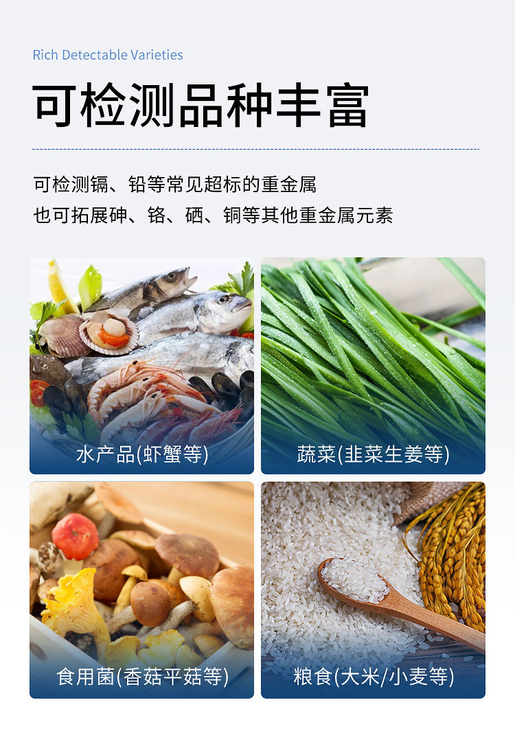 产品简介: HM-FZ01农产品重金属检测仪,使用常温提取方法,无需高温、高压等危险操作,无需过滤等复杂操作,单个样本从前处理到检测出结果时间≤20min。避免传统重金属检测前处理过程中需升温、样品消解、降温、样品罐清洗定容等诸多环节,节省大量时间。 应用领域: 公安食品药品环境犯罪侦查部门,市场监督管理局基层监管站,农业局基层监管站,食品生产企业检测部,食品配送企业检测部。 产品特点: 1、测试结果检出限低、准确度高,满足食品行业检测要求; 2、样品测试速度快,单个样品测试仅需20分钟(含前处理15分钟); 3、便携式设计,携带方便,无需外接电源,可用于食品现场快速检测; 4、操作简便,使用成本低; 5、应用范围广,同时适用于农产品、水产品、加工食品的重金属现场或实验室快速分析。 性能参数: 1、安卓智能操作系统,仪器可通过WiFi联网,将数据上传至云平台; 2、10英寸高清彩色触摸屏,全触屏操作,软件操作界面简单,使用方便; 3、仪器具有自身保护功能,可设置用户名及密码,防止非工作人员操作; 4、仪器内置操作说明书文档和操作视频,使用检测更简单,无需专业培训,适用于非专业人员现场检测; 5、仪器内置国标限量标准文档,可从仪器内打开学习查看; 6、仪器具有数据分析功能,可筛选一定周期内检测数据的合格率,并通过柱状图表示; 7、内置USB接口,可导出表格文档,方便统计分析; 8、仪器内置打印机,可打印检测项目名称、项目类型、检测结果、检测人员、送检单位、送检人员、限量标准等信息; 9、内置锂电池供电,交直流两用,可脱电使用4小时以上,适应便携式收购现场的环境条件并保证测试结果的准确和稳定性; 10、小批量样品前处理时间不超过20分钟,前处理过程不需要强酸和加热消解; 11、测试时间:筛查,单元素≤4分钟;准确定量,单元素≤9分钟。铅、镉可同时检测; 12、仪器使用丝网印刷电极,无需打磨维护等专业复杂前处理过程; 13、仪器工作电压:29V,工作电流:<800mA; 14、整机重量:≤3Kg; 常规检测指标: