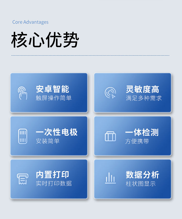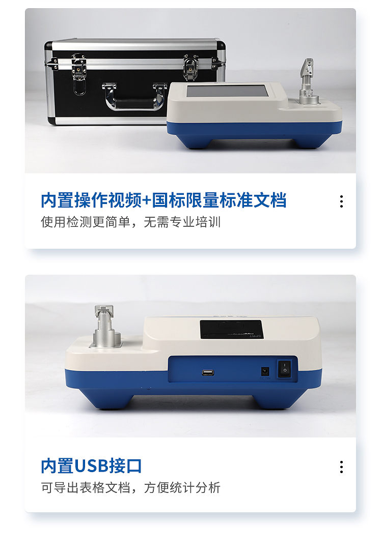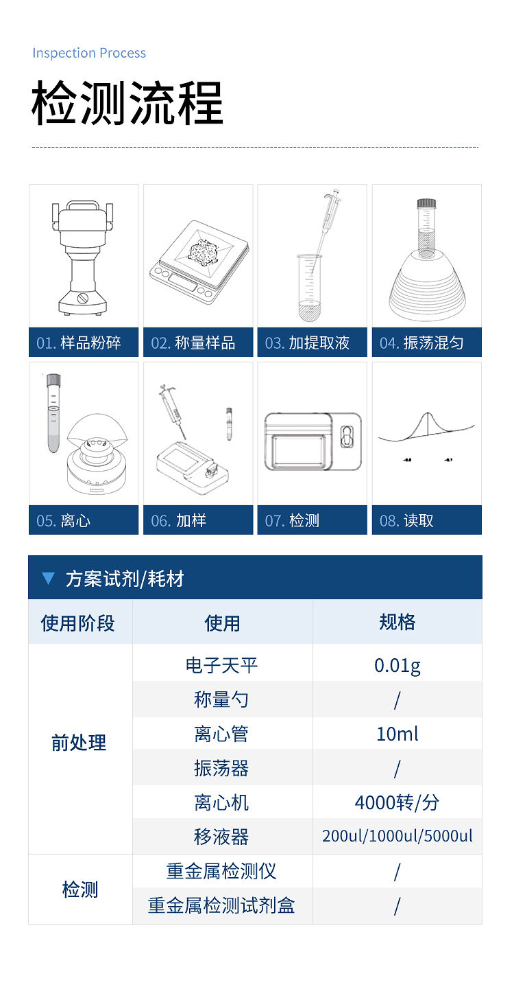 产品简介: HM-FZ01农产品重金属检测仪,使用常温提取方法,无需高温、高压等危险操作,无需过滤等复杂操作,单个样本从前处理到检测出结果时间≤20min。避免传统重金属检测前处理过程中需升温、样品消解、降温、样品罐清洗定容等诸多环节,节省大量时间。 应用领域: 公安食品药品环境犯罪侦查部门,市场监督管理局基层监管站,农业局基层监管站,食品生产企业检测部,食品配送企业检测部。 产品特点: 1、测试结果检出限低、准确度高,满足食品行业检测要求; 2、样品测试速度快,单个样品测试仅需20分钟(含前处理15分钟); 3、便携式设计,携带方便,无需外接电源,可用于食品现场快速检测; 4、操作简便,使用成本低; 5、应用范围广,同时适用于农产品、水产品、加工食品的重金属现场或实验室快速分析。 性能参数: 1、安卓智能操作系统,仪器可通过WiFi联网,将数据上传至云平台; 2、10英寸高清彩色触摸屏,全触屏操作,软件操作界面简单,使用方便; 3、仪器具有自身保护功能,可设置用户名及密码,防止非工作人员操作; 4、仪器内置操作说明书文档和操作视频,使用检测更简单,无需专业培训,适用于非专业人员现场检测; 5、仪器内置国标限量标准文档,可从仪器内打开学习查看; 6、仪器具有数据分析功能,可筛选一定周期内检测数据的合格率,并通过柱状图表示; 7、内置USB接口,可导出表格文档,方便统计分析; 8、仪器内置打印机,可打印检测项目名称、项目类型、检测结果、检测人员、送检单位、送检人员、限量标准等信息; 9、内置锂电池供电,交直流两用,可脱电使用4小时以上,适应便携式收购现场的环境条件并保证测试结果的准确和稳定性; 10、小批量样品前处理时间不超过20分钟,前处理过程不需要强酸和加热消解; 11、测试时间:筛查,单元素≤4分钟;准确定量,单元素≤9分钟。铅、镉可同时检测; 12、仪器使用丝网印刷电极,无需打磨维护等专业复杂前处理过程; 13、仪器工作电压:29V,工作电流:<800mA; 14、整机重量:≤3Kg; 常规检测指标: