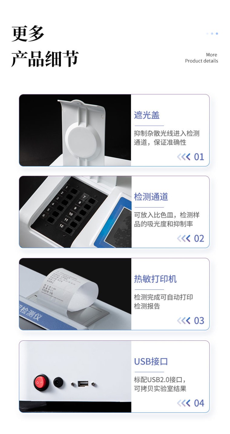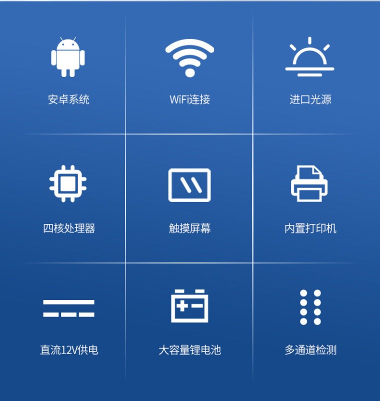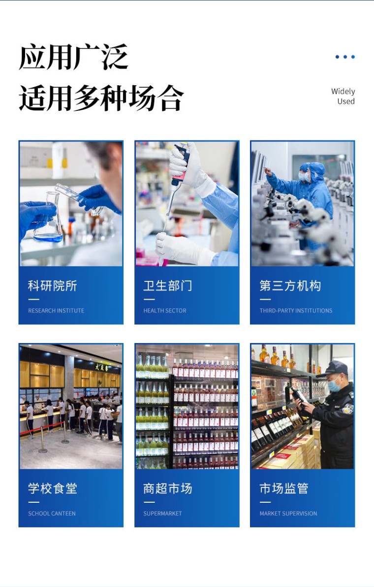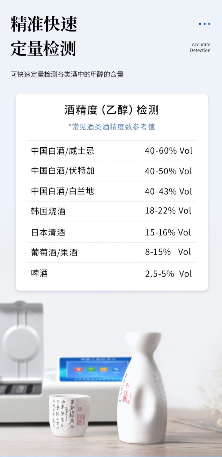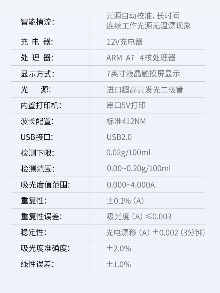 检测项目:可快速定量检测各类酒中的甲醇的含量,仪器预留其他项目检测程序和端口,根据日后需求可方便的自主增加检测项目。日后可升级为检测,水产品,肉制品,面制品的综合类型仪器。 应用范围:用于蒸馏酒、配制酒和发酵酒中甲醇浓度的定量测定。 仪器特点: 1、 检测方法:甲醇检测方法符合《GB/T5009.48 蒸馏酒及配制酒卫生标准的分析方法》 2、 仪器构成:由主机、样品前处理器具和试剂包等构成,适于现场及实验室使用 3、 光路系统:采用进口超高亮发光二极管,光源和检测器采用全固态结构,准确度和精密度高、稳定性强、光源可控;采用光源自动开关节能设计,光源使用寿命达10万小时以上。 4、 内置曲线:仪器具有内置工作曲线,无需配制标准溶液,只需要用配套试剂进行零点校正后,即可实现样品的快速定量测定。 5、 测量方式:样品显色和测量为为标准1cm比色皿,无需转移,提高检测精密度。 6、 耗材配件:提供完备的专用前处理设备和耗材,一站式服务。 7、 专用试剂盒:配备专用的预制试剂,缩短试剂配制时间,操作简单,使用方便。 功能介绍: 1、安卓智能操作系统,采用更加高效和人性化操作,仪器具有网线连接、wifi联网上传、GPRS无线远传功能,快速上传数据。 2、智能化程度高,仪器具有自检功能:具有开机自检和调零功能,具有自动检测重复性功能。 3、检测通道:≥12个检测通道,可以同时测试多个样品,每个样品由程序控制分别独立工作,不会互相干扰。 4、配备新一代嵌入式热敏打印机,可选择手动打印或者自动打印,检测完成可自动打印检测报告和二维码。 5、采用标准USB2.0接口设计,支持U盘存储,免驱动安装,方便数据的存贮和移动,并可随时与计算机直接相连,并且可用计算机控制仪器。实现数据查询、浏览、分析、统计、打印等。 6、仪器带有监管平台。检测结果可直接无线上传。进行数据分析处理,检测酒品等长短期动态,达到问题预估、预警。 7、仪器具有品类多种类样品菜单库,可灵活选择检测样品,不同的检测通道可同时检测不同的样品项目。 8、样品处理简单省力,整体操作快速、安全、便捷。 9、仪器具有自身保护功能,可设置用户名及密码,防止非工作人员操作等。 10、仪器具有重新校准、锁定、恢复出厂设置功能。 主要参数: 1、主控芯片采用ARM Cortex-A7,RK3288/4核处理器,主频1.88Ghz,运转速度更快速,稳定性更强。 2、显示方式:7英寸液晶触摸屏显示,人性化中文操作界面,读数直观、简单。 3、直流12V供电,可连接车载电源,可配6ah大容量充电锂电池,方便户外流动测试。 4、智能恒流稳压,光强自动校准,长时间连续工作光源无温漂现象。 5、不间断进样,连续检测 6、样本编号自动累加。 7、检测项目可扩充。 8、检测结果可批量打印,批量上传。 9、检测结果为Excel表格,连接电脑即可拷贝。 10、可配置大容量锂电池,固件可升级 技术参数: 1、检测下限:0.02 g/100mL 2、检测范围:0.00~0.20 g/100mL 3、吸光度值范围:0.000-4.000A 4、重复性:±0.1%(A) 5、重复性误差:吸光度(A)≤0.003 6、稳定性:光电漂移(A)±0.002(3分钟) 7、吸光度准确度:±2.0% 8、线性误差:±1.0% 9、仪器尺寸:42*31*15cm 10、仪器净重:3.6kg