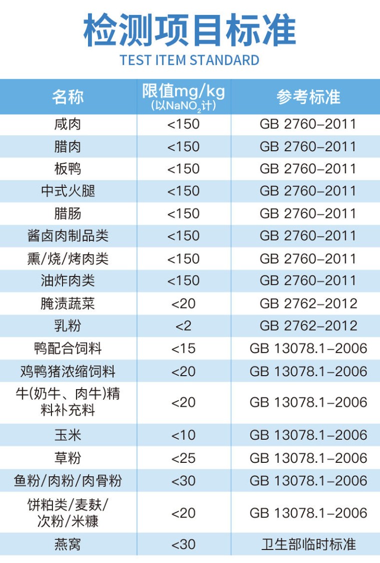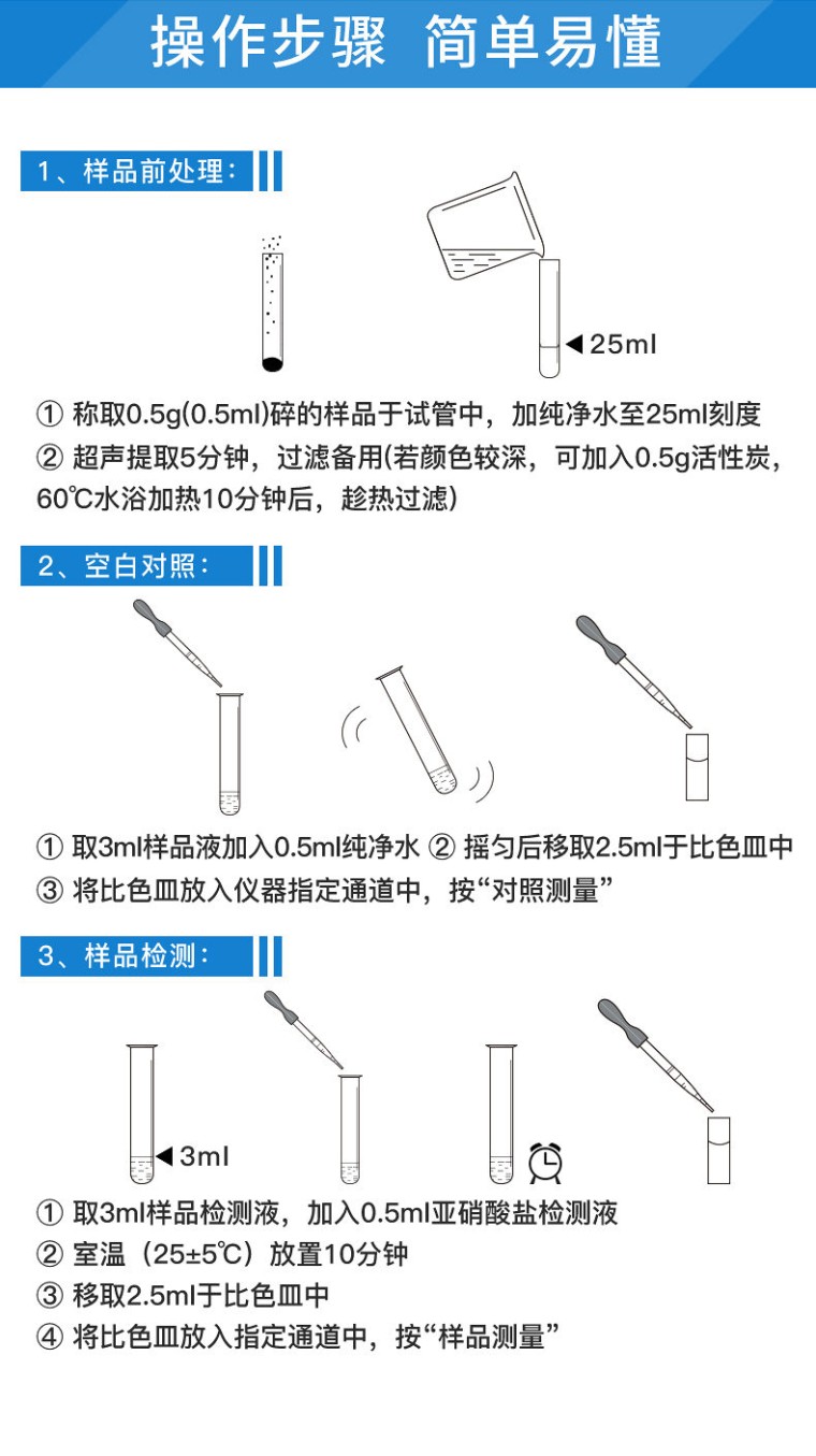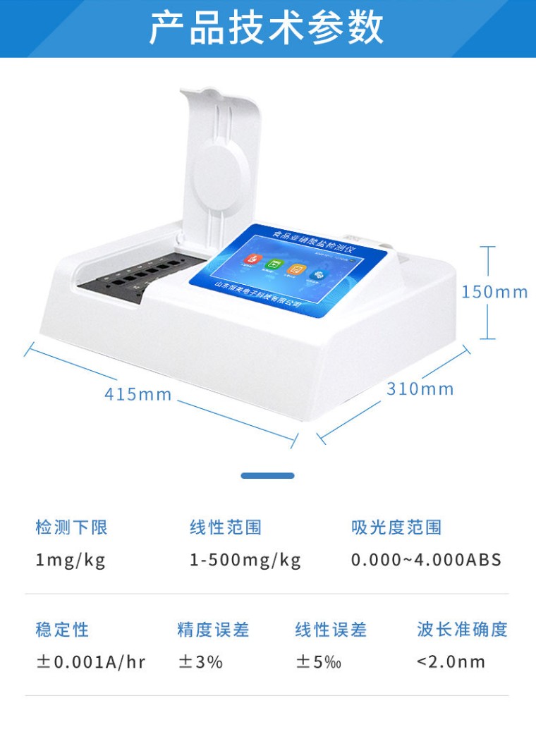HM-Y12亚硝酸盐快速检测仪 仪器简介: HM-Y12食品中亚硝酸盐快速检测仪为集成化食品安全检测分析设备,能够快速检测肉类、肉类罐头、熏肉、香肠、奶制品、泡菜、腌制蔬菜等中的亚硝酸盐含量;该仪器是根据GB5009.33-2010《食品中亚硝酸盐与硝酸盐的测定》,食品中的亚硝酸盐经过提取,与检测试剂反应生成有色化合物,再利用亚硝酸盐检测仪测定其吸光度,在一定范围内吸光度与含量成正比。通过检测可确定食品是否符合国家标准或是否为超标毒害食品等。仪器预留其他项目检测程序和端口,根据日后需求可方便的自主增加检测项目。日后可升级为检测水产品、面制品的综合类型仪器。 仪器应用: 广泛应用于餐饮检测、食药监局、卫生部门、肉制品食品深加工企业、商场超市、质量监督检验、工商管理、油炸食品生产基地、各大食品安全监测系统等单位使用。 功能介绍: 1、安卓智能操作系统,采用更加高效和人性化操作,仪器具有网线连接、wifi联网上传、GPRS无线远传功能,快速上传数据。 2、一体化便携式快检设备,满足现场及流动检测使用需求,能够在同一软件下实现所有检测项目的检测,并可通过同一窗口直观显示检测结果。 3、智能化程度高,仪器具有自检功能:具有开机自检和调零功能,具有自动检测重复性功能。 4、检测通道:≥12个检测通道,可以同时测试多个样品,每个样品由程序控制分别独立工作,不会互相干扰。 5、显示方式:≥7英寸液晶触摸屏显示,人性化中文操作界面,读数直观、简单。 6、配备新一代嵌入式热敏打印机,可选择手动打印或者自动打印,检测完成可自动打印检测报告和二维码。 7、光源采用进口超高亮发光二极管,高精度、稳定性强、光源可控、可以关掉不使用的光源,功耗更低。 8、采用USB2.0接口设计,方便数据的存贮和移动,并可随时与计算机直接相连,并且可用计算机控制仪器。实现数据查询、浏览、分析、统计、打印等。 9、仪器具有品类多种类样品菜单库,可灵活选择检测样品,不同的检测通道可同时检测不同的样品项目。 10、样品处理简单省力,整体操作快速、安全、便捷。 11、仪器具有自身保护功能,可设置用户名及密码,防止非工作人员操作等。 12、高灵敏度,高检测精度,高重复性精度,扫描式高精度光学传感器。 13、仪器具有重新校准、锁定、恢复出厂设置功能。 14、结果判定线可修改,对照值标定值可保存,断电不丢失数据。 主要参数: 1、主控芯片采用ARM Cortex-A7,RK3288/4核处理器,主频1.88Ghz,运转速度更快速,稳定性更强。 2、显示方式:7英寸液晶触摸屏显示,人性化中文操作界面,读数直观、简单。 3、直流12V供电,可连接车载电源,可配6ah大容量充电锂电池,方便户外流动测试。 4、双波长冷光源,每个通道均配置405、528nm波长光源,标配先进的光路切换装置,专利光路切换功能可实现最多64波长,并且所有检测项目可实现所有通道同时检测。 5、光源亮度自动调节与校准 6、智能恒流稳压,光强自动校准,长时间连续工作光源无温漂现象。 7、内置新国家限量标准,与所测结果进行现场比对,并持续更新标准。 8、不间断进样,连续检测 9、样本编号自动累加。 10、检测项目可扩充。 11、检测结果可批量打印,批量上传。 12、检测结果为Excel表格,连接电脑即可拷贝。 13、支持U盘存储,标准USB接口,免驱动安装。 14、可配置大容量锂电池,固件可升级 技术参数: 1、亚硝酸盐检测下限:1mg/kg 2、亚硝酸盐线性范围:1-500mg/kg 3、精度误差:±3% 4、线性误差:±5‰ 5、稳定性:±0.001A/hr 6、波长准确度:<2.0nm 7、吸光度范围:0.000~4.000ABS 操作步骤: 1、样品前处理: ① 称取0.5g(0.5ml)绞碎的样品于试管中,加纯净水至25ml刻度; ② 超声提取5分钟,过滤备用。(若颜色较深,可加入0.5g活性炭,60℃水浴加热10分钟后,趁热过滤) 2、对照样品测试 ① 取3mL样品液,加入0.5mL纯净水; ② 摇匀后,移取2.5ml于比色皿中; ③ 将比色皿放入指定通道中,按“对照测量” 3、样品测试 ① 取3mL样品检测液,加入0.5mL亚硝酸盐检测液; ② 室温(25±5℃)放置10分钟; ③ 移取2.5ml于比色皿中; ④ 将比色皿放入指定通道中,按“样品测量”