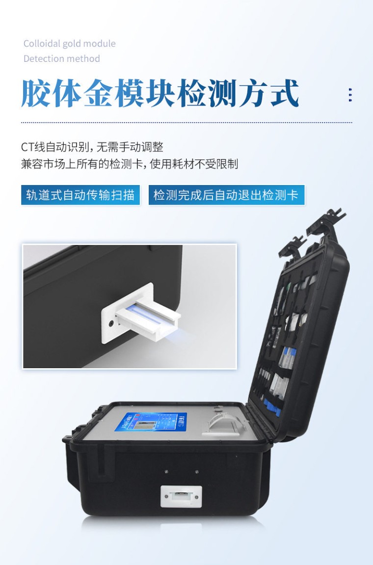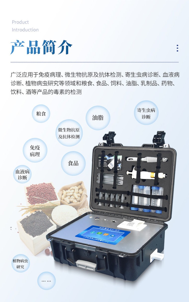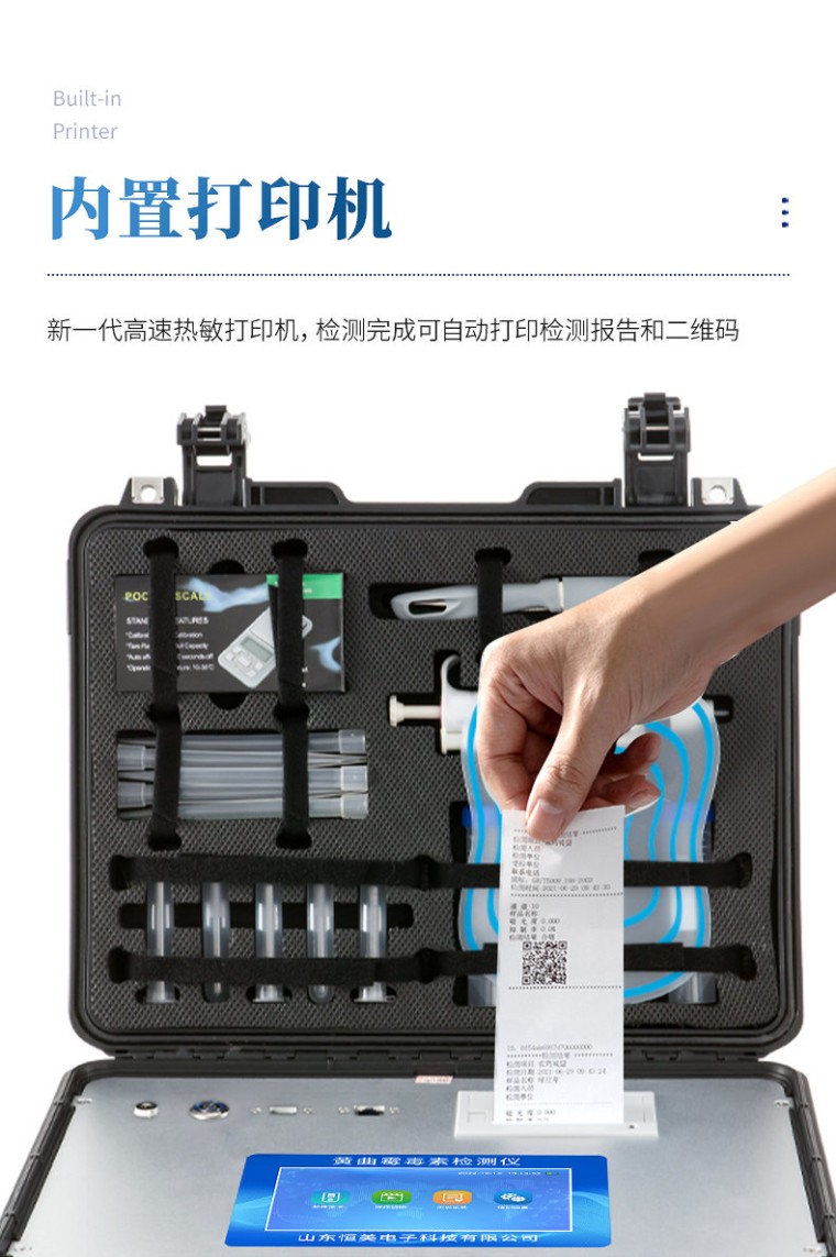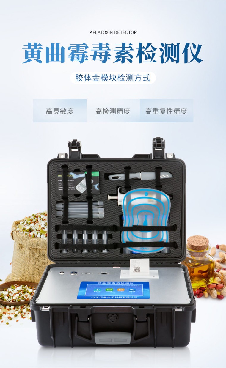 HM-HQM 黄曲霉毒素检测仪 黄曲霉毒素(AFT)是一类化学结构类似的化合物,均为二氢呋喃香豆素的衍生物。黄曲霉毒素是主要由黄曲霉 (aspergillus flavus)寄生曲霉 (a.parasiticus)产生的次生代谢产物,在湿热地区食品和饲料中出现黄曲霉毒素的机率最高。 它们存在于土壤、动植物、各种坚果中,特别是容易污染花生、玉米、稻米、大豆、小麦等粮油产品,是霉菌毒素中毒性最大、对人类健康危害极为突出的一类霉菌毒素,故而相关食品、饲料行业的质检化验部门都会对样品中的黄曲霉毒素进行检验。 产品概述: 我司生产的HM-HQM黄曲霉毒素检测仪广泛应用于免疫病理、微生物抗原及抗体检测、寄生虫病诊断、血液病诊断、植物病虫研究等领域和粮食、食品、饲料、油脂、乳制品、药物、饮料、酒等产品的毒素的检测,该仪器使用简单方便,检测快捷。 产品用途: 该仪器广泛应用于食药监局、卫生监督部门、农业部门、检验检疫部门、食品生产企业等单位部门对食品中的不安全指标进行监测使用。 产品性能: 1、安卓智能操作系统,采用更加高效和人性化操作,仪器具有网线连接、wifi联网上传、GPRS无线远传功能,快速上传数据。 2、智能化程度高,仪器具有自检功能:具有开机自检和调零功能,具有自动检测重复性功能。 3、新一代高速热敏打印机,检测完成可自动打印检测报告和二维码。 4、仪器带有监管平台,数据可局域网和互联网数据上传,检测结果直接传至食品安全监管平台。进行区域食品安全监管及大数据分析处理与数据统计,检测区域食品安全长短期动态,达到食品安全问题预估、预警 5、一体化主机,包含食品安全检测模块、多通道农药残留检测模块、胶体金免疫层析检测模块。 6、一体化便携式快检设备,满足现场及流动检测使用需求,能够在同一软件下实现所有检测项目的检测,并可通过同一窗口直观显示检测结果。 7、胶体金模块检测方式:轨道式自动传输扫描,检测完成后自动退出检测卡。 8、CT线自动识别,无需手动调整。 9、仪器具有品类多种类样品菜单库,可灵活选择检测样品,不同的检测通道可同时检测不同的样品项目。 10、样品处理简单省力,整体操作快速、安全、便捷。 11、仪器具有自身保护功能,可设置用户名及密码,防止非工作人员操作等。 12、高灵敏度,高检测精度,高重复性精度,扫描式高精度光学传感器。 13、内置强大的数据库,可在仪器上直接选择样品名称、检测指标、送检单位等信息,也可在仪器上直接编辑录入样品名称、检测指标、送检单位等信息并保存进样品数据库。 14、仪器具有重新校准、锁定、恢复出厂设置功能。 15、结果判定线可修改,对照值标定值可保存,断电不丢失数据。 16、兼容市场上所有的胶体金卡,使用耗材不受限制,极大增强用户使用体验。 主要参数: 1、主控芯片采用ARM Cortex-A7,RK3288/4核处理器,主频1.88Ghz,运转速度更快速,稳定性更强。 2、显示方式:7英寸液晶触摸屏显示,人性化中文操作界面,读数直观、简单。 3、交直流两用,直流12V供电,可连接车载电源,可配6ah大容量充电锂电池,方便户外流动测试。 4、光源亮度自动调节与校准 5、智能恒流稳压,光强自动校准,长时间连续工作光源无温漂现象。。 6、内置新国家限量标准,与所测结果进行现场比对,并持续更新标准。 7、不间断进样,连续检测 8、样本编号自动累加。 9、检测项目可扩充。 10、检测结果可批量打印,批量上传。 11、检测结果为Excel表格,连接电脑即可拷贝。 12、检测结果存储容量20万条 13、支持U盘存储,标准USB接口,免驱动安装。 14、固件可升级