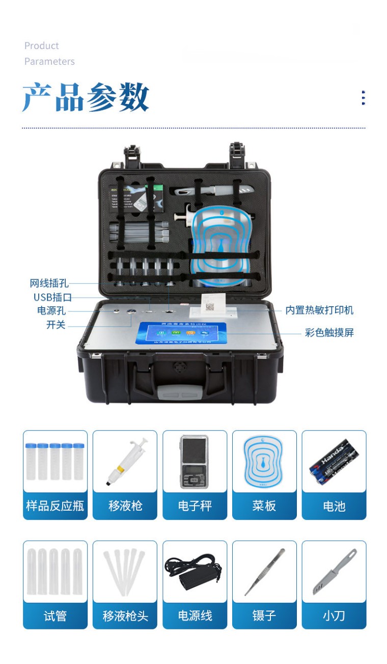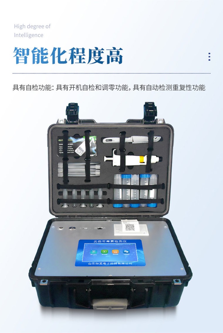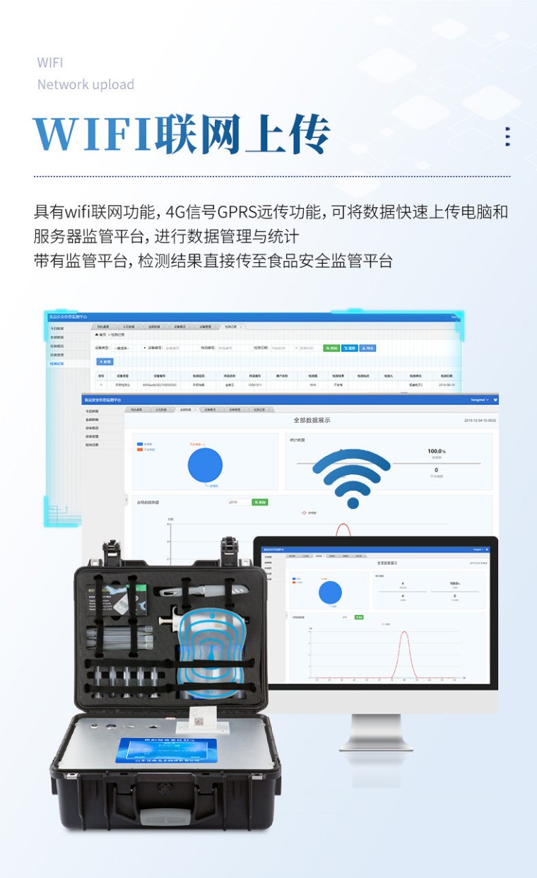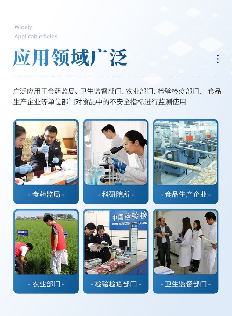 HM-HQM 黄曲霉毒素检测仪 黄曲霉毒素(AFT)是一类化学结构类似的化合物,均为二氢呋喃香豆素的衍生物。黄曲霉毒素是主要由黄曲霉 (aspergillus flavus)寄生曲霉 (a.parasiticus)产生的次生代谢产物,在湿热地区食品和饲料中出现黄曲霉毒素的机率最高。 它们存在于土壤、动植物、各种坚果中,特别是容易污染花生、玉米、稻米、大豆、小麦等粮油产品,是霉菌毒素中毒性最大、对人类健康危害极为突出的一类霉菌毒素,故而相关食品、饲料行业的质检化验部门都会对样品中的黄曲霉毒素进行检验。 产品概述: 我司生产的HM-HQM黄曲霉毒素检测仪广泛应用于免疫病理、微生物抗原及抗体检测、寄生虫病诊断、血液病诊断、植物病虫研究等领域和粮食、食品、饲料、油脂、乳制品、药物、饮料、酒等产品的毒素的检测,该仪器使用简单方便,检测快捷。 产品用途: 该仪器广泛应用于食药监局、卫生监督部门、农业部门、检验检疫部门、食品生产企业等单位部门对食品中的不安全指标进行监测使用。 产品性能: 1、安卓智能操作系统,采用更加高效和人性化操作,仪器具有网线连接、wifi联网上传、GPRS无线远传功能,快速上传数据。 2、智能化程度高,仪器具有自检功能:具有开机自检和调零功能,具有自动检测重复性功能。 3、新一代高速热敏打印机,检测完成可自动打印检测报告和二维码。 4、仪器带有监管平台,数据可局域网和互联网数据上传,检测结果直接传至食品安全监管平台。进行区域食品安全监管及大数据分析处理与数据统计,检测区域食品安全长短期动态,达到食品安全问题预估、预警 5、一体化主机,包含食品安全检测模块、多通道农药残留检测模块、胶体金免疫层析检测模块。 6、一体化便携式快检设备,满足现场及流动检测使用需求,能够在同一软件下实现所有检测项目的检测,并可通过同一窗口直观显示检测结果。 7、胶体金模块检测方式:轨道式自动传输扫描,检测完成后自动退出检测卡。 8、CT线自动识别,无需手动调整。 9、仪器具有品类多种类样品菜单库,可灵活选择检测样品,不同的检测通道可同时检测不同的样品项目。 10、样品处理简单省力,整体操作快速、安全、便捷。 11、仪器具有自身保护功能,可设置用户名及密码,防止非工作人员操作等。 12、高灵敏度,高检测精度,高重复性精度,扫描式高精度光学传感器。 13、内置强大的数据库,可在仪器上直接选择样品名称、检测指标、送检单位等信息,也可在仪器上直接编辑录入样品名称、检测指标、送检单位等信息并保存进样品数据库。 14、仪器具有重新校准、锁定、恢复出厂设置功能。 15、结果判定线可修改,对照值标定值可保存,断电不丢失数据。 16、兼容市场上所有的胶体金卡,使用耗材不受限制,极大增强用户使用体验。 主要参数: 1、主控芯片采用ARM Cortex-A7,RK3288/4核处理器,主频1.88Ghz,运转速度更快速,稳定性更强。 2、显示方式:7英寸液晶触摸屏显示,人性化中文操作界面,读数直观、简单。 3、交直流两用,直流12V供电,可连接车载电源,可配6ah大容量充电锂电池,方便户外流动测试。 4、光源亮度自动调节与校准 5、智能恒流稳压,光强自动校准,长时间连续工作光源无温漂现象。。 6、内置新国家限量标准,与所测结果进行现场比对,并持续更新标准。 7、不间断进样,连续检测 8、样本编号自动累加。 9、检测项目可扩充。 10、检测结果可批量打印,批量上传。 11、检测结果为Excel表格,连接电脑即可拷贝。 12、检测结果存储容量20万条 13、支持U盘存储,标准USB接口,免驱动安装。 14、固件可升级