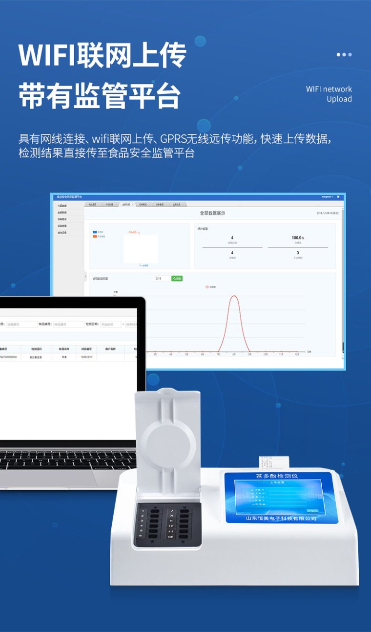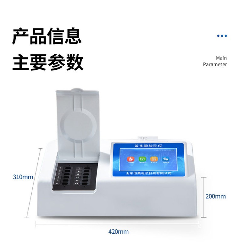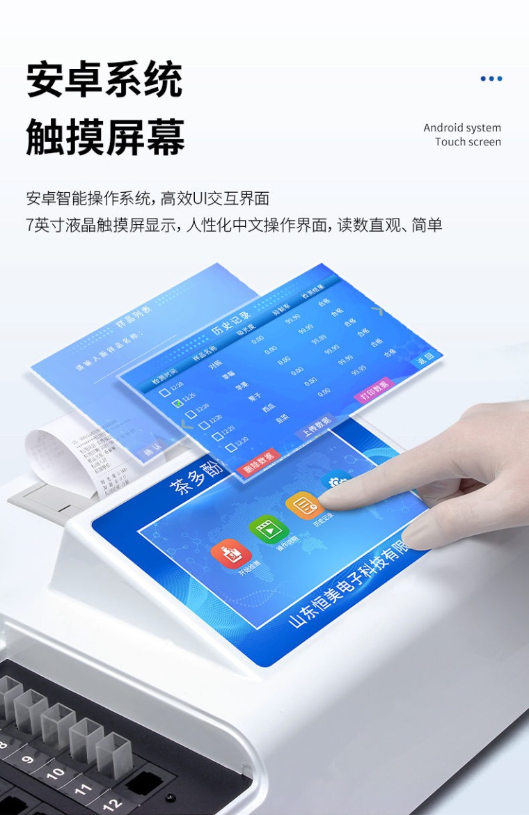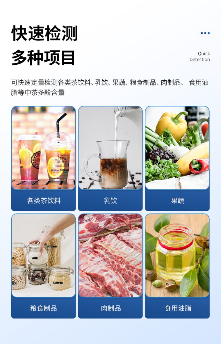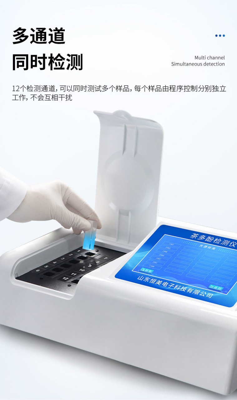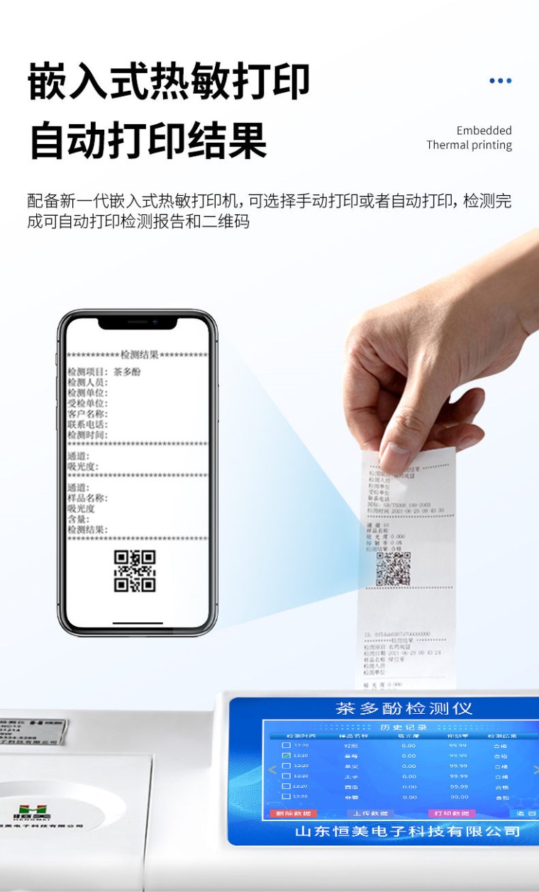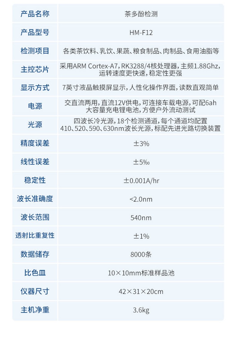 仪器简介: HM-F12茶多酚检测仪可快速定量检测各类茶饮料、乳饮、果蔬、粮食制品、肉制品、食用油脂等中茶多酚含量。茶多酚检测仪可以广泛应用于产品质量监督检验、工商管理、茶叶批发市场、茶叶、深加工基地、饮料企业、超市、商场、各大食品安全监测系统等部门。 功能介绍: 1、安卓智能操作系统,采用更加高效和人性化操作,仪器具有网线连接、wifi联网上传、GPRS无线远传功能,快速上传数据。 2、智能化程度高,仪器具有自检功能:具有开机自检和调零功能,具有自动检测重复性功能。 3、检测通道:≥12个检测通道,可以同时测试多个样品,每个样品由程序控制分别独立工作,不会互相干扰。 4、显示方式:≥7英寸液晶触摸屏显示,人性化中文操作界面,读数直观、简单。 5、配备新一代嵌入式热敏打印机,可选择手动打印或者自动打印,检测完成可自动打印检测报告和二维码。 6、光源采用进口超高亮发光二极管,高精度、稳定性强、光源可控、可以关掉不使用的光源,功耗更低。 7、采用USB2.0接口设计,方便数据的存贮和移动,并可随时与计算机直接相连,并且可用计算机控制仪器。实现数据查询、浏览、分析、统计、打印等。 8、仪器具有品类多种类样品菜单库,可灵活选择检测样品,不同的检测通道可同时检测不同的样品项目。 9、样品处理简单省力,整体操作快速、安全、便捷。 10、高灵敏度,高检测精度,高重复性精度,扫描式高精度光学传感器。 11、仪器具有重新校准、锁定、恢复出厂设置功能。 12、结果判定线可修改,对照值标定值可保存,断电不丢失数据。 主要参数: 1、主控芯片采用ARM Cortex-A7,RK3288/4核处理器,主频1.88Ghz,运转速度更快速,稳定性更强。 2、显示方式:7英寸液晶触摸屏显示,人性化中文操作界面,读数直观、简单。 3、直流12V供电,可配6ah大容量充电锂电池。 4、光源亮度自动调节与校准。 5、智能恒流稳压,光强自动校准,长时间连续工作光源无温漂现象。 6、样本编号自动累加。 7、检测项目可扩充。 8、检测结果可批量打印,批量上传。 9、检测结果为Excel表格,连接电脑即可拷贝。 10、支持U盘存储,标准USB接口,免驱动安装。 11、可配置大容量锂电池,固件可升级 技术参数: 1、精度误差:±3% 2、线性误差:±5‰ 3、稳 定 性: ±0.001A/hr 4、波长准确度:<2.0nm 5、波长范围: 540nm 6、透射比重复性:±1% 7、数据储存80,00条 8、比色皿:10×10mm标准样品池 9、仪器尺寸;42×31×20cm 10、仪器净重:3.6kg
