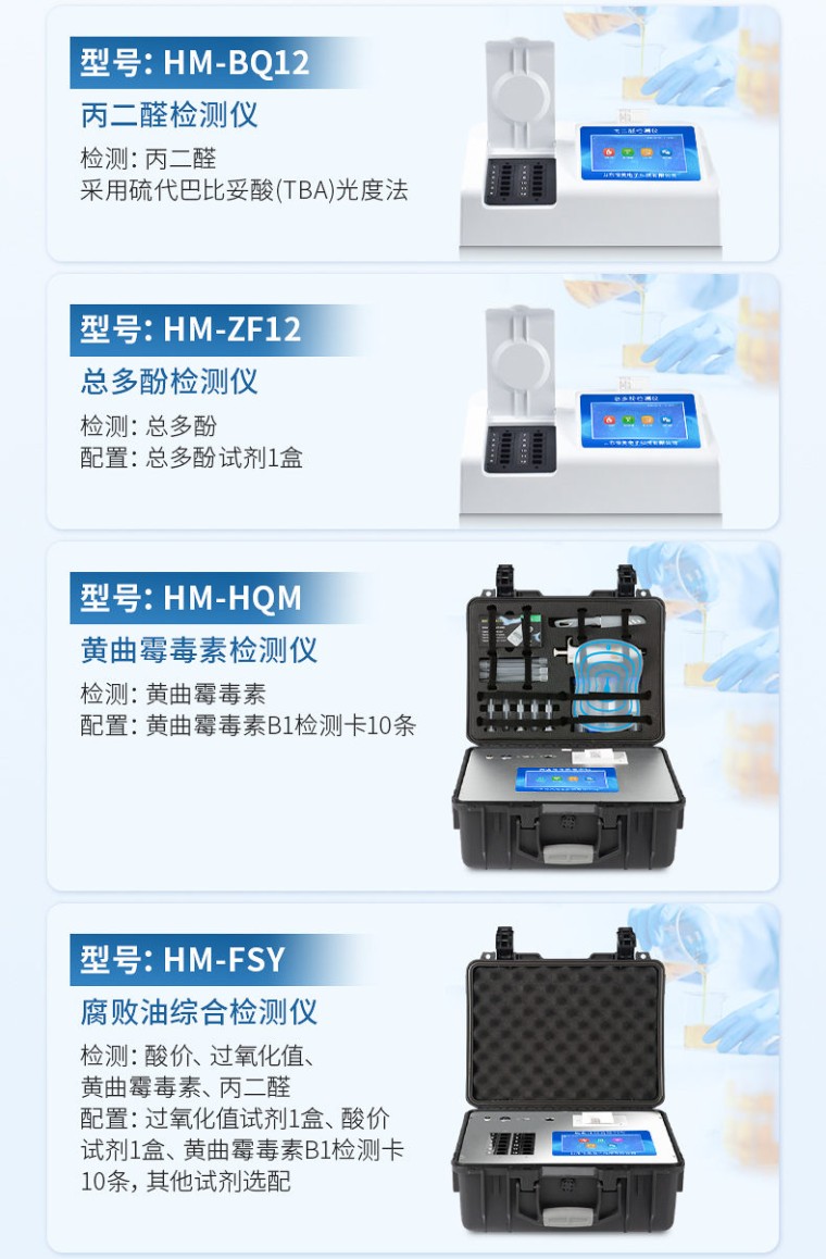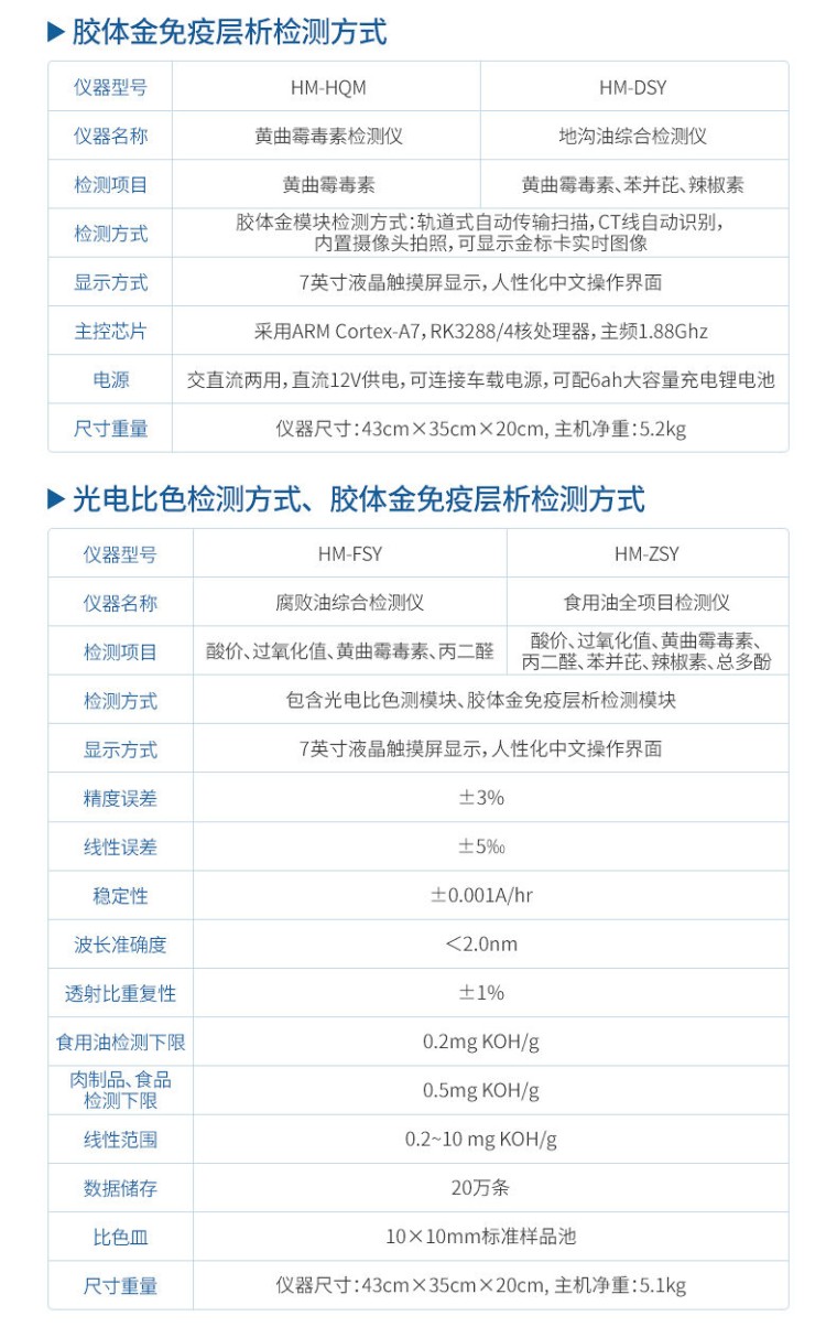 产品用途: 腐败油综合检测检测仪为集成化油品快速检测分析设备,能够快速检测食用植物油、食用猪油、花生油、葵花油、米糠油、食品、肉制品中的酸价、过氧化值、黄曲霉毒素等含量;通过检测可确定植物油是否符合国家标准或是否为酸败油、劣质油、地沟油等。仪器预留其他项目检测程序和端口,根据日后需求可方便的自主增加检测项目。日后可升级为检测水产品、面制品的综合类型仪器。 仪器应用: 广泛应用于质量监督检验、工商管理、油炸食品生产基地、食药监局、卫生部门、肉制品食品深加工企业、农业部门、检验检疫部门、商场超市、各大食品安全监测系统等单位使用。 功能特点: 1、安卓智能操作系统,采用更加高效的UI交互界面,仪器具有wifi联网上传、4G联网传输、GPRS无线远传、网线连接功能,快速批量上传数据。 2、智能化程度高,仪器具有自检功能:具有开机自检和调零功能,具有自动检测重复功能。 3、新一代高速热敏打印机,检测完成可自动打印和批量打印检测报告和二维码。 4、仪器带有监管平台,数据可局域网和互联网数据上传,检测结果直接传至食品安全监管平台。进行区域食品安全监管及大数据分析处理与数据统计,检测区域食品安全长短期动态,达到食品安全问题预估、预警 5、一体化主机,包含光电比色测模块、胶体金免疫层析检测模块。 6、一体化便携式快检设备,满足现场及流动检测使用需求,能够在同一软件下实现所有检测项目的检测,并可通过同一窗口直观显示检测结果。 7、胶体金模块检测方式:轨道式自动传输扫描,检测完成后自动退出检测卡。 8、食品安全检测仪CT线自动识别,无需手动调整,检测完成自动显示CT坐标曲线。 9、内置强大的数据库,具有多品类多种类样品菜单功能,可灵活选择检测样品,不同的检测通道可同时检测不同的样品项目。也可在仪器上直接编辑录入样品名称、检测指标、检测单位等信息并保存进样品数据库。 10、仪器内置操作演示视频,是您身边的化验指导专家。 11、样品处理简单省力,整体操作快速、安全、便捷。 12、仪器具有自身保护功能,可设置用户名及密码,防止非工作人员操作等。 13、高灵敏度,高检测精度,高重复性精度,扫描式高精度光学传感器。 14、结果判定线可修改,对照值标定值可保存,断电不丢失数据。 15、兼容市场上所有的胶体金卡,使用耗材不受限制,极大增强用户使用体验。 16、仪器具有重新校准、锁定、恢复出厂设置功能。 主要参数: 1、主控芯片采用ARM Cortex-A7,RK3288/4核处理器,主频1.88Ghz,运转速度更快速,稳定性更强。 2、显示方式:7英寸液晶触摸屏显示,人性化中文操作界面,读数直观、简单。 3、交直流两用,直流12V供电,可连接车载电源,可配6ah大容量充电锂电池,方便户外流动测试。 4、四波长冷光源,12个检测通道,每个通道均配置410、520、590、630nm波长光源,标配先进的光路切换装置,专业光路切换功能可实现最多64波长,并且所有检测项目可实现所有通道同时检测。 5、智能恒流稳压,光强自动调节与校准,长时间连续工作光源无温漂现象。 6、内置新国家限量标准,与所测结果进行现场比对,并持续更新标准。 7、不间断进样,连续检测 8、样本编号自动累加。 9、数据无线上传平台,并可从平台导出为Excel表格。 10、检测结果存储容量20万条 11、同时支持U盘拷贝,标准USB接口,免驱动插拔。 12、检测项目可扩充,固件可升级 13、仪器尺寸:43×35×19cm, 主机净重:5.1kg 技术参数: ☆精度误差:±3% ☆线性误差:±5‰ ☆稳 定 性: ±0.001A/hr ☆波长准确度:<2.0nm ☆透射比重复性:±1% ☆食用油检测下限:0.2mg KOH/g ☆肉制品、食品检测下限:0.5mg KOH/g ☆线性范围:0.2~10 mg KOH/g ☆数据储存20万条 ☆比色皿:10×10mm标准样品池 ☆外观尺寸:415X310X150(mm)