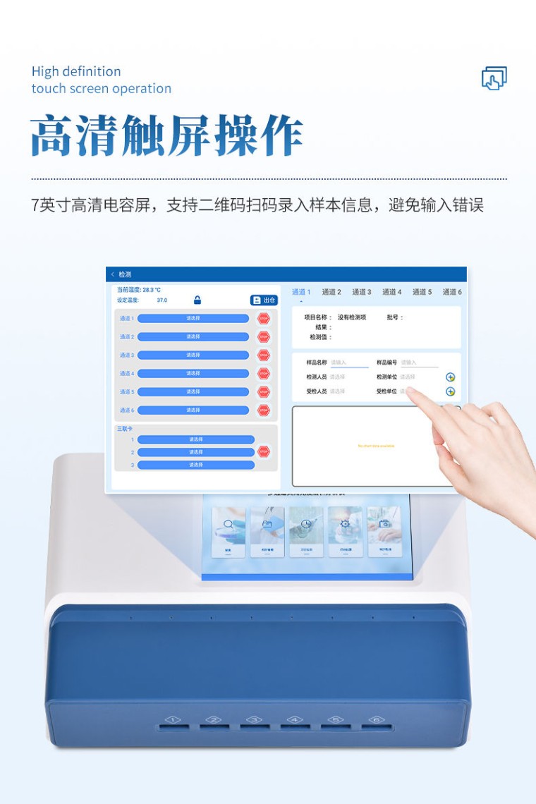 一、产品用途: 兽药残留快速检测仪是指用于检测动物源性食品(如肉类、蛋类、奶类、水产品、蜂蜜等)及其制品中残留的兽药(包括抗生素、激素、驱虫药、镇静剂、β-受体激动剂等)的仪器设备。 仪器对于保障食品安全、保护消费者健康、促进国际贸易以及确保动物源性产品质量至关重要。 主要应用场景:养殖场/屠宰场、食品加工企业、市场监管部门(食药监、农业农村部等)、第三方检测机构、农产品批发市场/超市、科研院所。 二、仪器检测项目: 瘦肉精激素:盐酸克伦te罗、沙丁胺醇、莱克多巴胺、己烯雌酚、喹乙醇等 抗生素残留:四环素类、硝基呋喃类、磺胺类、β-兴奋剂类、沙星类、磺胺类、喹诺酮类,甲砜霉素,氟苯尼考,金刚烷胺、替米考星、庆大霉素、林可霉素、链霉素、恩诺沙星、环丙沙星、头孢啦啶、青霉素、阿莫西林等 水产品安全类:孔雀石绿、氯霉素、呋喃妥因、呋喃西林、呋喃它酮、呋喃唑酮等 蛋类药物残留 氯霉素,四环素,磺胺类,喹诺酮类,呋喃西林,呋喃它酮,呋喃妥因,呋喃唑酮,氟苯尼考,阿莫西林、头孢氨苄、红霉素、链霉素等 动物疫病类:禽流感、新城疫、牛羊口蹄疫、牛羊结核病、牛羊包虫、牛羊布病、小反刍兽、猪蓝耳病毒、猪瘟病毒、猪伪狂犬病毒、猪细小、猪圆环、犬细小病毒、犬瘟热病毒、犬狂犬病毒等 三、产品性能: 1、仪器流线型外观设计,美观大方,结实耐用。 2、大屏幕液晶显示,界面人性化,读数直观。 3、光源采用发光二极管,具有节能、环保、省电、寿命长、响应速度快等优点。 4、超大容量内存,可存储并测量多个检测项目。 5、内部微处理器对电源、线路、光源等进行自诊断。 6、可随时按检测日期、打印、删除存储测量数据。 7、仪器配备2个USB接口,可通过仪器本身进行数据处理和统计分析。 8、监控网络信息功能强大,包括测量数据系统和监控管理系统,实施数集、统计、查询、交换,上传和打印等功能。让管理部门和上下监管可有效实施远程监控管理。 9、内置质控功能,且支持二维码扫描录入样本信息,避免人工错误 10、仪器由开关电源、光路系统、Android系统和样品传输系统组成。 11、形式多样的综合中文报告输出,支持内置热敏打印机。 四、主要参数 1、10.1英寸电容式触摸屏,分辨率:1280 x 800,内部存储:1+8GB 2、操作系统:Android 7.1 3、检测方式:反射式光电检测 4、语言:中/英文 5、存储数量:10万+ 6、准确性:误差值≤ 5% 7、稳定性:SW(波动系数)≤5% 8、重复性:CV(变异系数)≤3% 9、分辨率:0.001 10、★通道:1个单卡卡槽(70mm*20mm*5.6mm);1个二联卡卡槽(70mm*28mm*5.6mm);1个三联卡卡槽(70mm*40mm*5.6mm);1个四联卡卡槽(70mm*50mm*5.6mm) 11、检测时间:< 5秒 (单卡及多联卡);可对样本进行胶体金定性/半定量检测。 12、插卡判断:检测卡未插入检测通道不能检测 13、内置质控功能,可设备送检、设备自检、试剂卡自检 14、检测方式:孵育检测、即时检测(对检测数据复检核实) 15、检测曲线:可以对试剂卡的检测核验,防止误判 16、检测结果:报告出检测项目、被测物质的浓度、检测单位、被检查单位、检验员、检测时间、检测限等信息可在触摸屏上显示,可通过仪器内置打印机输出 17、项目管理:支持检测项目拓展功能 18、界面设置:可修改标题和页尾信息,灵活展示仪器信息 19、打印机:热敏打印机(热敏打印纸:57*30mm) 20、数据传输:WiFi、蓝牙、USB、射频读卡、外置扫码模块(选配) 21、数据处理:可通过通讯端口进行数据汇总、上传监管平台等 22、检测通道孵育检测一体,温度范围 :室温 +5℃ ~ 60℃ 23、接口:USB接口:2个;USB-B接口:1个;LAN接口:1个 ;DC电源接口:5.5/2.1mm 24、电源:输入:AC100V-240V/1.3A 50Hz;输出:DC12V/5A 31、使用环境:温度:0~50℃;湿度:0~90% 25、主机尺寸 :382mm x 300mm x 117mm 26、主机重量:约 3.6kg
