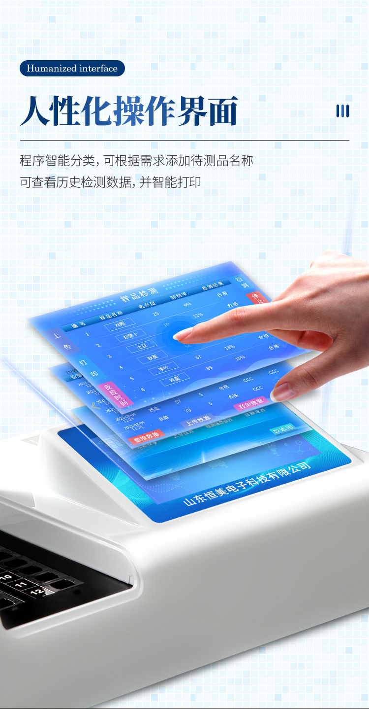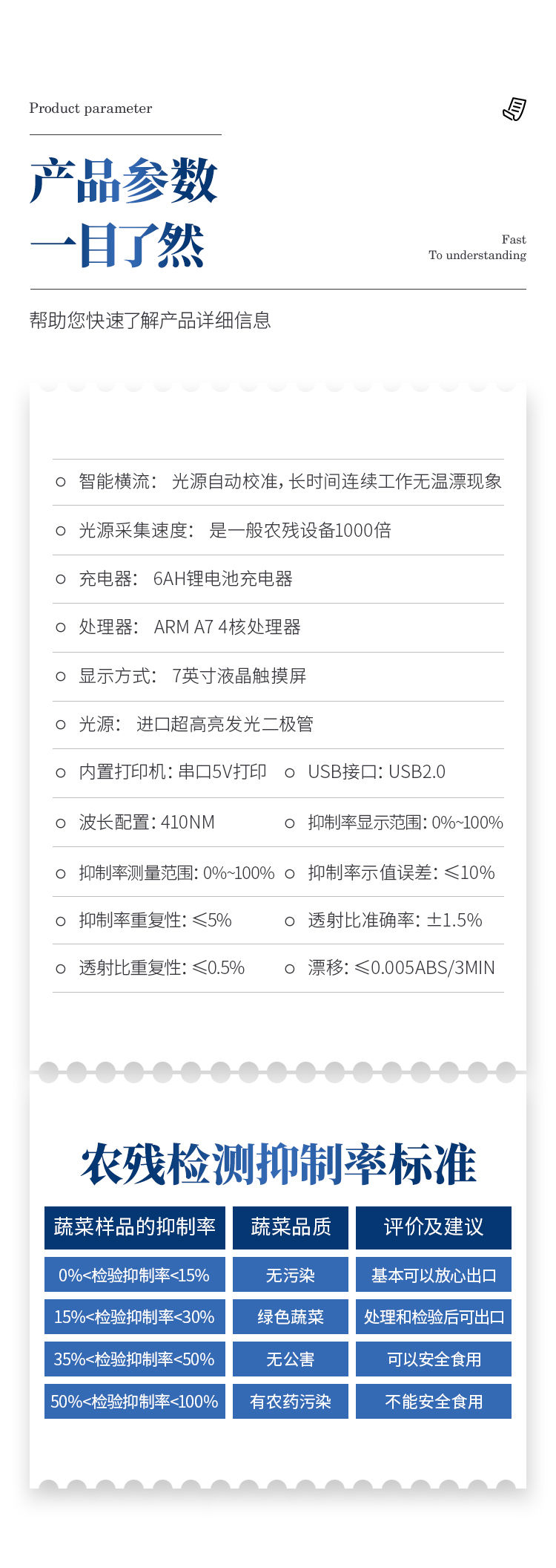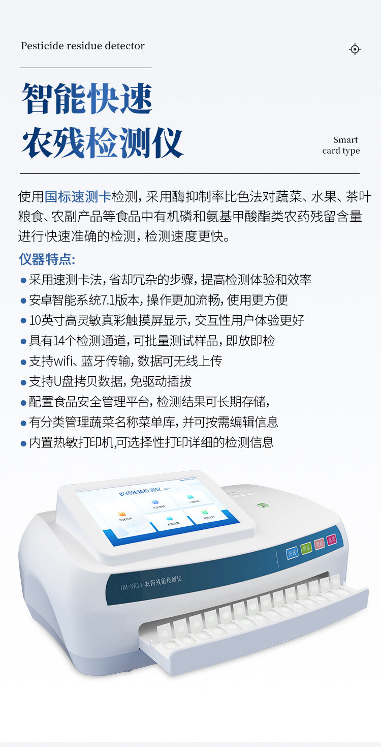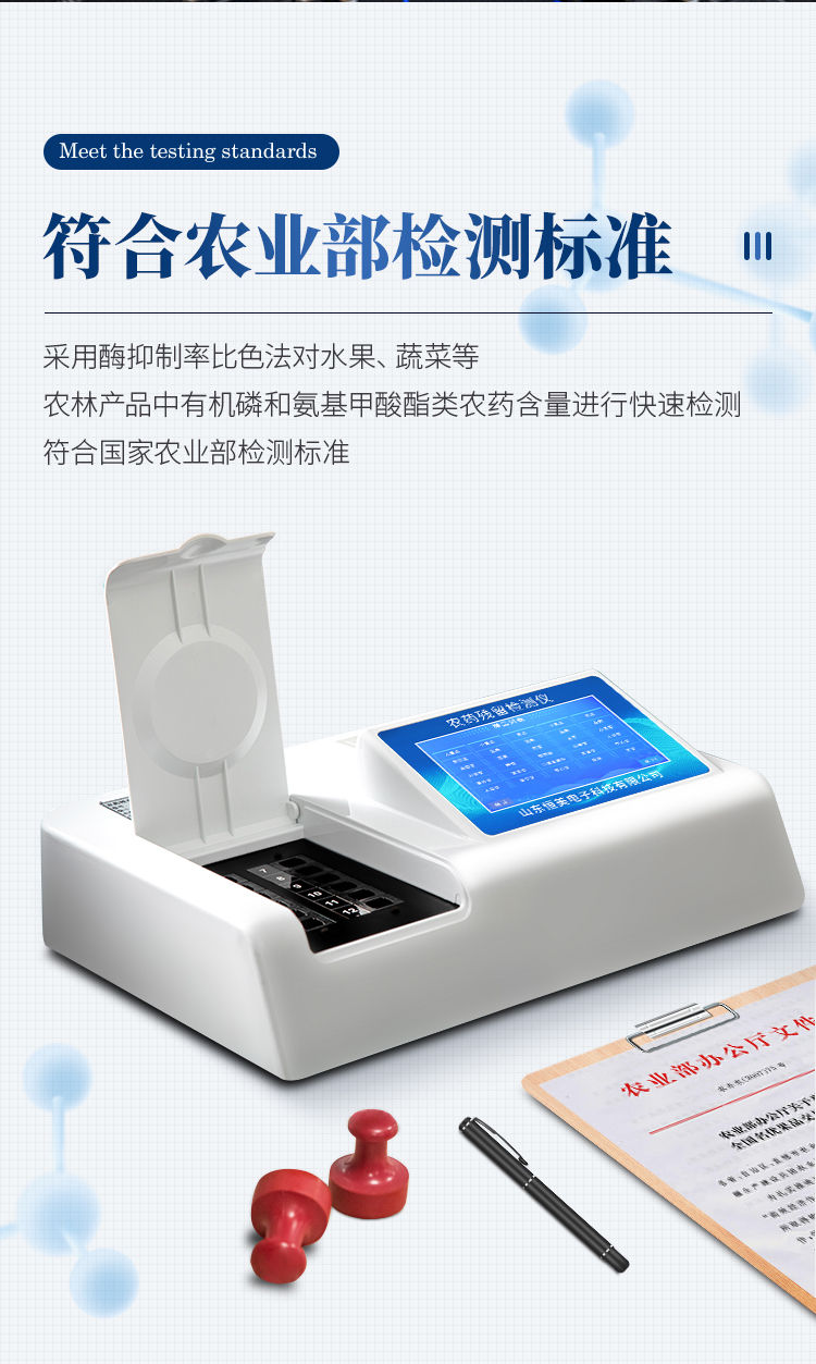 产品简介: 检测标准:依据国家标准方法(GB/T5009.199-2003)以及世界卫生组织WHO、世界粮农组织FAO残留农药检测标准、世界环境保护局EPA参照摄入量等要求来设计。采用酶抑制率比色法对水果、蔬菜等农林产品中有机磷和氨基甲酸酯类农药含量进行快速准确的检测。 农残检测仪器广泛应用于主要用于蔬菜、水果、茶叶、粮食、农副产品等食品中有机磷和氨基甲酸酯类农药残留的快速检测;此外还可用于果蔬茶生产基地和农贸批发销售市场现场检测,餐馆、学校、食堂、家庭果蔬加工前的安全速测等。 功能特点: 1、乙酰胆碱酯酶和丁酰胆碱酯酶试剂均可以使用,符合国家标准和农业部标准的要求。 2、自动判断样品是否合格,检测结果更加直观。 3、仪器具有100多种蔬菜名称菜单库,分类管理,并可按需添加或删除蔬菜名,编辑蔬菜名称,可直接打印出蔬菜名称。 4、检测通道:6个检测通道,可以同时测试多个样品,循环检测,即放即检,每个样品由程序控制分别独立工作,不会互相干扰。 5、智能操作系统,采用更加人性化操作,主控采用多核处理器,主频1.88Ghz,运转速度更快速,稳定性更强。 6、显示方式:7英寸高灵敏真彩触摸屏显示,人性化中文操作界面,读数直观、简单。 7、打印机采用串口5v打印,可选择手动打印或者自动打印,三分钟出打印结果,打印格式为检测人姓名、吸光度差值、检测时间、检测机构、样品名称及结果判定。 8、光源采用进口超高亮发光二极管,具有低功耗、高精度、稳定性强、光源可控可以关掉不使用的光源,响应速度快等优点。 9、智能恒流稳压,光强自动校准,长时间连续工作光源无温漂现象。 10、仪器具有GPRS远传功能,可插手机卡实现数据远传平台,wifi联网功能,可将数据快速上传电脑,进行数据管理与统计。 11、采用USB2.0接口设计,可U盘直接拷贝数据,免驱动插拔,方便数据的存贮和移动,并可随时与计算机直接相连,实现数据查询、浏览、分析、统计、打印等。 12、智能化程度高,仪器具有自检功能:具有开机自检和调零功能,具有自动检测重复性功能 13、仪器具有自身保护功能,可设置用户名及密码,防止非工作人员操作等。 14、采用DC12v直流供电,安全系统更高,并且配备6A锂电池充电器。 15、仪器具有重新校准、锁定、恢复出厂设置功能。 技术参数: *波长配置:412nm; *抑制率显示范围:0%~100%; *抑制率测量范围:0%~100%; *透射比准确度:±1.5%; *透射比重复性:≤0.5%; *漂移:≤0.005Abs/3min; *抑制率示值误差:≤10% *抑制率重复性:≤5% *仪器包装尺寸:510*390*375mm *包装重量:6.7kg 选配功能 1)可加配语音报读功能,人性化指导操作。 3)仪器可实现自身加热功能。 4)可配置大容量锂电池。