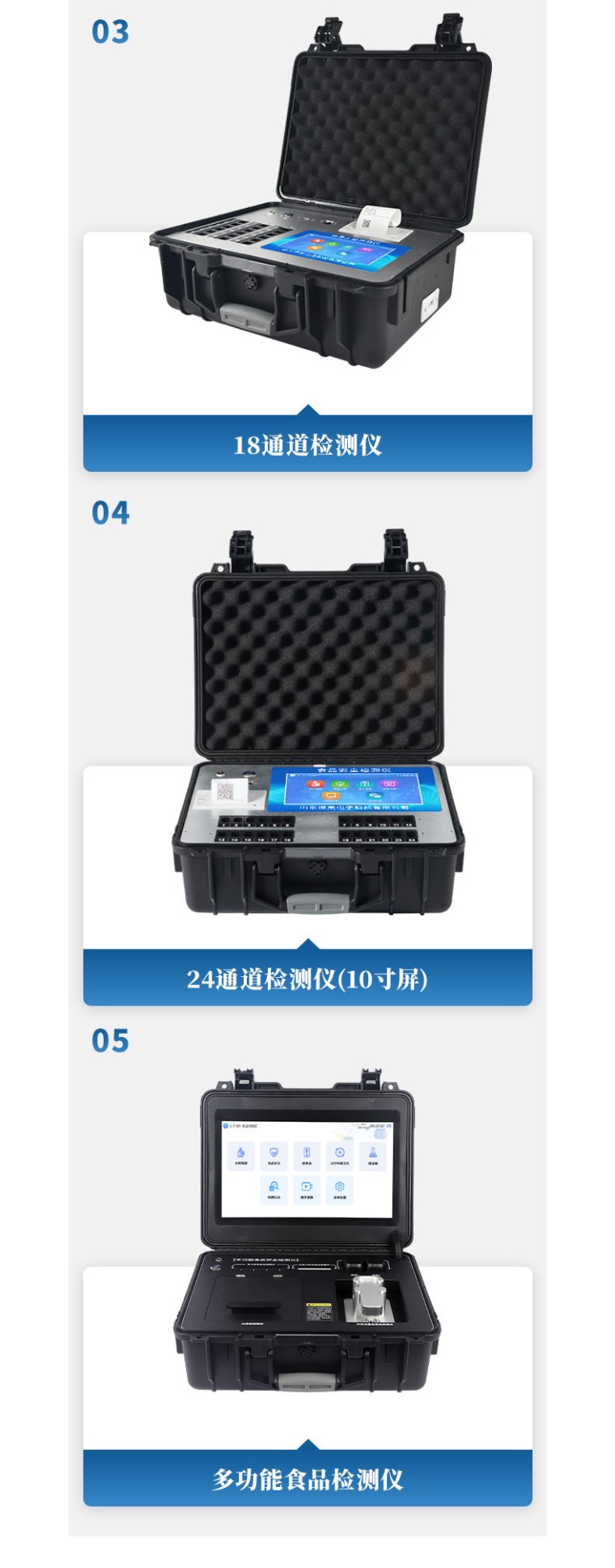 产品介绍: 食品安全检测设备可快速检测200多项目,包含非食用化学物质、滥用食品添加剂、农药残留、兽药残留、重金属、病害肉、营养强化剂、抗生素类残留、激素类残留、真菌毒素类残留、化学类残留等现场的定性定量检测。 集成化食品安全快速检测分析设备,广泛应用于市场监管局、检测中心、卫生监督部门、农业部门、院校及各单位食堂、食品肉产品深加工企业、商超市场、司法部门、餐饮机构、养殖场、屠宰场、检验检疫部门等单位使用。 检测项目: 食品添加剂:二氧化硫、双氧水、亚硝酸盐、硝酸盐、苯甲酸钠、山梨酸、糖精钠、甜蜜素、安赛蜜、硫酸镁等 有毒有害物质:甲醛、吊白块、硼砂、过氧化苯甲酰、工业碱、溴酸钾、罗丹明B、三聚氰胺、苏丹红等 果蔬农药残留:酶抑制率法:有机磷氨基甲酸酯类;胶体金法:各种具体农药检测 病害肉诊断:组胺、挥发性盐基氮、肉制品酸价、水发产品中组胺 重金属含量:铅、镉、铬、汞、砷、锡、镍、铝等; 食用油脂检测:过氧化值、酸价、油脂丙二醛、总多酚等。 瘦肉精激素类(兽药):盐酸克伦te罗、沙丁胺醇、莱克多巴胺、己烯雌酚、喹乙醇等 抗生素残留类(兽药):四环素类、硝基呋喃类、磺胺类、沙星类、喹诺酮类、氟苯尼考、庆大霉素、链霉素、阿莫西林、红霉素等 水产品安全类:孔雀石绿、氯霉素、呋喃妥因代谢、呋喃西林代谢、呋喃它酮代谢、呋喃唑酮代谢、氟苯尼考、土霉素、金霉素、甲砜霉素、地西泮等 真菌毒素类:食用油、粮食及饲料中黄曲霉毒素B1、奶中黄曲霉毒素M1、呕吐毒素、玉米赤霉烯酮、赭曲霉毒素A等 水酒饮品分析:乳品及牛奶中蛋白质;酒中甲醇、乙醇、杂醇油;蜂蜜中果糖和葡萄糖、蔗糖、淀粉酶、酸度;水中氰化物、余氯,饮料中维C等 调味品成分:食醋的总酸、酱油的总酸、芝麻油纯度、谷氨酸钠、酱油氨基酸态氮、食盐中亚铁氰化钾、食盐中碘等 食用色素类:红色色素(胭脂红、苋菜红、赤藓红、诱惑红)、黄色色素(柠檬黄、日落黄)、蓝色色素(亮蓝)等 动物疫病类:猪蓝耳病毒、猪瘟病毒、猪伪狂犬病毒、猪伪狂犬病毒gE蛋白、猪口蹄疫3ABC蛋白、猪口蹄疫病毒IgG、猪细小病毒、鸡禽流感等。 功能特点: 1、安卓智能操作系统,采用更加高效的UI交互界面,仪器具有wifi联网上传、4G联网传输、GPRS无线远传、网线连接功能,快速批量上传数据。 2、智能化程度高,仪器具有自检功能:具有开机自检和调零功能,具有自动检测重复功能。 3、新一代高速热敏打印机,检测完成可自动打印和批量打印检测报告和二维码。 4、仪器带有监管平台,数据可局域网和互联网数据上传,检测结果直接传至食品安全监管平台。进行区域食品安全监管及大数据分析处理与数据统计,检测区域食品安全长短期动态,达到食品安全问题预估、预警 5、一体化主机,包含食品安全检测模块、多通道农药残留检测模块、胶体金免疫层析检测模块。 6、一体化便携式快检设备,满足现场及流动检测使用需求,能够在同一软件下实现所有检测项目的检测,并可通过同一窗口直观显示检测结果。 7、胶体金模块检测方式:轨道式自动传输扫描,检测完成后自动退出检测卡。 8、食品安全检测仪CT线自动识别,无需手动调整,检测完成自动显示CT坐标曲线。 9、内置强大的数据库,具有多品类多种类样品菜单功能,可灵活选择检测样品,不同的检测通道可同时检测不同的样品项目。也可在仪器上直接编辑录入样品名称、检测指标、送检单位等信息并保存进样品数据库。 10、仪器内置操作演示视频,是您身边的化验指导专家。 11、样品处理简单省力,整体操作快速、安全、便捷。 12、仪器具有自身保护功能,可设置用户名及密码,防止非工作人员操作等。 13、高灵敏度,高检测精度,高重复性精度,扫描式高精度光学传感器。 14、结果判定线可修改,对照值标定值可保存,断电不丢失数据。 15、兼容市场上所有的胶体金卡,使用耗材不受限制,极大增强用户使用体验。 16、仪器具有重新校准、锁定、恢复出厂设置功能。 主要参数: 1、主控芯片采用ARM Cortex-A7,RK3288/4核处理器,主频1.88Ghz,运转速度更快速,稳定性更强。 2、显示方式:7英寸液晶触摸屏显示,人性化中文操作界面,读数直观、简单。 3、交直流两用,直流12V供电,可连接车载电源,可配6ah大容量充电锂电池,方便户外流动测试。 4、四波长冷光源,12个检测通道,每个通道均配置410、520、590、630nm波长光源,标配先进的光路切换装置,专业光路切换功能可实现最多64波长,并且所有检测项目可实现所有通道同时检测。 5、智能恒流稳压,光强自动调节与校准,长时间连续工作光源无温漂现象。 6、内置新国家限量标准,与所测结果进行现场比对,并持续更新标准。 7、不间断进样,连续检测 8、样本编号自动累加。 9、数据无线上传平台,并可从平台导出为Excel表格。 10、检测结果存储容量20万条 11、同时支持U盘拷贝,标准USB接口,免驱动插拔。 12、检测项目可扩充,固件可升级 13、仪器尺寸:430*343*188mm, 主机净重:5.1kg 14、仪器包装尺寸:510*390*375mm 包装重量:8.5kg 技术参数: 1、农残 检测范围:抑制率(0~100)% 2、甲醛 检出下限:0.5mg/kg,检测范围:2~26mg/kg 3、亚硝酸盐 检出下限:0.5mg/kg,检测范围:0.5~20mg/kg 4、二氧化硫 检出下限:0.018g/kg,检测范围:0.03~1g/kg 5、吊白块 检出下限:0.2m