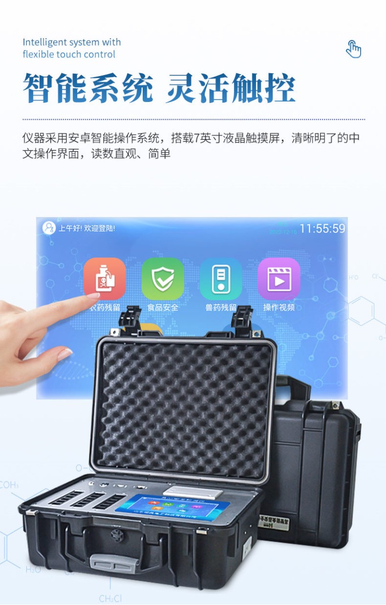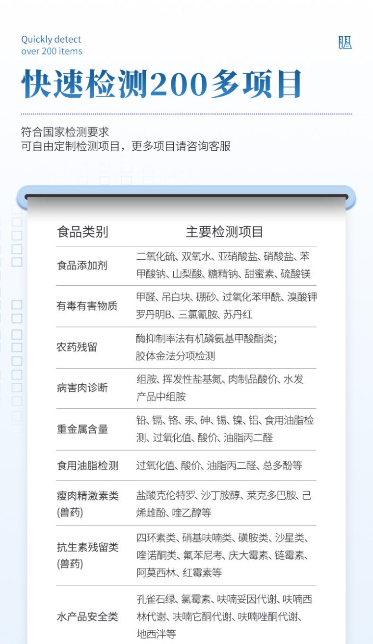 一、产品介绍: 食品安全快速检测仪可快速检测200多项目,包含非食用化学物质、滥用食品添加剂、农药残留、兽药残留、重金属、病害肉、营养强化剂、抗生素类残留、激素类残留、真菌毒素类残留、化学类残留等现场的定性定量检测。 该多功能食品安全检测仪为集成化食品安全快速检测分析设备,广泛应用于市场监管局、检测中心、卫生监督部门、农业部门、院校及各单位食堂、食品肉产品深加工企业、商超市场、司法部门、餐饮机构、养殖场、屠宰场、检验检疫部门等单位使用。 二、检测项目: 食品添加剂:二氧化硫、双氧水、亚硝酸盐、硝酸盐、苯甲酸钠、山梨酸、糖精钠、甜蜜素、安赛蜜、硫酸镁等 有毒有害物质:甲醛、吊白块、硼砂、过氧化苯甲酰、工业碱、溴酸钾、罗丹明B、三聚氰胺、苏丹红等 果蔬农药残留:酶抑制率法有机磷氨基甲酸酯类农药;胶体金法各种具体农药检测 病害肉诊断:组胺、挥发性盐基氮、肉制品酸价、水发产品中组胺 重金属含量:铅、镉、铬、汞、砷、锡、镍、铝等。 食用油脂检测:过氧化值、酸价、油脂丙二醛、总多酚等。 瘦肉精激素类(兽药):盐酸克伦te罗、沙丁胺醇、莱克多巴胺、己烯雌酚、喹乙醇等 抗生素残留类(兽药):四环素类、硝基呋喃类、磺胺类、沙星类、喹诺酮类、氟苯尼考、庆大霉素、链霉素、阿莫西林、红霉素等 水产品安全类:孔雀石绿、氯霉素、呋喃妥因代谢、呋喃西林代谢、呋喃它酮代谢、呋喃唑酮代谢、氟苯尼考、土霉素、金霉素、甲砜霉素、地西泮等 真菌毒素类:食用油、粮食及饲料中黄曲霉毒素B1、奶中黄曲霉毒素M1、呕吐毒素、玉米赤霉烯酮、赭曲霉毒素A等 水酒饮品分析:乳品及牛奶中蛋白质;酒中甲醇、乙醇、杂醇油;蜂蜜中果糖和葡萄糖、蔗糖、淀粉酶、酸度;水中氰化物、余氯,饮料中维C等 调味品成分:食醋的总酸、酱油的总酸、芝麻油纯度、谷氨酸钠、酱油氨基酸态氮、食盐中亚铁氰化钾、食盐中碘等 食用色素类:红色色素(胭脂红、苋菜红、赤藓红、诱惑红)、黄色色素(柠檬黄、日落黄)、蓝色色素(亮蓝)等 动物疫病类:猪蓝耳病毒、猪瘟病毒、猪伪狂犬病毒、猪伪狂犬病毒gE蛋白、猪口蹄疫3ABC蛋白、猪口蹄疫病毒IgG、猪细小病毒、鸡禽流感等 三、功能特点: 1、★安卓智能操作系统,采用更加高效UI交互界面,仪器具有wifi联网上传、4G联网传输、GPRS无线远传、网线连接功能,快速批量上传数据。 2、智能化程度高,仪器具有自检功能:具有开机自检和调零功能,具有自动检测重复性功能。 3、新一代高速热敏打印机,检测完成可自动打印或批量打印检测报告和二维码。 4、★仪器带有监管平台,数据可局域网和互联网数据上传,检测结果直接传至食品安全监管平台。进行区域食品安全监管及大数据分析处理与数据统计,检测区域食品安全长短期动态,达到食品安全问题预估、预警 5、一体化主机,包含食品安全检测模块、多通道农药残留检测模块、胶体金免疫层析检测模块。 6、一体化便携式快检设备,满足现场及流动检测使用需求,能够在同一软件下实现所有检测项目的检测,并可通过同一窗口直观显示检测结果。 7、胶体金模块检测方式:轨道式自动传输扫描,检测完成后自动退出检测卡。 8、★仪器内置摄像头拍照,可显示金标卡实时图像,系统自动分析并呈现出CT坐标曲线图,CT线自动识别,无需手动调整。 9、内置强大的数据库,具有多品类多种类样品菜单功能,可灵活选择检测样品,不同的检测通道可同时检测不同的样品项目。也可在仪器上直接编辑录入样品名称、检测指标、送检单位等信息并保存进样品数据库。 10、★仪器内置操作视频,点击视频模块即可快速学习,是您身边的化验指导专家。 11、样品处理简单省力,整体操作快速、安全、便捷。 12、★仪器可配置身份识别功能,通过密码或刷证件开机,防止非工作人员操作等。 13、高灵敏度,高检测精度,高重复性精度,扫描式高精度光学传感器。 14、仪器具有重新校准、锁定、恢复出厂设置功能。 15、结果判定线可修改,对照值标定值可保存,断电不丢失数据。 16、兼容市场上所有的胶体金卡,使用耗材不受限制,极大增强用户使用体验。 四、主要参数: 1、主控芯片采用ARM Cortex-A7,RK3288/4核处理器,主频1.88Ghz,运转速度更快速,稳定性更强。 2、显示方式:7英寸液晶触摸屏显示,人性化中文操作界面,读数直观、简单。 3、交直流两用,直流12V供电,可连接车载电源,可配6ah大容量充电锂电池,方便户外流动测试。 ★4、四波长冷光源,18个检测通道,每个通道均配置410、520、590、630nm波长光源,标配先进的光路切换装置,专业光路切换功能可实现最多64波长,并且所有检测项目可实现所有通道同时检测。 5、智能恒流稳压,光强自动调节与校准,长时间连续工作光源无温漂现象。 ★6、内置新国家限量标准,与所测结果进行现场比对,并持续更新标准。 7、不间断进样,连续检测 8、样本编号自动累加。 9、数据无线上传平台,并可从平台导出为Excel表格。 10、检测结果存储容量20万条。 ★11、同时支持U盘拷贝,标准USB接口,免驱动插拔。 12、检测项目可扩充,固件可升级 13、仪器尺寸:43×35×19cm, 主机净重:5.2kg 14、仪器包装尺寸:510*390*375mm 包装重量:8.6kg 五、技术参数: 1、农残 检测范围:抑制率(0~100)% 2、甲醛 检出下限:0.5mg/kg,