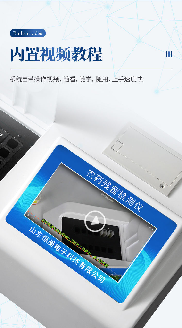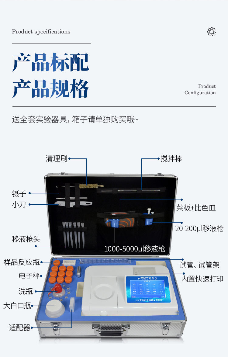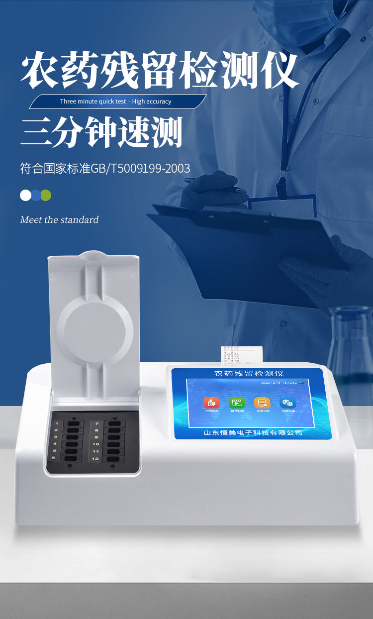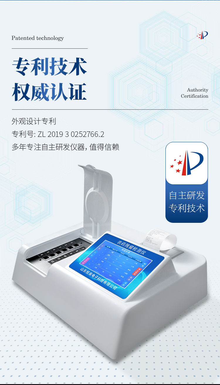 产品简介: 检测标准:依据国家标准方法(GB/T5009.199-2003)以及世界卫生组织WHO、世界粮农组织FAO残留农药检测标准、世界环境保护局EPA参照摄入量等要求来设计。采用酶抑制率比色法对水果、蔬菜等农林产品中有机磷和氨基甲酸酯类农药含量进行快速准确的检测。 广泛应用于主要用于蔬菜、水果、茶叶、粮食、农副产品等食品中有机磷和氨基甲酸酯类农药残留的快速检测;此外还可用于果蔬茶生产基地和农贸批发销售市场现场检测,餐馆、学校、食堂、家庭果蔬加工前的安全速测等。 性能描述: 1、乙酰胆碱酯酶和丁酰胆碱酯酶试剂均可以使用,符合国家标准和农业部标准的要求。 2、自动判断样品是否合格,检测结果更加直观。 3、仪器具有100多种蔬菜名称菜单库,分类管理,并可按需添加或删除蔬菜名,编辑蔬菜名称,可直接打印出蔬菜名称。 4、检测通道:12个检测通道,可以同时测试多个样品,循环检测,即放即检,每个样品由程序控制分别独立工作,不会互相干扰。 5、智能操作系统,采用更加人性化操作,主控采用多核处理器,主频1.88Ghz,运转速度更快速,稳定性更强。 6、显示方式:7英寸高灵敏真彩触摸屏显示,人性化中文操作界面,读数直观、简单。 7、打印机采用串口5v打印,可选择手动打印或者自动打印,三分钟出打印结果,打印格式为检测人姓名、吸光度差值、检测时间、检测机构、样品名称及结果判定。 8、光源采用进口超高亮发光二极管,具有低功耗、高精度、稳定性强、光源可控可以关掉不使用的光源,响应速度快等优点。 9、智能恒流稳压,光强自动校准,长时间连续工作光源无温漂现象。 10、仪器具有GPRS远传功能,可插手机卡实现数据远传平台,wifi联网功能,可将数据快速上传电脑,进行数据管理与统计。 11、采用USB2.0接口设计,方便数据的存贮和移动,并可随时与计算机直接相连,并且可用计算机控制仪器。实现数据查询、浏览、分析、统计、打印等。 12、智能化程度高,仪器具有自检功能:具有开机自检和调零功能,具有自动检测重复性功能 13、仪器具有自身保护功能,可设置用户名及密码,防止非工作人员操作等。 14、采用DC12v直流供电,安全系统更高,并且配备6A锂电池充电器。 15、仪器具有重新校准、锁定、恢复出厂设置功能。 技术参数; *波长配置:412nm; *抑制率显示范围:0%~100%; *抑制率测量范围:0%~100%; *透射比准确度:±1.5%; *透射比重复性:≤0.5%; *漂移:≤0.005Abs/3min; *抑制率示值误差:≤10% *抑制率重复性:≤5% *仪器尺寸;42×31×20cm; *仪器净重:3.6kg; *仪器包装尺寸:510*390*375mm *包装重量:6.8kg 选配功能 1)可加配语音报读功能,人性化指导操作。 3)仪器可实现自身加热功能。 4)可配置大容量锂电池。