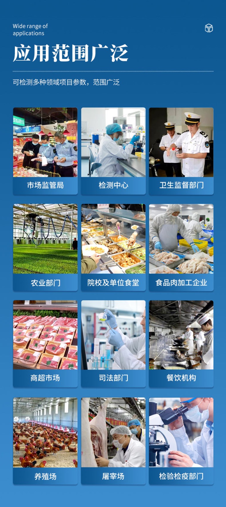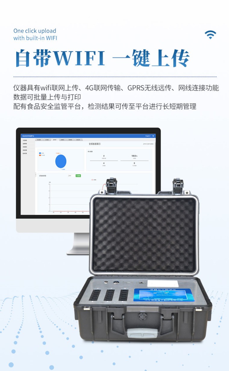 一、产品介绍: 多参数食品安全检测仪可快速检测200多项目,包含非食用化学物质、滥用食品添加剂、农药残留、兽药残留、重金属、病害肉、营养强化剂、抗生素类残留、激素类残留、真菌毒素类残留、化学类残留等现场的定性定量检测。 该多功能食品安全检测仪为集成化食品安全快速检测分析设备,广泛应用于市场监管局、检测中心、卫生监督部门、农业部门、院校及各单位食堂、食品肉产品深加工企业、商超市场、司法部门、餐饮机构、养殖场、屠宰场、检验检疫部门等单位使用。 二、检测项目: 食品添加剂:二氧化硫、双氧水、亚硝酸盐、硝酸盐、苯甲酸钠、山梨酸、糖精钠、甜蜜素、安赛蜜、硫酸镁等 有毒有害物质:甲醛、吊白块、硼砂、过氧化苯甲酰、工业碱、溴酸钾、罗丹明B、三聚氰胺、苏丹红等 果蔬农药残留:酶抑制率法有机磷氨基甲酸酯类农药;胶体金法各种具体农药检测 病害肉诊断:组胺、挥发性盐基氮、肉制品酸价、水发产品中组胺 重金属含量:铅、镉、铬、汞、砷、锡、镍、铝等。 食用油脂检测:过氧化值、酸价、油脂丙二醛、总多酚等。 瘦肉精激素类(兽药):盐酸克伦te罗、沙丁胺醇、莱克多巴胺、己烯雌酚、喹乙醇等 抗生素残留类(兽药):四环素类、硝基呋喃类、磺胺类、沙星类、喹诺酮类、氟苯尼考、庆大霉素、链霉素、阿莫西林、红霉素等 水产品安全类:孔雀石绿、氯霉素、呋喃妥因代谢、呋喃西林代谢、呋喃它酮代谢、呋喃唑酮代谢、氟苯尼考、土霉素、金霉素、甲砜霉素、地西泮等 真菌毒素类:食用油、粮食及饲料中黄曲霉毒素B1、奶中黄曲霉毒素M1、呕吐毒素、玉米赤霉烯酮、赭曲霉毒素A等 水酒饮品分析:乳品及牛奶中蛋白质;酒中甲醇、乙醇、杂醇油;蜂蜜中果糖和葡萄糖、蔗糖、淀粉酶、酸度;水中氰化物、余氯,饮料中维C等 调味品成分:食醋的总酸、酱油的总酸、芝麻油纯度、谷氨酸钠、酱油氨基酸态氮、食盐中亚铁氰化钾、食盐中碘等 食用色素类:红色色素(胭脂红、苋菜红、赤藓红、诱惑红)、黄色色素(柠檬黄、日落黄)、蓝色色素(亮蓝)等 动物疫病类:猪蓝耳病毒、猪瘟病毒、猪伪狂犬病毒、猪伪狂犬病毒gE蛋白、猪口蹄疫3ABC蛋白、猪口蹄疫病毒IgG、猪细小病毒、鸡禽流感等 三、功能特点: 1、★安卓智能操作系统,采用更加高效UI交互界面,仪器具有wifi联网上传、4G联网传输、GPRS无线远传、网线连接功能,快速批量上传数据。 2、智能化程度高,仪器具有自检功能:具有开机自检和调零功能,具有自动检测重复性功能。 3、一体化主机,包含食品安全检测模块、多通道农药残留检测模块、胶体金免疫层析检测模块。 4、一体化便携式快检设备,满足现场及流动检测使用需求,能够在同一软件下实现所有检测项目的检测,并可通过同一窗口直观显示检测结果。 5、★比色池带有控温功能,可以升降温度,优化了前处理过程,并且有效补偿环境影响保证检测结果 6、★仪器带有监管平台,数据可局域网和互联网数据上传,检测结果直接传至食品安全监管平台。进行区域食品安全监管及大数据分析处理与数据统计,检测区域食品安全长短期动态,达到食品安全问题预估、预警 7、胶体金检测模块,轨道式自动传输扫描,检测完成后自动退出检测卡。 8、★仪器内置摄像头拍照,可显示金标卡实时图像,系统自动分析并呈现出CT坐标曲线图,CT线自动识别,无需手动调整。 9、内置强大的数据库,具有多品类多种类样品菜单功能,可灵活选择检测样品,不同的检测通道可同时检测不同的样品项目。也可在仪器上直接编辑录入样品名称、检测指标、送检单位等信息并保存进样品数据库。 10、★仪器内置操作视频,点击视频模块即可快速学习,是您身边的化验指导专家。 11、样品处理简单省力,整体操作快速、安全、便捷。 12、★仪器可配置身份识别功能,通过密码或刷证件开机,防止非工作人员操作等。 13、新一代高速热敏打印机,检测完成可自动打印或批量打印检测报告和二维码。 14、高灵敏度,高检测精度,高重复性精度,扫描式高精度光学传感器。 15、仪器具有重新校准、锁定、恢复出厂设置功能。 16、结果判定线可修改,对照值标定值可保存,断电不丢失数据。 17、兼容市场上所有的胶体金卡,使用耗材不受限制,极大增强用户使用体验。 四、主要参数: 1、主控芯片采用ARM Cortex-A7,RK3288/4核处理器,主频1.88Ghz,运转速度更快速,稳定性更强。 2、★显示方式:10英寸液晶触摸屏显示,人性化中文操作界面,读数直观、简单。 3、交直流两用,直流12V供电,可连接车载电源,可配6ah大容量充电锂电池,方便户外流动测试。 4、★四波长冷光源,24个检测通道,每个通道均配置410、520、590、630nm波长光源,标配先进的光路切换装置,专业光路切换功能可实现最多64波长,并且所有检测项目可实现所有通道同时检测。 5、智能恒流稳压,光强自动调节与校准,长时间连续工作光源无温漂现象。 6、★内置新国家限量标准,与所测结果进行现场比对,并持续更新标准。 7、不间断进样,连续检测 8、样本编号自动累加。 9、检测结果为Excel表格,连接电脑即可拷贝。 10、检测结果存储容量20万条 11、★同时支持U盘拷贝,标准USB接口,免驱动插拔。 12、检测项目可扩充,固件可升级 13、仪器尺寸:43×35×19cm, 主机净重:5.1kg 14、仪器包装尺寸:510*390*37