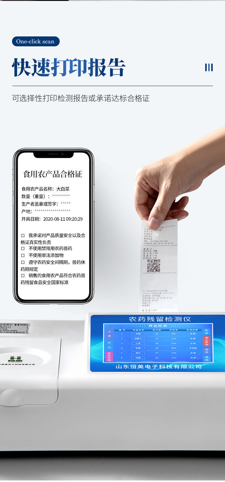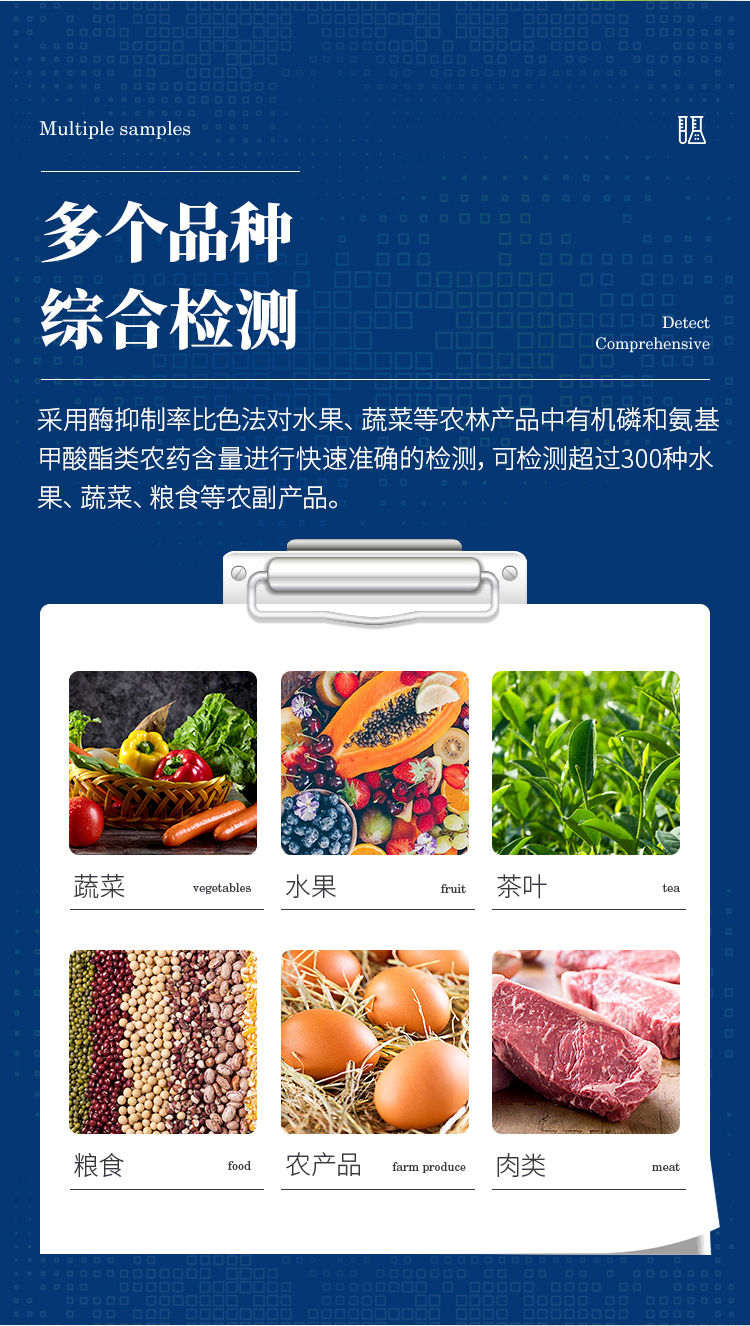 产品简介: 检测标准:依据国家标准方法(GB/T5009.199-2003)以及世界卫生组织WHO、世界粮农组织FAO残留农药检测标准、世界环境保护局EPA参照摄入量等要求来设计。采用酶抑制率比色法对水果、蔬菜等农林产品中有机磷和氨基甲酸酯类农药含量进行快速准确的检测。 广泛应用于主要用于蔬菜、水果、茶叶、粮食、农副产品等食品中有机磷和氨基甲酸酯类农药残留的快速检测;此外还可用于果蔬茶生产基地和农贸批发销售市场现场检测,餐馆、学校、食堂、家庭果蔬加工前的安全速测等。 性能描述: 1、乙酰胆碱酯酶和丁酰胆碱酯酶试剂均可以使用,符合国家标准和农业部标准的要求。 2、自动判断样品是否合格,检测结果更加直观。 3、仪器具有100多种蔬菜名称菜单库,分类管理,并可按需添加或删除蔬菜名,编辑蔬菜名称,可直接打印出蔬菜名称。 4、检测通道:16个检测通道,可以同时测试多个样品,循环检测,即放即检,每个样品由程序控制分别独立工作,不会互相干扰。 5、智能操作系统,采用更加人性化操作,主控采用多核处理器,主频1.88Ghz,运转速度更快速,稳定性更强。 6、显示方式:7英寸高灵敏真彩触摸屏显示,人性化中文操作界面,读数直观、简单。 7、打印机采用串口5v打印,可选择手动打印或者自动打印,三分钟出打印结果,打印格式为检测人姓名、吸光度差值、检测时间、检测机构、样品名称及结果判定。 8、光源采用进口超高亮发光二极管,具有低功耗、高精度、稳定性强、光源可控可以关掉不使用的光源,响应速度快等优点。 9、智能恒流稳压,光强自动校准,长时间连续工作光源无温漂现象。 10、仪器具有GPRS远传功能,可插手机卡实现数据远传平台,wifi联网功能,可将数据快速上传电脑,进行数据管理与统计。 11、采用USB2.0接口设计,方便数据的存贮和移动,并可随时与计算机直接相连,并且可用计算机控制仪器。实现数据查询、浏览、分析、统计、打印等。 12、智能化程度高,仪器具有自检功能:具有开机自检和调零功能,具有自动检测重复性功能 13、仪器具有自身保护功能,可设置用户名及密码,防止非工作人员操作等。 14、采用DC12v直流供电,安全系统更高,并且配备2A锂电池充电器。 15、仪器具有重新校准、锁定、恢复出厂设置功能。 技术参数; *波长配置:412nm; *抑制率显示范围:0%~100%; *抑制率测量范围:0%~100%; *透射比准确度:±1.5%; *透射比重复性:≤0.5%; *漂移:≤0.005Abs/3min; *抑制率示值误差:≤10%; *抑制率重复性:≤5%; *仪器尺寸;42×31×20cm; *仪器净重:3.6kg; *仪器包装尺寸:510*390*375mm *包装重量:7kg 选配功能 1)可加配语音报读功能,人性化指导操作。 3)仪器可实现自身加热功能。 4)可配置大容量锂电池。