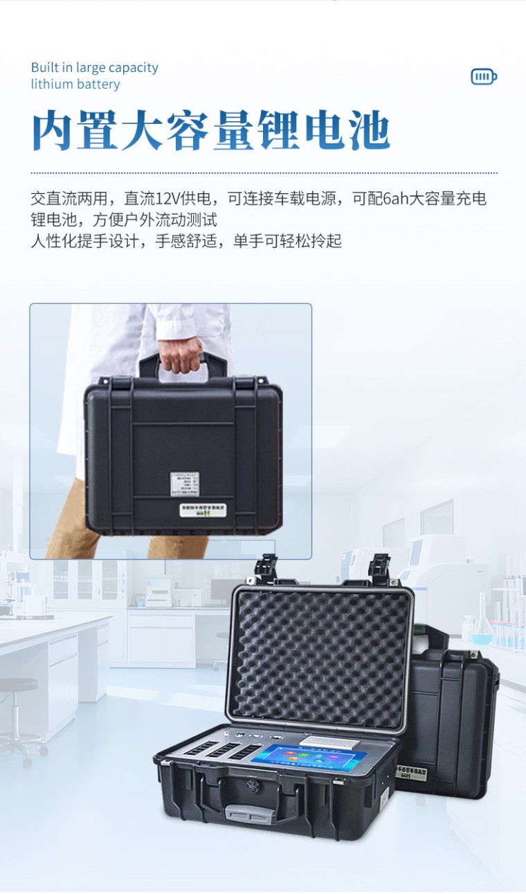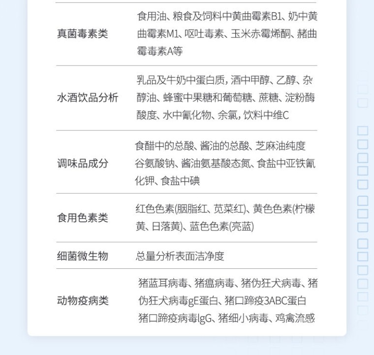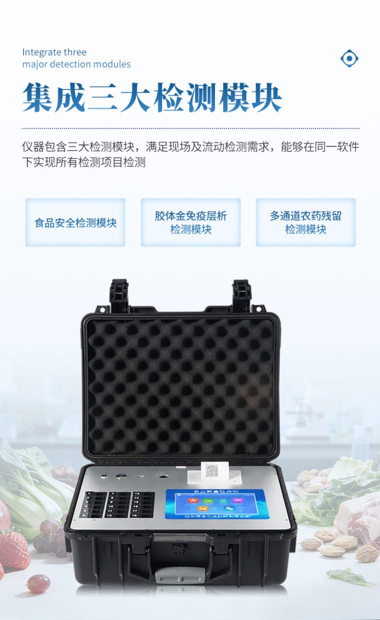 一、产品介绍: 多参数食品安全分析仪可快速检测200多项目,包含非食用化学物质、滥用食品添加剂、农药残留、兽药残留、重金属、病害肉、营养强化剂、抗生素类残留、激素类残留、真菌毒素类残留、化学类残留等现场的定性定量检测。 该多功能食品安全检测仪为集成化食品安全快速检测分析设备,广泛应用于市场监管局、检测中心、卫生监督部门、农业部门、院校及各单位食堂、食品肉产品深加工企业、商超市场、司法部门、餐饮机构、养殖场、屠宰场、检验检疫部门等单位使用。 二、检测项目: 食品添加剂:二氧化硫、双氧水、亚硝酸盐、硝酸盐、苯甲酸钠、山梨酸、糖精钠、甜蜜素、安赛蜜、硫酸镁等 有毒有害物质:甲醛、吊白块、硼砂、过氧化苯甲酰、工业碱、溴酸钾、罗丹明B、三聚氰胺、苏丹红等 农药残留:酶抑制率法有机磷氨基甲酸酯类农药;胶体金法各种具体农药检测 病害肉诊断:组胺、挥发性盐基氮、肉制品酸价、水发产品中组胺 重金属含量:铅、镉、铬、汞、砷、锡、镍、铝等。食用油脂检测:过氧化值、酸价、油脂丙二醛、总多酚等。 瘦肉精激素类(兽药):盐酸克伦te罗、沙丁胺醇、莱克多巴胺、己烯雌酚、喹乙醇等 抗生素残留类(兽药):四环素类、硝基呋喃类、磺胺类、沙星类、喹诺酮类、氟苯尼考、庆大霉素、链霉素、阿莫西林、红霉素等 水产品安全类:孔雀石绿、氯霉素、呋喃妥因代谢、呋喃西林代谢、呋喃它酮代谢、呋喃唑酮代谢、氟苯尼考、土霉素、金霉素、甲砜霉素、地西泮等 真菌毒素类:食用油、粮食及饲料中黄曲霉毒素B1、奶中黄曲霉毒素M1、呕吐毒素、玉米赤霉烯酮、赭曲霉毒素A等 水酒饮品分析:乳品及牛奶中蛋白质;酒中甲醇、乙醇、杂醇油;蜂蜜中果糖和葡萄糖、蔗糖、淀粉酶、酸度;水中氰化物、余氯,饮料中维C等 调味品成分:食醋的总酸、酱油的总酸、芝麻油纯度、谷氨酸钠、酱油氨基酸态氮、食盐中亚铁氰化钾、食盐中碘等 食用色素类:红色色素(胭脂红、苋菜红、赤藓红、诱惑红)、黄色色素(柠檬黄、日落黄)、蓝色色素(亮蓝)等 动物疫病类:猪蓝耳病毒、猪瘟病毒、猪伪狂犬病毒、猪伪狂犬病毒gE蛋白、猪口蹄疫3ABC蛋白、猪口蹄疫病毒IgG、猪细小病毒、鸡禽流感等 三、功能特点: 1、★安卓智能操作系统,采用更加高效UI交互界面,仪器具有wifi联网上传、4G联网传输、GPRS无线远传、网线连接功能,快速批量上传数据。 2、智能化程度高,仪器具有自检功能:具有开机自检和调零功能,具有自动检测重复性功能。 3、★两个胶体金检测模块通道,胶体金双通道可同时工作,在同一界面显示,轨道式自动传输扫描,检测完成后自动退出检测卡。 4、★仪器内置摄像头拍照,可显示金标卡实时图像,系统自动分析并呈现出CT坐标曲线图,CT线自动识别,无需手动调整。 5、★比色池带有控温功能,可以升降温度,优化了前处理过程,并且有效补偿环境影响保证检测结果 6、★仪器带有监管平台,数据可局域网和互联网数据上传,检测结果直接传至食品安全监管平台。进行区域食品安全监管及大数据分析处理与数据统计,检测区域食品安全长短期动态,达到食品安全问题预估、预警 7、一体化主机,包含食品安全检测模块、24通道农药残留检测模块、两胶体金免疫层析检测模块。 8、一体化便携式快检设备,满足现场及流动检测使用需求,能够在同一软件下实现所有检测项目的检测,并可通过同一窗口直观显示检测结果。 9、内置强大的数据库,具有多品类多种类样品菜单功能,可灵活选择检测样品,不同的检测通道可同时检测不同的样品项目。也可在仪器上直接编辑录入样品名称、检测指标、送检单位等信息并保存进样品数据库。 10、★仪器内置操作视频,点击视频模块即可快速学习,是您身边的化验指导专家。 11、样品处理简单省力,整体操作快速、安全、便捷。 12、★仪器可配置身份识别功能,通过密码或刷证件开机,防止非工作人员操作等。 13、新一代高速热敏打印机,检测完成可自动打印或批量打印检测报告和二维码。 14、高灵敏度,高检测精度,高重复性精度,扫描式高精度光学传感器。 15、仪器具有重新校准、锁定、恢复出厂设置功能。 16、结果判定线可修改,对照值标定值可保存,断电不丢失数据。 17、兼容市场上所有的胶体金卡,使用耗材不受限制,极大增强用户使用体验。 四、主要参数: 1、主控芯片采用ARM Cortex-A7,RK3288/4核处理器,主频1.88Ghz,运转速度更快速,稳定性更强。 2、★显示方式:10英寸液晶触摸屏显示,人性化中文操作界面,读数直观、简单。 3、交直流两用,直流12V供电,可连接车载电源,内置12ah大容量充电锂电池,方便户外流动测试。 4、★四波长冷光源,24个检测通道,每个通道均配置410、520、590、630nm波长光源,标配先进的光路切换装置,专业光路切换功能可实现最多64波长,并且所有检测项目可实现所有通道同时检测。 5、智能恒流稳压,光强自动调节与校准,长时间连续工作光源无温漂现象。 6、★内置新国家限量标准,与所测结果进行现场比对,并持续更新标准。 7、不间断进样,连续检测 8、样本编号自动累加。 9、检测结果为Excel表格,连接电脑即可拷贝。 10、检测结果存储容量20万条 11、★同时支持U盘拷贝,标准USB接口,免驱动插拔。 12、检测项目可扩充,固件可升级 13、仪器尺寸: