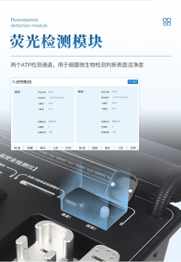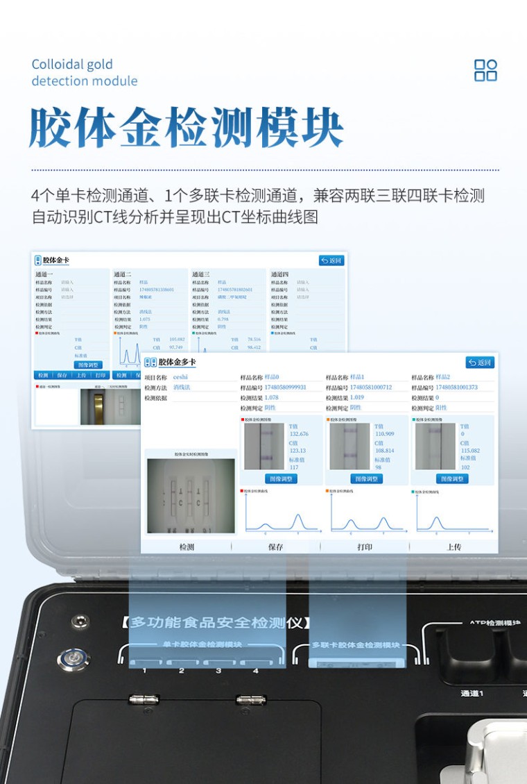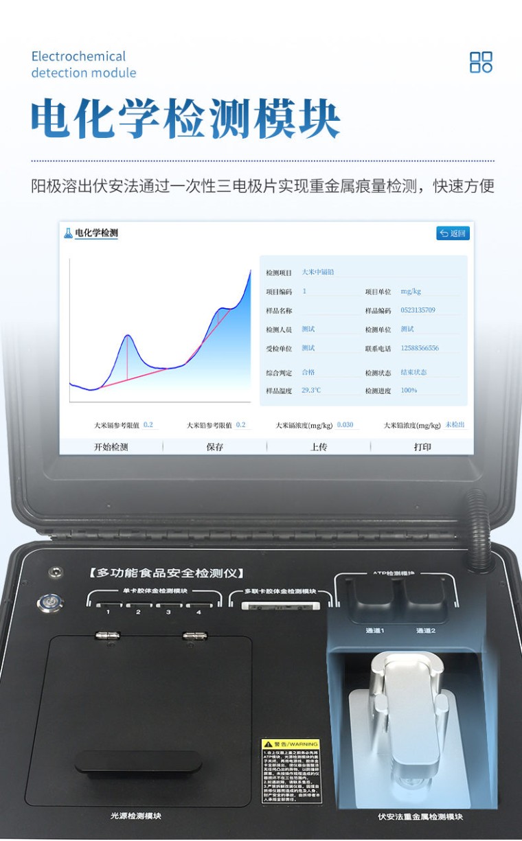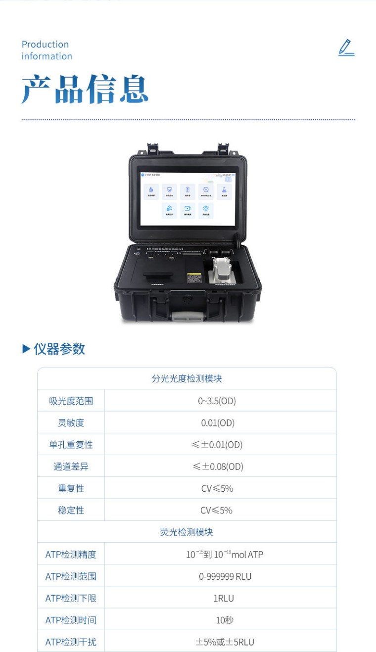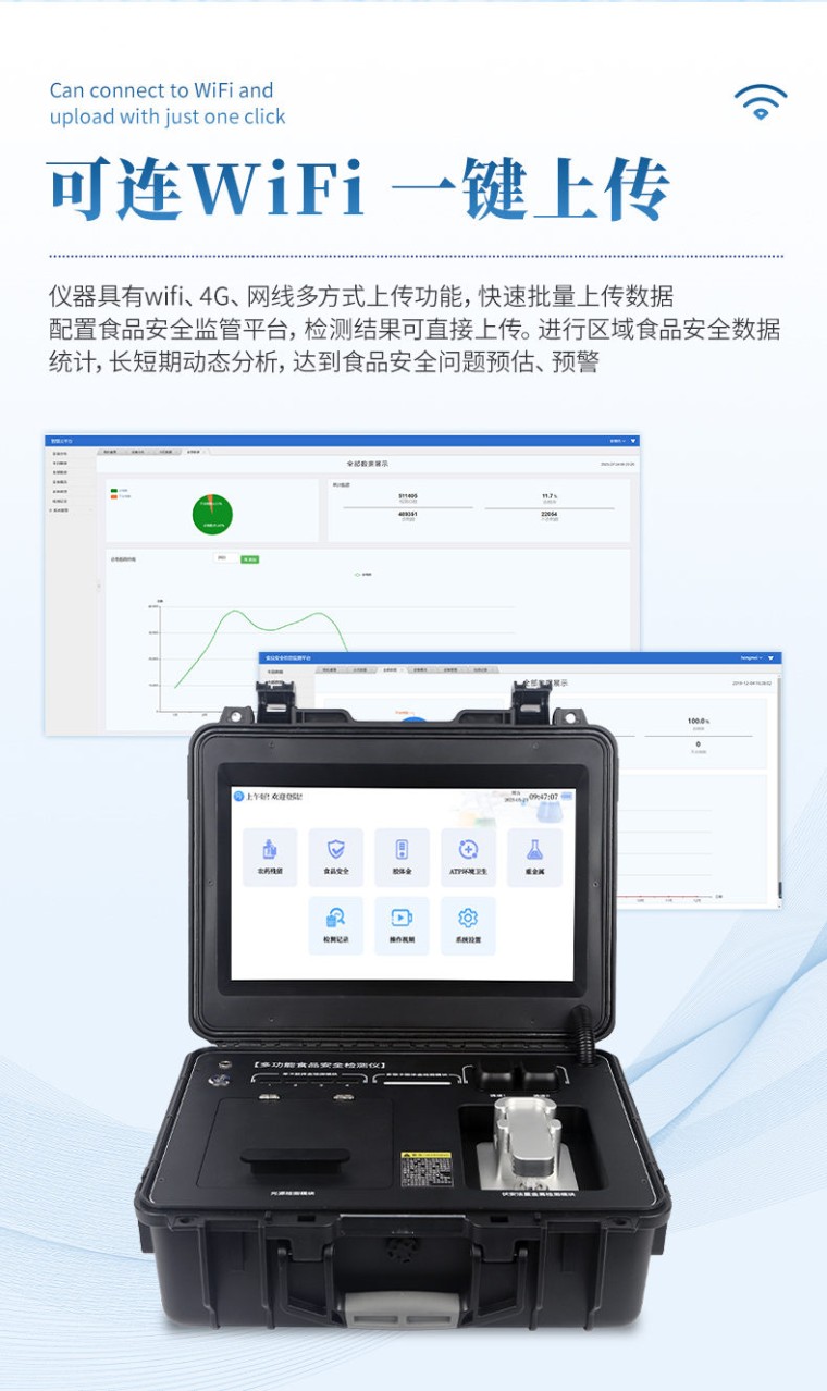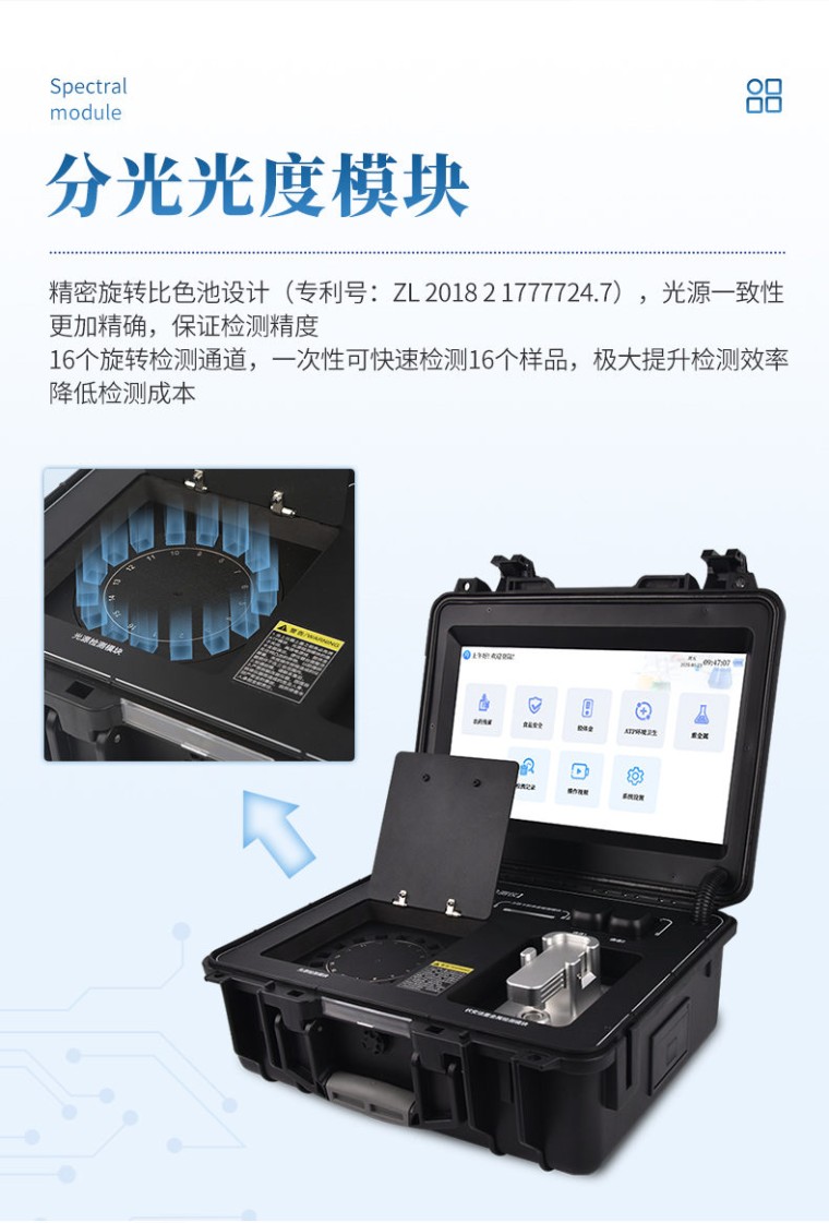 本仪器操作简便、体积小、集成多种检测方法,可快速检测200多项目,包含非食用化学物质、滥用食品添加剂、农药残留、兽药残留、微量元素、重金属、细菌微生物、病害肉、营养强化剂、抗生素类残留、激素类残留、真菌毒素类残留、化学类残留、等现场的定性定量检测。 该设备多功能一体,广泛应用于市场监管局、检测中心、卫生监督部门、农业部门、院校及各单位食堂、食品肉产品深加工企业、商超市场、司法部门、餐饮机构、养殖场、屠宰场、检验检疫部门等单位使用。 检测项目: 食品添加剂:二氧化硫、双氧水、亚硝酸盐、硝酸盐、苯甲酸钠、山梨酸、糖精钠、甜蜜素、安赛蜜、硫酸镁等 有毒有害物质:甲醛、吊白块、硼砂、过氧化苯甲酰、工业碱、溴酸钾、罗丹明B、三聚氰胺、苏丹红等 果蔬农药残留:酶抑制率法有机磷氨基甲酸酯类农药;胶体金法各种具体农药检测 病害肉诊断:组胺、挥发性盐基氮、肉制品酸价、水发产品中组胺 重金属含量:铅、镉、铬、汞、砷、锡、镍、铝等。 食用油脂检测:过氧化值、酸价、油脂丙二醛、总多酚等。 瘦肉精激素类(兽药):盐酸克伦te罗、沙丁胺醇、莱克多巴胺、己烯雌酚、喹乙醇等 抗生素残留类(兽药):四环素类、硝基呋喃类、磺胺类、沙星类、喹诺酮类、氟苯尼考、庆大霉素、链霉素、阿莫西林、红霉素等 水产品安全类:孔雀石绿、氯霉素、呋喃妥因代谢、呋喃西林代谢、呋喃它酮代谢、呋喃唑酮代谢、氟苯尼考、土霉素、金霉素、甲砜霉素、地西泮等 真菌毒素类:食用油、粮食及饲料中黄曲霉毒素B1、奶中黄曲霉毒素M1、呕吐毒素、玉米赤霉烯酮、赭曲霉毒素A等 水酒饮品分析:乳品及牛奶中蛋白质;酒中甲醇、乙醇、杂醇油;蜂蜜中果糖和葡萄糖、蔗糖、淀粉酶、酸度;水中氰化物、余氯,饮料中维C等 调味品成分:食醋的总酸、酱油的总酸、芝麻油纯度、谷氨酸钠、酱油氨基酸态氮、食盐中亚铁氰化钾、食盐中碘等 食用色素类:红色色素(胭脂红、苋菜红、赤藓红、诱惑红)、黄色色素(柠檬黄、日落黄)、蓝色色素(亮蓝)等 细菌微生物:总量分析表面洁净度 动物疫病类:猪蓝耳病毒、猪瘟病毒、猪伪狂犬病毒、猪伪狂犬病毒gE蛋白、猪口蹄疫3ABC蛋白、猪口蹄疫病毒IgG、猪细小病毒、鸡禽流感等 产品特点: 1、★Android 10操作系统,具有wifi、4G、网线多方式上传功能,快速批量上传数据。 2、★15.6寸超大触摸屏,清晰高效的UI交互界面,增强操作和视觉体验。 3、★精密旋转比色池设计(专利号:ZL 2018 2 1777724.7),光源一致性更加精确,保证检测精度。 4、★分光光度模块,16个旋转检测通道,一次性可快速检测16个样品,极大提升检测效率,降低检测成本。 5、★胶体金检测模块,4个单卡检测通道、1个多联卡检测通道,兼容两联三联四联卡检测,自动识别CT线分析并呈现出CT坐标曲线图。 6、★荧光检测模块,2个ATP检测通道,用于细菌微生物检测判断表面洁净度。 7、★电化学检测模块,阳极溶出伏安法通过一次性三电极片实现重金属痕量检测,快速方便。 8、六波长冷光源420nm、470nm、520nm、560nm、620nm、700nm,所有检测项目均可多通道同时检测。 9、标配食品安全监管平台,检测结果可直接上传。进行区域食品安全数据统计,长短期动态分析,达到食品安全问题预估、预警。 10、★内置摄像头拍照,显示金标卡实时图像,自动分析并呈现CT坐标曲线图,CT线自动识别,无需手动调整。 11、仪器内置操作视频,点击视频模块即可快速学习,是您身边的化验指导专家。 12、内置200多种样品的数据库,可自主增删。 13、内置新国家限量标准,与所测结果进行现场比对,并持续更新标准。 14、仪器具有开机自检和调零功能。 15、仪器配备高速热敏打印机,检测完成可自动打印或历史记录批量打印。 16、★同时支持U盘拷贝,检测结果直接导入U盘,免驱动插拔。 17、高性能、低功耗。运行稳定,便于执法流动检测。 18、中英文界面一键切换。 技术参数: 分光光度检测模块: 吸光度范围:0~3.5(OD) 灵敏度: 0.01(OD) 单孔重复性:≤±0.01(OD) 通道差异: ≤±0.08(OD) 重复性: CV≤5% 稳定性: CV≤5% ★荧光检测模块: ATP检测精度:10-15到 10-18mol ATP ATP检测范围:0-999999 RLU ATP检测下限:1RLU ATP检测时间:10秒 ATP检测干扰:±5%或±5RLU ★电化学检测模块: 食品重金属样品检测范围:0.03-1.0mg/kg 食品重金属重复性RSD:≤5% 食品重金属分辨率:0.5ppb 食品重金属检测速度:280秒/次 基本参数: 1、ARM Cortex-A7 架构处理器 2、工作环境:温度:10~30℃,湿度:≤70% 3、电源:交直流两用,DC12V(可连接车载电源) 4、电池容量:20AH 5、工作时长:≥5h 6、数据存储:≤50万条 7、额定功率:15W 8、仪器尺寸:430*343*188mm 9、主机净重:16.6kg 10、仪器包装尺寸:510*390*375mm 配件包装尺寸:460*265*420mm 11、包装重量:21kg