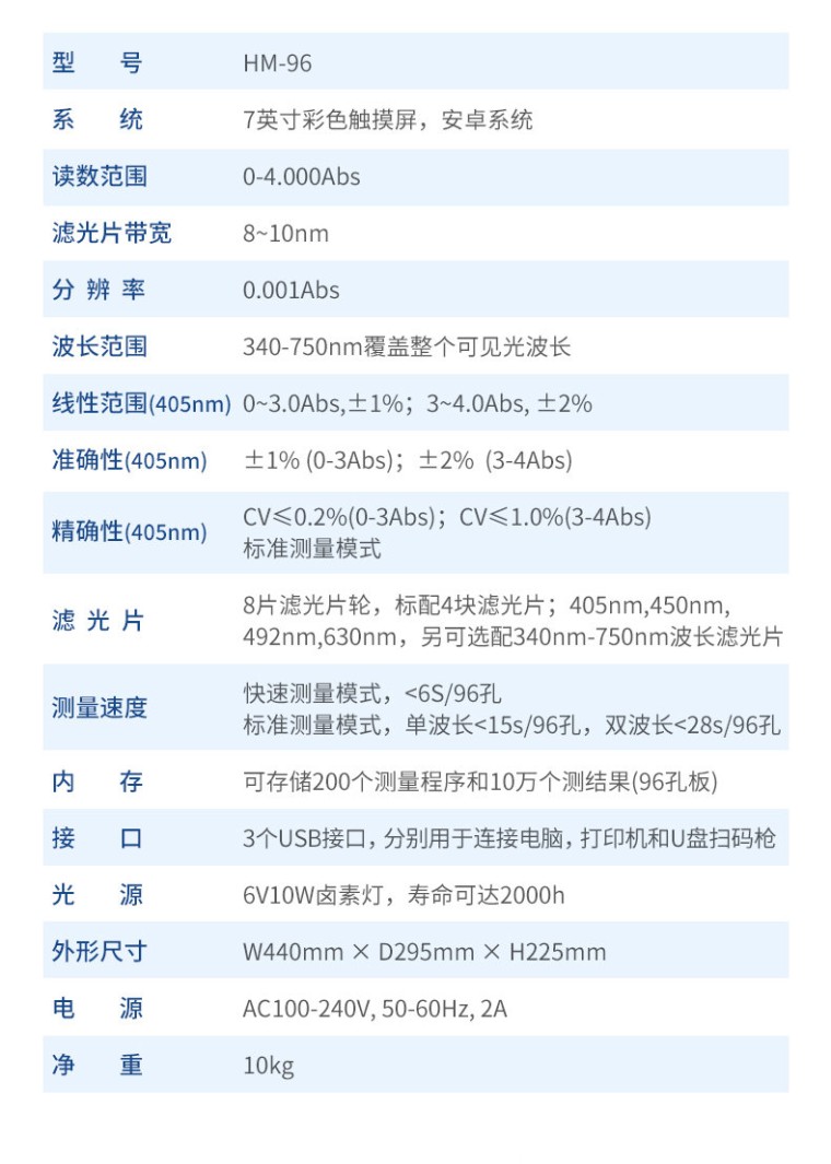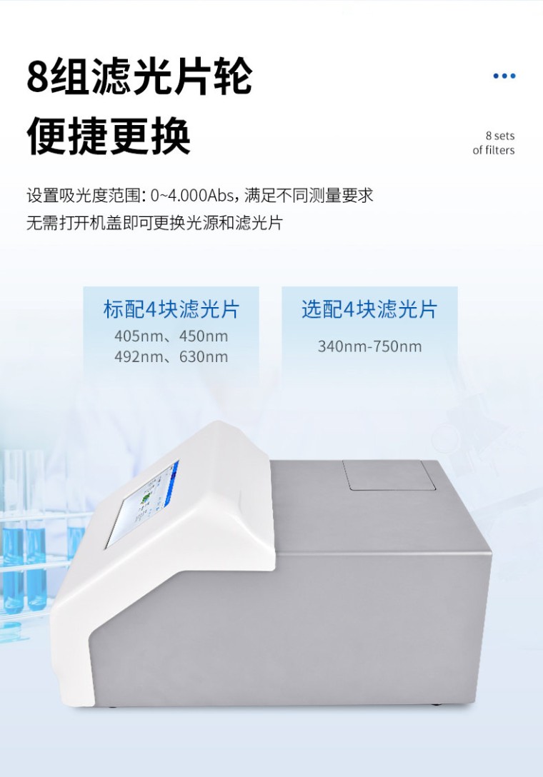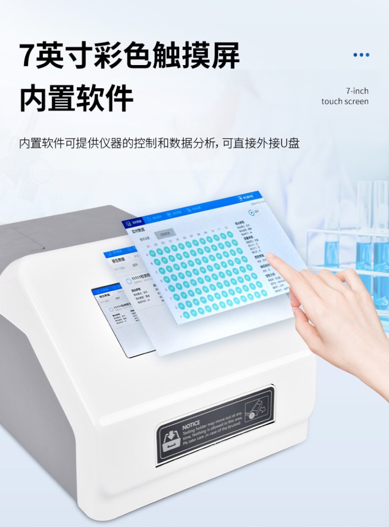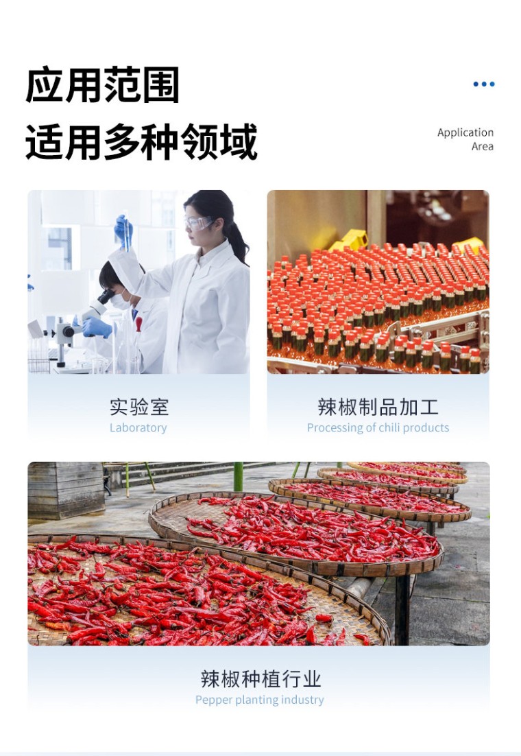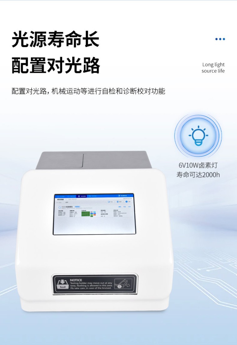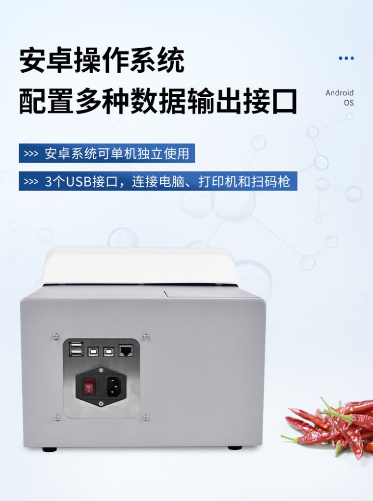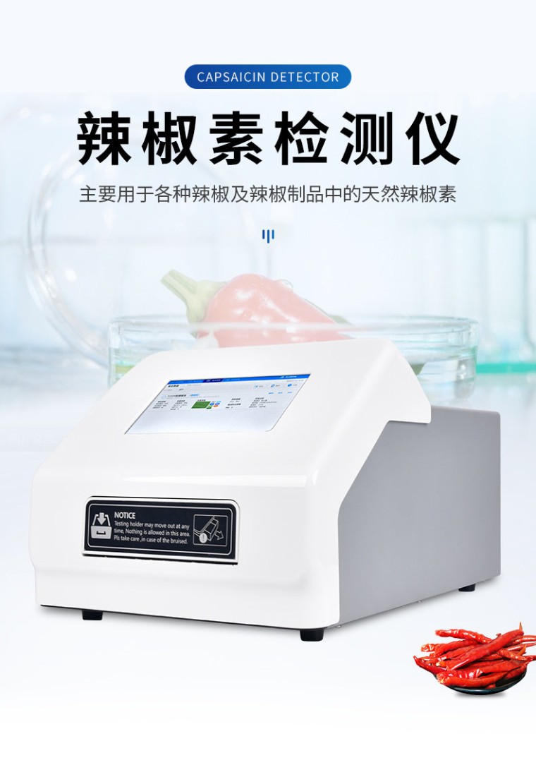 辣椒素检测仪主要用于各种辣椒及辣椒制品中的天然辣椒素、辣度检测。仪器由亮度发光二管光源、比色池、高灵敏度集成光电池、微处理器、汉字大屏幕液晶屏、嵌入式微型热敏打印机集成芯片构成,可直接在大屏幕液晶屏上显示出被测样品中相关指标的含量,并打印出分析结果,还可以通过计算机接口将数据传输到电脑进行数据分析。 工作原理: 被检样品中的相辣椒素成分与显色剂在--定的条件下发生特异性反应,可生成不同颜色深度的产物,这些产物对不同波长可见光会产生有选择性吸收,颜色的深浅即吸光度的高低与样品中该指标成分的浓度成相关性,并在适当的浓度范围内服从朗伯--比尔定律。因此检测的吸光度值经仪器内置的标准曲线软件自动计算可得出样品中该指标成分的准确浓度及是否超标的结果。 产品特点: 高清触摸屏:显示使用7英寸彩色触摸屏; 内置软件:内置软件可提供仪器的控制和数据分析,可直接外接U盘; 光源寿命长: 光源采用6V10W卤素灯,寿命可达2000h; 读板快速:采用单波长,双波长检测读板快速; 振板功能:根据使用配置了振板功能,可根据使用设置振板时间和速度; 操作系统:配备自主研发的安卓操作系统可单机独立使用,同时配置多种数据输出接口,方便不同的数 据传输和处理; 可视化布板: 并采用可视化布板方式输出测试结果; 设置吸光度范围:0~4.000Abs,满足不同测量要求,并配备了8组滤光片轮,标配4组滤光片,根据使用 可选配340 nm~750nm波长的滤光片组合使用。设计合理无需打开机盖就可更换光源和滤光片; 检测数据:使用自动校准、定位系统算法使检测数据更精准、可靠; 配置对光路: 配置对光路,机械运动等进行自检和诊断校对功能。 技术参数: 系统:7英寸彩色触摸屏,安卓系统 读数范围:0-4.000Abs 滤光片带宽:8~10nm 分辨率:0.001Abs 波长范围:340-750nm覆盖整个可见光波长 线性范围 (405nm):0~3.0Abs,±1%;3~4.0Abs, ±2% 准确性(405nm):±1% (0-3Abs);±2% (3-4Abs) 精确性 (405nm):CV≤0.2%(0-3Abs);CV≤1.0%(3-4Abs) 标准测量模式 滤光片:8片滤光片轮,标配4块滤光片;405nm,450nm,492nm,630nm,另可选; 配340nm-750nm波长滤光片 测量速度:快速测量模式,<6s> 内存:可存储200个测量程序和10万个测结果(96孔板) 接口:3个USB接口,分别用于连接电脑,打印机和U盘扫码枪 光源:6V10W卤素灯,寿命可达2000h 外形尺寸:W440mm × D295mm × H225mm 电源:AC100-240V, 50-60Hz, 2A 净重:10kg