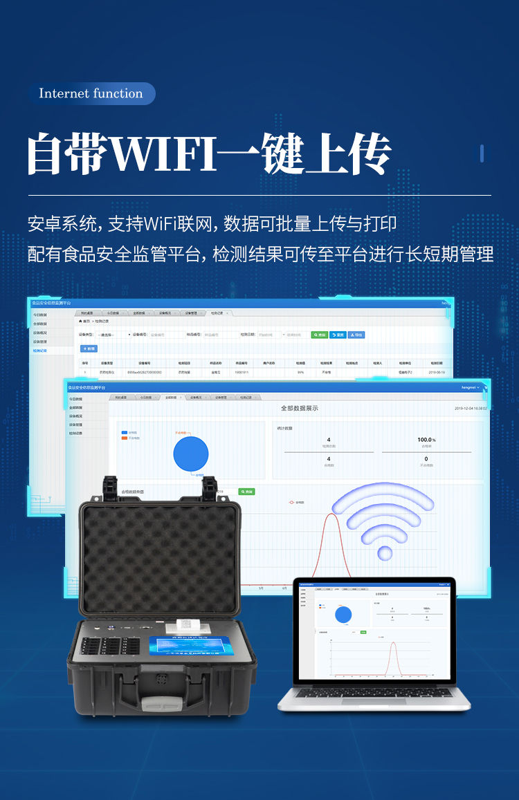 产品简介: 综合农药残留检测仪,除了遵循国标对有机磷和氨基甲酸酯类农药进行检测外,还可以针对具体农药进行分项准确检测,包含阿维菌素,啶虫脒,噻虫胺,噻虫嗪,毒死蜱,氟虫氰,氧乐果,克百威,甲拌磷等众多杀虫剂化合物。 检测方法:有机磷和氨基甲酸酯类农药检测采用酶抑制率比色法,依据国家标准方法(GB/T5009.199-2003)。乙酰胆碱酯酶和丁酰胆碱酯酶试剂均可以使用,符合国家标准和农业部标准的要求;分项检测依据胶体金免疫层析法对众多的每种杀虫剂进行快速准确检测。 广泛应用于主要用于蔬菜、水果、茶叶、粮食、农副产品等食品中有机磷和氨基甲酸酯类农药残留的快速检测;此外还可用于果蔬茶生产基地和农贸批发销售市场现场检测,餐馆、学校、食堂、家庭果蔬加工前的安全速测等。 功能特点: 1、机箱采用工业级ABS工程塑料箱,方便携带,稳固耐用,便于流动测试。 2、安卓智能操作系统,采用更加高效的UI交互界面,具有wifi联网上传、4G联网传输、GPRS无线远传、网线连接功能,快速批量上传数据。 3、一体化主机,包含多通道光电检测模块、胶体金免疫层析检测模块。 4、胶体金模块检测方式:轨道式自动传输扫描,检测完成后自动退出检测卡。 5、CT线自动识别,无需手动调整,检测完成自动显示CT坐标曲线。 6、仪器具有自检功能:具有开机自检和调零功能,具有自动检测重复性功能。 7、新一代高速热敏打印机,检测完成可自动打印或批量打印检测报告和二维码。 8、仪器带有监管平台,数据可局域网和互联网数据上传,检测结果直接传至食品安全监管平台。进行区域食品安全监管及大数据分析处理与数据统计,检测区域农产品安全长短期动态,达到食品安全问题预估、预警 9、内置强大的数据库,具有多品类多种类样品菜单功能,可灵活选择检测样品,不同的检测通道可同时检测不同的样品项目。也可在仪器上直接编辑录入样品名称、检测指标、送检单位等信息并保存进样品数据库。 10、产品内置操作演示视频,是您身边的化验指导专家。 11、样品处理简单省力,整体操作快速、安全、便捷。 13、高灵敏度,高检测精度,高重复性精度,扫描式高精度光学传感器。 14、结果判定线可修改,对照值标定值可保存,断电不丢失数据。 15、兼容市场上所有的胶体金卡,使用耗材不受限制。 16、仪器具有重新校准、锁定、恢复出厂设置功能。 主要参数: 1、主控芯片采用ARM Cortex-A7,RK3288/4核处理器,主频1.88Ghz,运转速度更快速,稳定性更强。 2、12个检测通道,可批量快速多样品检测, 3、显示方式:7英寸液晶触摸屏显示,人性化中文操作界面,读数直观、简单。 4、交直流两用,配有6ah大容量充电锂电池,方便户外流动测试,直流12V供电,可连接车载电源。 5、智能恒流稳压,光强自动调节与校准,长时间连续工作光源无温漂现象。 6、样本编号自动累加。 7、数据无线上传平台,并可从平台导出为Excel表格。 8、检测结果存储容量20万条 9、同时支持U盘拷贝,标准USB接口,免驱动插拔。 10、检测项目可扩充,固件可升级 11、仪器尺寸:43×35×19cm, 主机净重:5.2kg 技术参数: *波长配置:412nm; *抑制率显示范围:0%~100%; *抑制率测量范围:0%~100%; *透射比准确度:±1.5%; *透射比重复性:≤0.5%; *漂移:≤0.005Abs/3min; *抑制率示值误差:≤10% *抑制率重复性:≤5% 选配功能 1)可加配语音报读功能,人性化指导操作。 3)仪器可实现自身加热功能。 4)可配置大容量锂电池。
