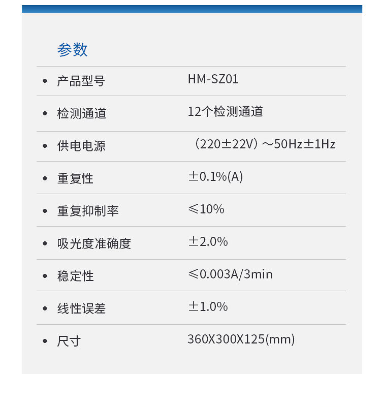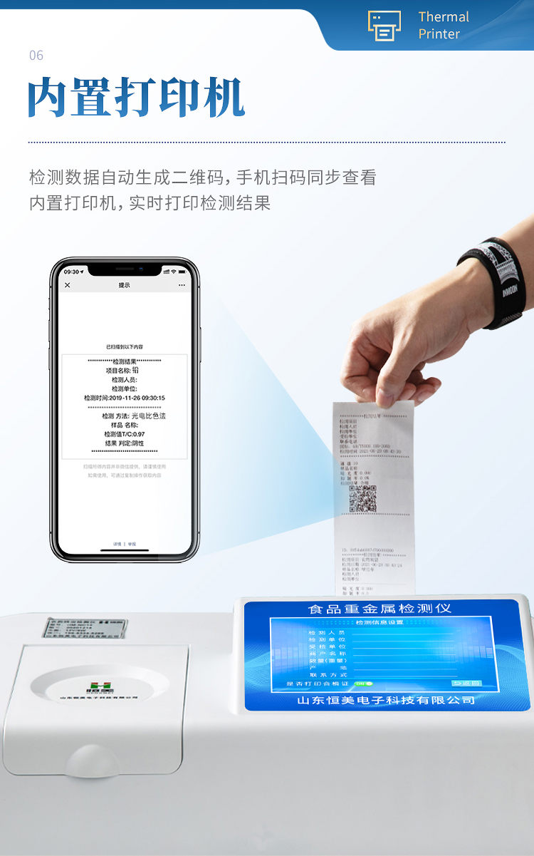 仪器用途: TZ01重金属检测仪可广泛应用于大米、粮谷、果品、蔬菜、药材、水质、水产品中重金属铅、镉、六价铬、汞、砷、铁、镍、铝(任选1项)的快速检测,检测项目可根据客户的需求定制。 功能特点: 1、该仪器通过光电子技术对反应生成物的反射率进行分析测试,定量或定性分析样品中待测物的含量。 2、安卓智能操作系统,7英寸高灵敏真彩触摸屏,更加高效和人性化操作, 3、仪器具有4G无线联网、wifi联网上传、GPRS无线远传功能,快速上传数据。 4、便携式仪器,便于现场携带操作,主机重量不大于3kg。 5、具有可见光光源,可检测可见光信号,检测值0~30000。 6、具有常用打印机数据线接口,直接打印结果;配备USB接口,可连接网络。 7、具有多个食品安全检测项目,开放平台,可以增减检测项目。 8、检测通道:12个检测通道,可以同时测试多个样品,每个样品由程序控制分别独立工作,不会互相干扰。 9、以模拟反射率的标准片为50%附近时为代表,精密度CV值≤0.8%。 10、供电电源:(220±22V)~50Hz±1Hz,供电电源电压波动不应超过220V AC±10%。 11、内置打印机,实时打印检测结果。内置大容量电池,便于现场执法检测。 12、机身储存上万条检测结果,也可以导出储存。 13、开放端口,可连接监管平台数据库,界面有上传操作。 技术参数: ◆ 重复性:±0.1%(A) ◆ 重复抑制率:≤10% ◆ 吸光度准确度:±2.0% ◆ 稳定性:≤0.003A/3min ◆ 线性误差:±1.0% ◆ 尺寸:360X300X125(mm)