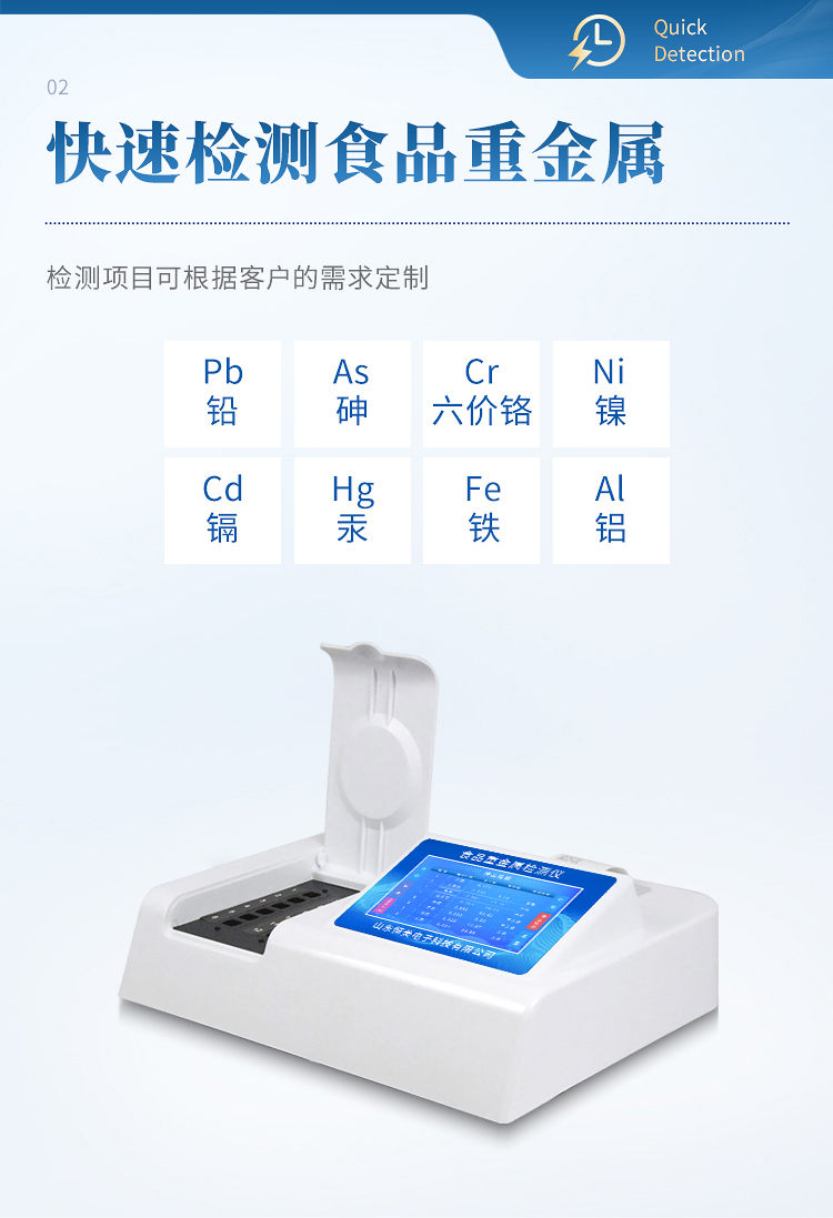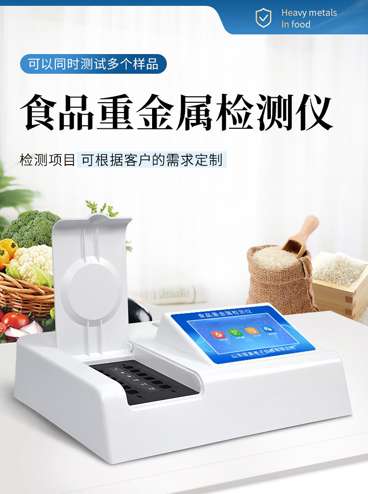 仪器用途: TZ03重金属检测仪可广泛应用于大米、粮谷、果品、蔬菜、药材、水质、水产品中重金属铅、镉、六价铬、汞、砷、铁、镍、铝(任选三项)的快速检测,检测项目可根据客户的需求定制。 功能特点: 1、该仪器通过光电子技术对反应生成物的反射率进行分析测试,定量或定性分析样品中待测物的含量。 2、安卓智能操作系统,7英寸高灵敏真彩触摸屏,更加高效和人性化操作, 3、仪器具有4G无线联网、wifi联网上传、GPRS无线远传功能,快速上传数据。 4、便携式仪器,便于现场携带操作,主机重量不大于3kg。 5、具有可见光光源,可检测可见光信号,检测值0~30000。 6、具有常用打印机数据线接口,直接打印结果;配备USB接口,可连接网络。 7、具有多个食品安全检测项目,开放平台,可以增减检测项目。 8、检测通道:12个检测通道,可以同时测试多个样品,每个样品由程序控制分别独立工作,不会互相干扰。 9、以模拟反射率的标准片为50%附近时为代表,精密度CV值≤0.8%。 10、供电电源:(220±22V)~50Hz±1Hz,供电电源电压波动不应超过220V AC±10%。 11、内置打印机,实时打印检测结果。内置大容量电池,便于现场执法检测。 12、机身储存上万条检测结果,也可以导出储存。 13、开放端口,可连接监管平台数据库,界面有上传操作。 技术参数: ◆ 重复性:±0.1%(A) ◆ 重复抑制率:≤10% ◆ 吸光度准确度:±2.0% ◆ 稳定性:≤0.003A/3min ◆ 线性误差:±1.0% ◆ 尺寸:360X300X125(mm)