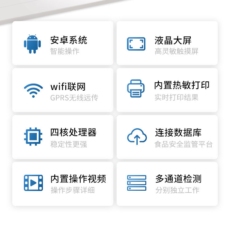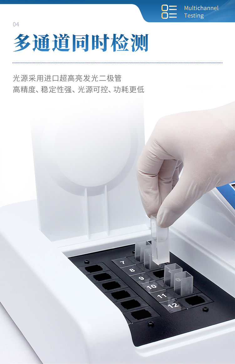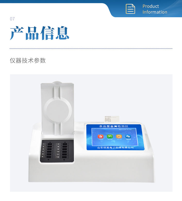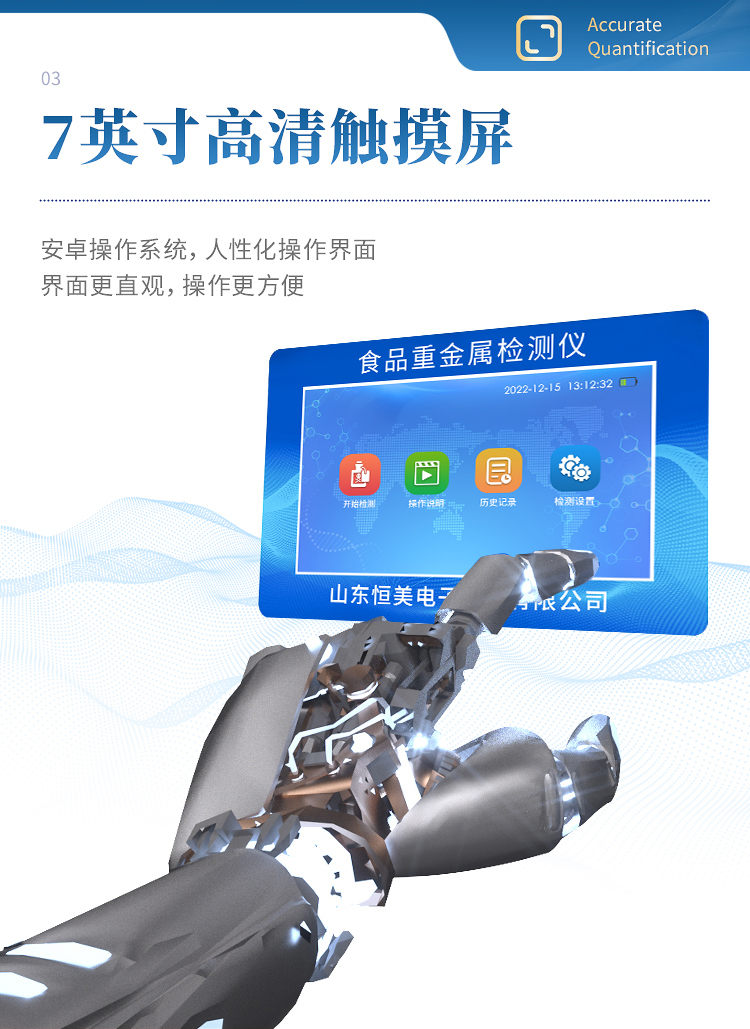 仪器用途: HM-TZ05重金属检测仪可广泛应用于大米、粮谷、果品、蔬菜、药材、水质、水产品中重金属铅、镉、六价铬、汞、砷、铁、镍、铝(任选5项)的快速检测,检测项目可根据客户的需求定制。 功能特点: 1、该仪器通过光电子技术对反应生成物的反射率进行分析测试,定量或定性分析样品中待测物的含量。 2、安卓智能操作系统,7英寸高灵敏真彩触摸屏,更加高效和人性化操作, 3、仪器具有4G无线联网、wifi联网上传、GPRS无线远传功能,快速上传数据。 4、便携式仪器,便于现场携带操作,主机重量不大于3kg。 5、具有可见光光源,可检测可见光信号,检测值0~30000。 6、具有常用打印机数据线接口,直接打印结果;配备USB接口,可连接网络。 7、具有多个食品安全检测项目,开放平台,可以增减检测项目。 8、检测通道:12个检测通道,可以同时测试多个样品,每个样品由程序控制分别独立工作,不会互相干扰。 9、以模拟反射率的标准片为50%附近时为代表,精密度CV值≤0.8%。 10、供电电源:(220±22V)~50Hz±1Hz,供电电源电压波动不应超过220V AC±10%。 11、内置打印机,实时打印检测结果。内置大容量电池,便于现场执法检测。 12、机身储存上万条检测结果,也可以导出储存。 13、开放端口,可连接监管平台数据库,界面有上传操作。 技术参数: ◆ 重复性:±0.1%(A) ◆ 重复抑制率:≤10% ◆ 吸光度准确度:±2.0% ◆ 稳定性:≤0.003A/3min ◆ 线性误差:±1.0% ◆ 尺寸:360X300X125(mm)