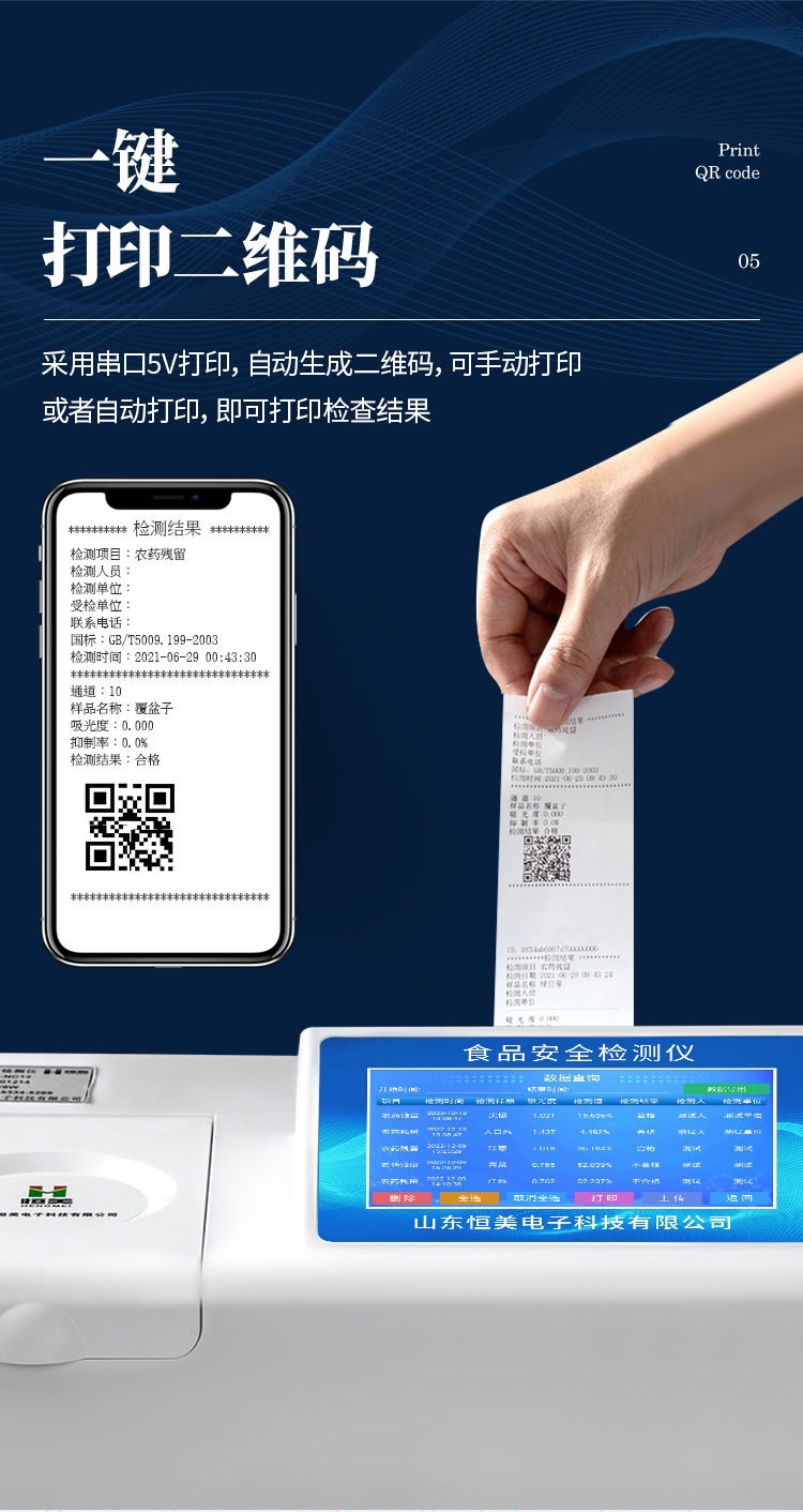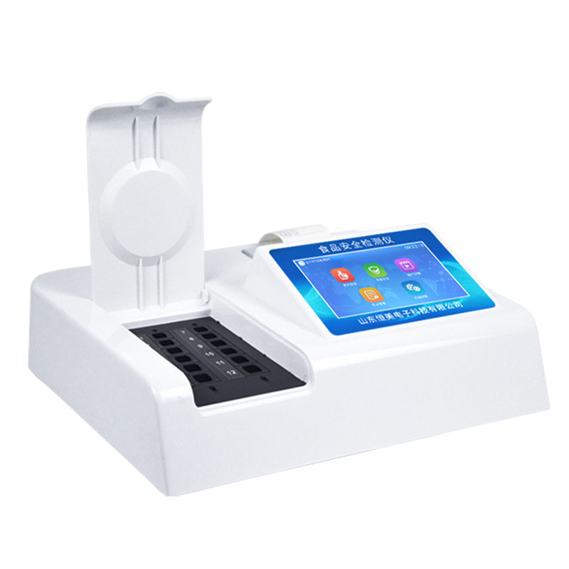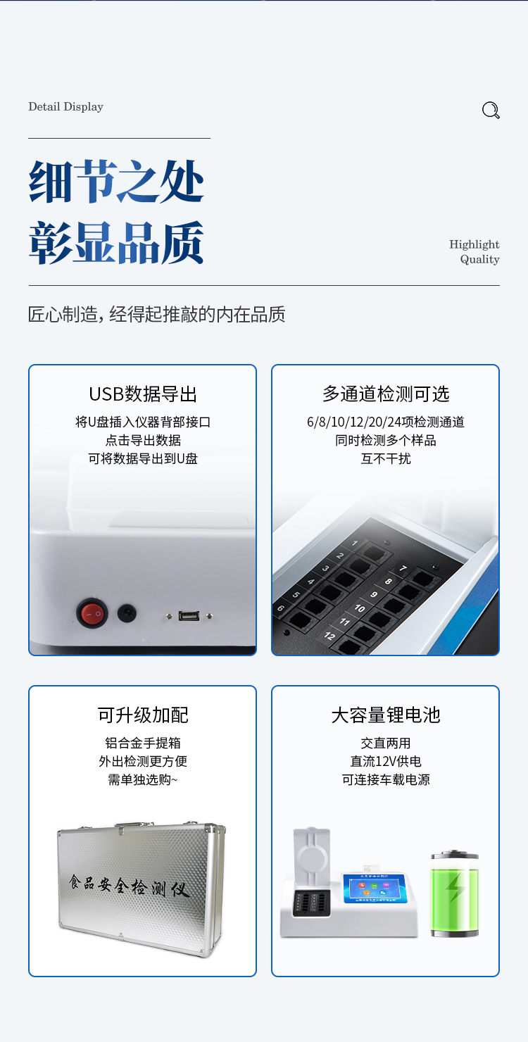 产品用途: 食品检测仪器为集成化食品安全快速检测分析设备,广泛应用于食药监局、卫生部门、高教院校、科研院所、农业部门、养殖场、屠宰场、食品肉产品深加工企业、检验检疫部门等单位使用。 检测项目: 可快速检测各类食品中的甲醛、二氧化硫、亚硝酸盐、吊白块、总多酚的含量,仪器预留其他项目检测程序和端口,根据日后需求可方便的自主增加检测项目。 功能介绍: 1、安卓智能操作系统,采用更加高效和人性化操作,仪器具有网线连接、wifi联网上传、GPRS无线远传功能,快速上传数据。 2、智能化程度高,仪器具有自检功能:具有开机自检和调零功能,具有自动检测重复性功能。 3、检测通道:≥12个检测通道,可以同时测试多个样品,每个样品由程序控制分别独立工作,不会互相干扰。 4、显示方式:≥8英寸液晶触摸屏显示,人性化中文操作界面,读数直观、简单。 5、配备新一代嵌入式热敏打印机,可选择手动打印或者自动打印,检测完成可自动打印检测报告和二维码。 6、光源采用进口超高亮发光二极管,高精度、稳定性强、光源可控、可以关掉不使用的光源,功耗更低。 7、采用USB2.0接口设计,方便数据的存贮和移动,并可随时与计算机直接相连,并且可用计算机控制仪器。实现数据查询、浏览、分析、统计、打印等。 8、仪器带有监管平台。数据可局域网和互联网数据上传,检测结果直接传至食品安全监管平台。进行区域食品安全监管及大数据分析处理,检测区域食品安全长短期动态,达到食品安全问题预估、预警 9、一体化便携式快检设备,满足现场及流动检测使用需求,能够在同一软件下实现所有检测项目的检测,并可通过同一窗口直观显示检测结果。 10、仪器具有品类多种类样品菜单库,可灵活选择检测样品,不同的检测通道可同时检测不同的样品项目。 11、样品处理简单省力,整体操作快速、安全、便捷。 12、仪器具有自身保护功能,可设置用户名及密码,防止非工作人员操作等。 13、高灵敏度,高检测精度,高重复性精度,扫描式高精度光学传感器。 14、内置强大的数据库,可在仪器上直接选择样品名称、检测指标、送检单位等信息,也可在仪器上直接编辑录入样品名称、检测指标、送检单位等信息并保存进样品数据库。 15、仪器具有重新校准、锁定、恢复出厂设置功能。 16、支持U盘存储。 结果判定线可修改,对照值标定值可保存,断电不丢失数据。 主要参数: 1、主控芯片采用ARM Cortex-A7,RK3288/4核处理器,主频1.88Ghz,运转速度更快速,稳定性更强。 2、直流12V供电,可连接车载电源,可配6ah大容量充电锂电池,方便户外流动测试。 3、四波长冷光源,每个通道均配置410、520、590、630nm波长光源,标配先进的光路切换装置,专利光路切换功能可实现最多64波长,并且所有检测项目可实现所有通道同时检测。 4、光源亮度自动调节与校准 5、智能恒流稳压,光强自动校准,长时间连续工作光源无温漂现象。。 6、内置新国家限量标准,与所测结果进行现场比对,并持续更新标准。 7、不间断进样,连续检测 8、样本编号自动累加。 9、检测项目可扩充。 10、检测结果可批量打印,批量上传。 11、数据无线上传平台,并可从平台导出为Excel表格。 12、检测结果存储容量20万条 13、同时支持U盘拷贝,标准USB接口,免驱动插拔。 14、可配置大容量锂电池,固件可升级。 15、仪器尺寸;42×31×20。 16、仪器净重:3.6kg。 17、仪器包装尺寸:510*390*375mm 18、包装重量:6.9kg。 技术参数: 1、农残 检测范围:抑制率(0~100)% 2、甲醛 检出下限:0.5mg/kg,检测范围:2~26mg/kg 3、亚硝酸盐 检出下限:0.5mg/kg,检测范围:0.5~20mg/kg 4、二氧化硫 检出下限:0.018g/kg,检测范围:0.03~1g/kg 5、吊白块 检出下限:0.2mg/kg,检测范围:0.05~10mg/kg