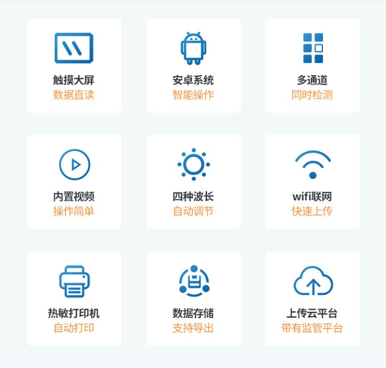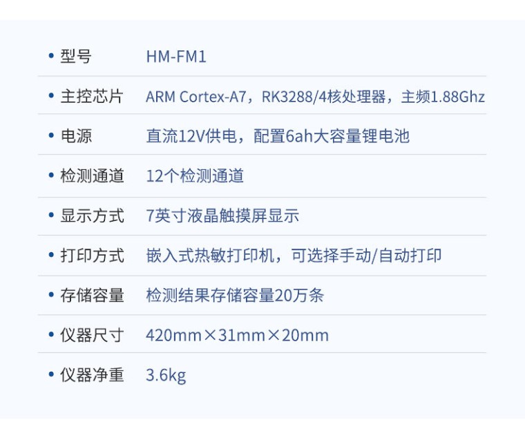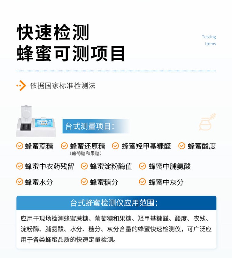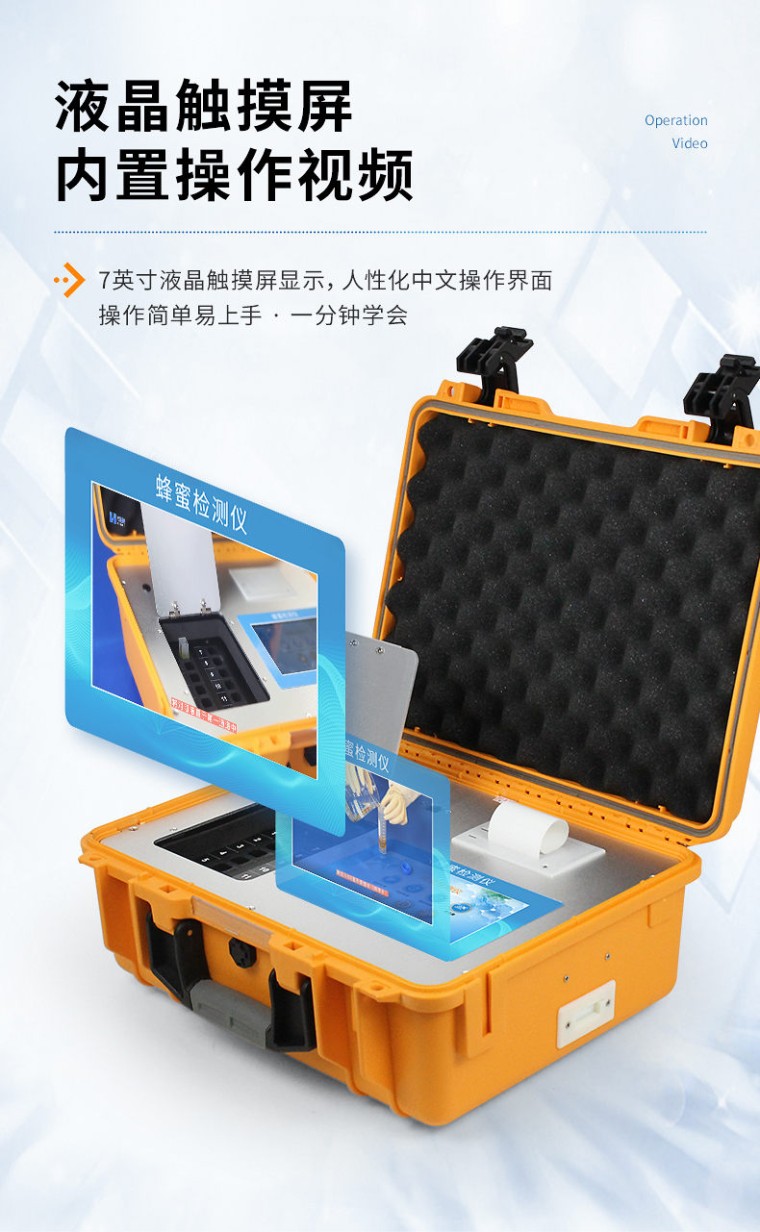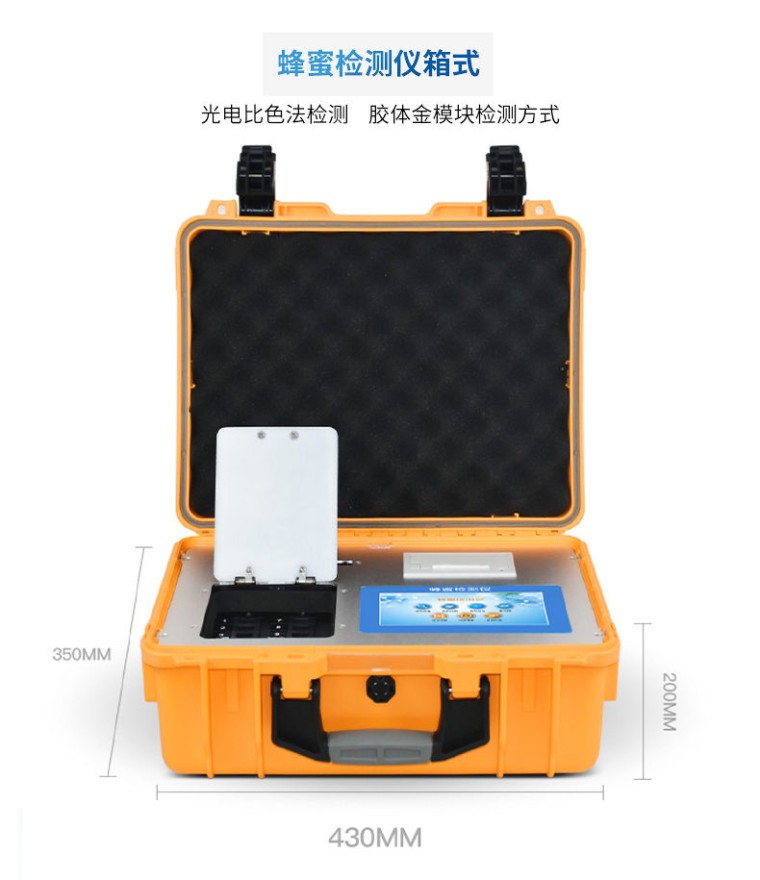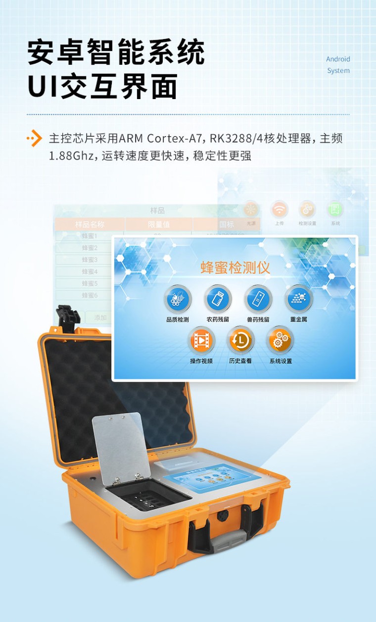 产品介绍: 检测项目:蜂蜜蔗糖、蜂蜜还原糖(葡萄糖和果糖)、蜂蜜羟甲基糠醛、蜂蜜酸度、蜂蜜中农药残留、蜂蜜淀粉酶值、蜂蜜中脯氨酸、蜂蜜水分、蜂蜜糖分、蜂蜜中重金属(铅、镉、汞)、蜂蜜中抗生素(氯霉素、四环素、磺胺类、呋喃类、喹诺酮类)、蜂蜜中灰分,可广泛应用于各类蜂蜜品质的快速定量检测。 产品性能: 1、安卓智能操作系统,采用更加高效UI交互界面,仪器具有wifi联网上传、4G联网传输、GPRS无线远传、网线连接功能,快速批量上传数据。 2、智能化程度高,仪器具有自检功能:具有开机自检和调零功能,具有自动检测重复性功能。 3、新一代高速热敏打印机,检测完成可自动打印或批量打印检测报告和二维码。 4、仪器带有监管平台,数据可局域网和互联网数据上传,检测结果直接传至食品安全监管平台。进行区域食品安全监管及大数据分析处理与数据统计,检测区域食品安全长短期动态,达到食品安全问题预估、预警 5、一体化主机,包含光电比色检测模块、胶体金免疫层析检测模块。 6、一体化便携式快检设备,满足现场及流动检测使用需求,能够在同一软件下实现所有检测项目的检测,并可通过同一窗口直观显示检测结果。 7、胶体金模块检测方式:轨道式自动传输扫描,检测完成后自动退出检测卡。 8、CT线自动识别,无需手动调整。 9、仪器具有多品类多种类样品菜单库,可灵活选择检测样品,不同的检测通道可同时检测不同的样品项目。也可在仪器上直接编辑录入样品名称、检测指标、送检单位等信息并保存进样品数据库。 10、仪器内置操作视频,是您身边的化验指导专家。 11、样品处理简单省力,整体操作快速、安全、便捷。 12、仪器具有自身保护功能,可设置用户名及密码,防止非工作人员操作等。 13、高灵敏度,高检测精度,高重复性精度,扫描式高精度光学传感器。 14、仪器具有重新校准、锁定、恢复出厂设置功能。 15、结果判定线可修改,对照值标定值可保存,断电不丢失数据。 16、兼容市场上所有的胶体金卡,使用耗材不受限制,极大增强用户使用体验。 主要参数: 1、主控芯片采用ARM Cortex-A7,RK3288/4核处理器,主频1.88Ghz,运转速度更快速,稳定性更强。 2、显示方式:7英寸液晶触摸屏显示,人性化中文操作界面,读数直观、简单。 3、交直流两用,直流12V供电,也可连接车载电源,可加配6ah大容量充电锂电池,方便户外流动测试。 4、四波长冷光源,12个检测通道,每个通道均配置410、520、590、630nm波长光源,标配先进的光路切换装置,专业光路切换功能可实现最多64波长,并且所有检测项目可实现所有通道同时检测。 5、光源亮度自动调节与校准 6、智能恒流稳压,光强自动校准,长时间连续工作光源无温漂现象。 7、内置新国家限量标准,与所测结果进行现场比对,并持续更新标准。 8、不间断进样,连续检测 9、样本编号自动累加。 10、检测结果为Excel表格,连接电脑即可拷贝。 11、检测结果存储容量20万条 12、支持U盘存储,标准USB接口,免驱动安装。 13、检测项目可扩充,固件可升级 14、仪器尺寸:43×35×20cm, 主机净重:5.2g