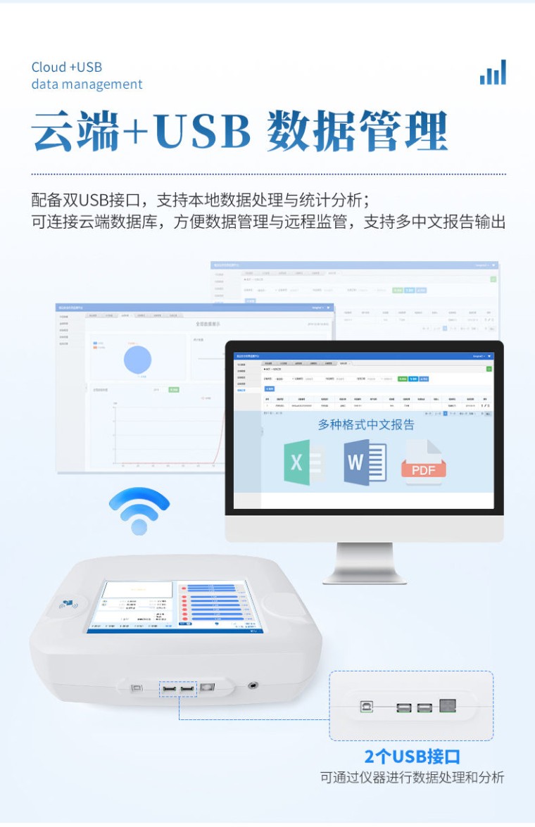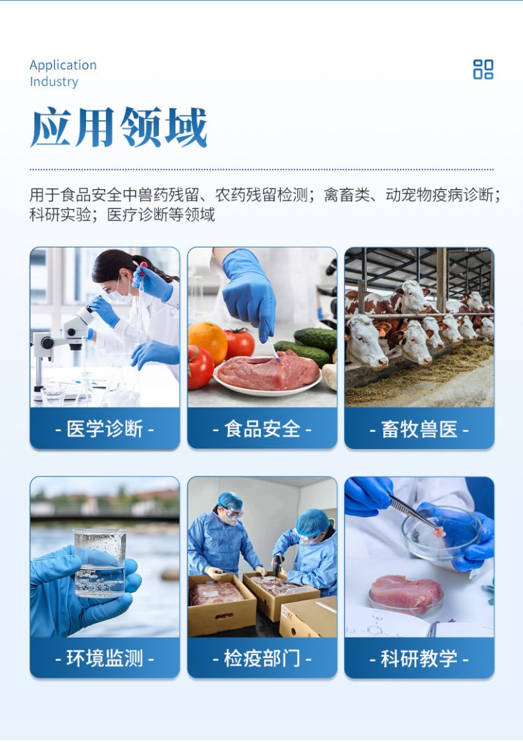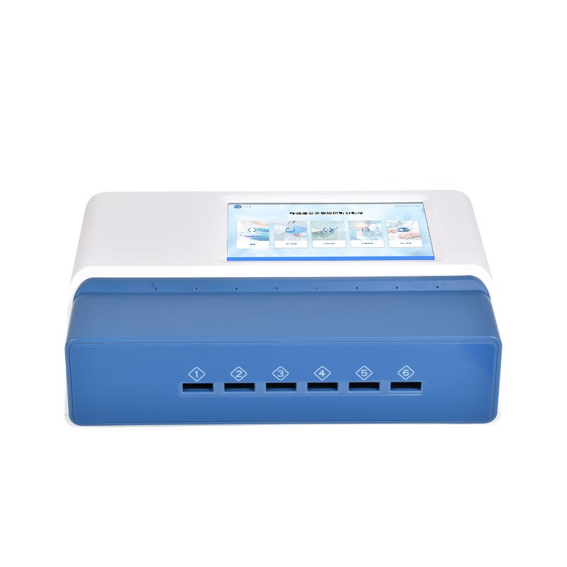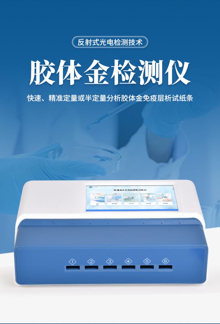 一、仪器简介 本仪器是一款专为快速、精准定量或半定量分析胶体金免疫层析试纸条(GICA)设计的高性能光学检测设备。仪器集成了先进的光电检测技术、智能数据处理平台、高通量设计及强大的网络功能,通过高稳定性光学系统实现对免疫层析结果的可靠读取、智能分析与即时报告输出。其坚固耐用的设计和便捷的操作流程,使其成为实验室研究与现场快速检测(POCT)的核心仪器之一。 二、应用范围 1、食品安全: 致病微生物、农兽药残留、生物毒素等快速筛查。 2、畜牧兽医: 动物疫病诊断、动物源性安全指标检测。 3、环境监测: 水质、土壤特定污染物筛查。 4、科研与生物安全: 免疫层析实验定量分析、生物因子检测。 5、其他领域: 所有使用胶体金免疫层析试纸条的场景。 三、仪器特点 1、Android触控系统结合大尺寸高清屏幕,界面友好,操作简单流畅,无需外接设备; 2、6通道可以同时检测不同项目,显著提升检测效率,满足批量样本快速处理需求; 3、内置质控功能,且支持二维码扫描录入样本信息,避免人工错误 4、8G超大容量内存,支持按日期灵活查询、预览、删除结果,并生成多样化专业报告。 5、内置热敏打印机,检测完成即可现场打印标准报告,提升工作效率。 6、关键部件实时自诊断功能,保障仪器长期稳定运行。 7、高速有线/无线网络及蓝牙,构建完善的数据监控平台,实现数据实时上传、远程查询、统计分析和监管协同。 8、丰富的接口设计,轻松连接电脑、U盘、网络及上位机系统,支持U盘导出。 9、孵育模块为特定试纸条反应提供精确温度环境。 10、流线型结构,紧凑轻便,兼顾实验室耐用性与检测需求。 四、技术参数 1、7英寸电容式触摸屏,分辨率:1920 x 1200,内部存储:1+8GB 2、操作系统:Android 7.1 3、检测方式:反射式光电检测 4、准确性:误差值≤ 5% 5、稳定性:SW(波动系数)≤5% 6、重复性:CV(变异系数)≤3% 7、分辨率:0.001 8、检测通道:6通道检测 9、检测时间:< 5秒 (单卡及多联卡);可对样本进行胶体金定性/半定量检测。 10、检测结果:报告出检测项目、被测物质的浓度、检测单位、被检查单位、检验员、检测时间、检测限等信息可在触摸屏上显示,可通过仪器内置打印机输出 11、数据传输:WiFi、蓝牙、USB、射频读卡、外置扫码模块 12、数据处理:可通过通讯端口进行数据汇总、上传监管平台等 13、项目拓展:支持检测项目拓展功能 14、检测通道孵育检测一体,温度范围 :室温 +5℃ ~ 60℃ 15、打印机:热敏打印机(热敏打印纸:57*20mm) 16、接口:USB接口:2个;USB-B接口:1个;LAN接口:1个 ;DC电源接口:5.5/2.1mm 17、电源:输入:AC 220V ± 20V, 50Hz ± 1Hz;输出:DC 12V, 5A 18、主机尺寸 :308mm*205mm*91mm 19、主机重量:约 2.7kg