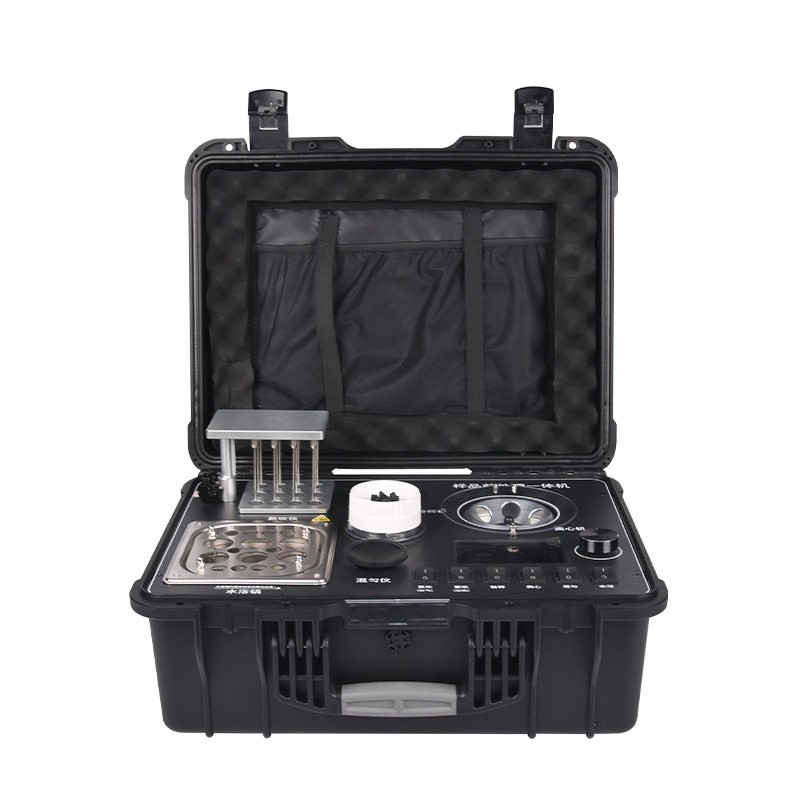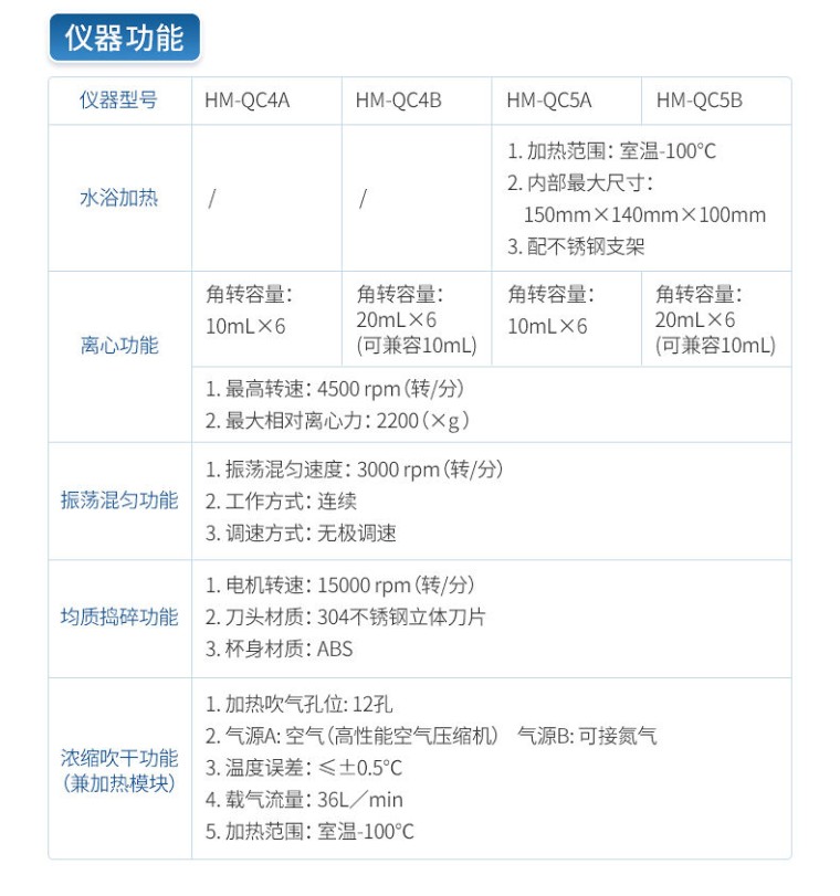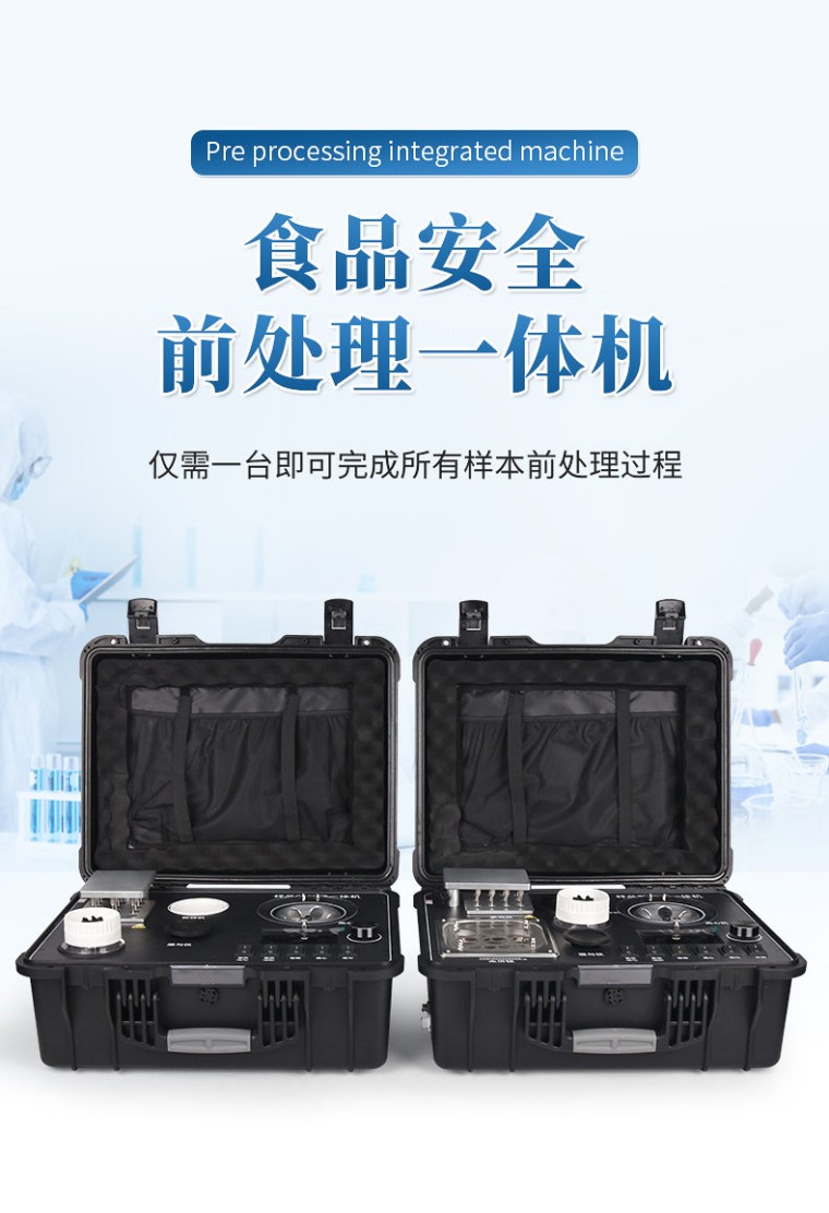 一、产品简介 应国内用户的实际需求,自行研制开发的新型仪器——QC05型样品前处理一体机。样品前处理集成箱将样本前处理过程中样品浓缩、水浴恒温、离心分层、均质、振荡混匀等步骤所需设备进行集成,仅需一台样品前处理集成箱设备即可完成所有样本前处理过程,并且方便携带,不仅适用于现场检测使用,还可用于色谱、质谱等分析样品的纯化和制备。 二、产品特点 1、功能紧凑,集成五种样品前处理常用的功能,完成样品一站式处理。 2、结构稳固,机箱采用高品质工程塑料,具备优秀的抗冲击性、耐腐蚀性、便携性。 3、操作稳定,机器采用五寸全彩色液晶屏,功能指示性强,用户操作均为实体开关,杜绝佩戴手套和液体喷溅时的操作失效。 三、技术参数 仪器尺寸:520×415×225mm 离心功能 1、最高转速:4500 rpm(转/分) 2、最大相对离心力:2200(×g) 3、角转容量:20mLx6 (可兼容10mL) 振荡混匀功能 1、 振荡混匀速度:3000 rpm(转/分) 2、 工作方式:连续 3、 调速方式:无极调速 均质捣碎功能 1、 电机转速:15000 rpm(转/分) 2、 刀头材质:304不锈钢立体刀片 3、 杯身材质:ABS 浓缩吹干功能(兼加热模块) 1、 加热吹气孔位: 12孔 2、 气源A: 空气(高性能空气压缩机) 气源B: 可接氮气 3、 温度误差:≤±0.5℃ 4、 载气流量:36L/min 5、 加热范围:室温-100℃ 水浴加热 1、 加热范围:室温-100℃ 2、 内部最大尺寸:150mmX140mmX100mm 3、 配不锈钢支架 四、发货配件 序号 名称 数量 1 主机 1 台 2 20mL离心管 6 支 3 20mL离心管托管 6 支 4 三插电源线 1 个 5 说明书 1 份 6 合格证 1 份 7 装箱单 1 份 8 仪器箱 1只