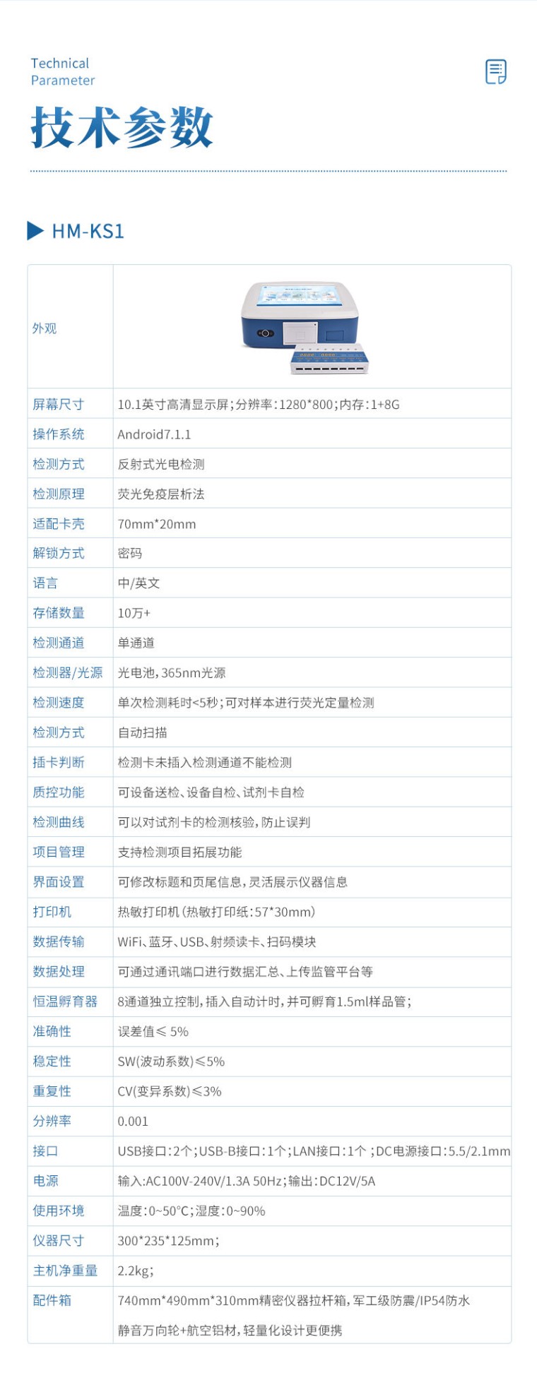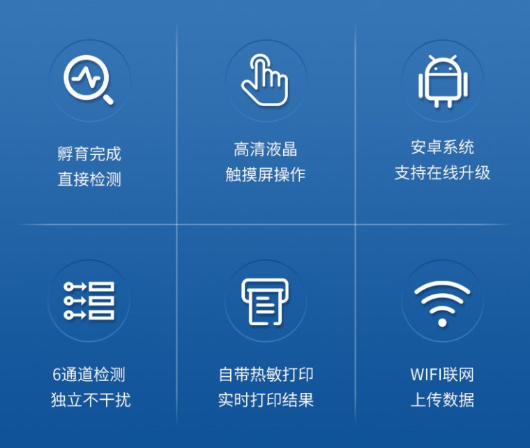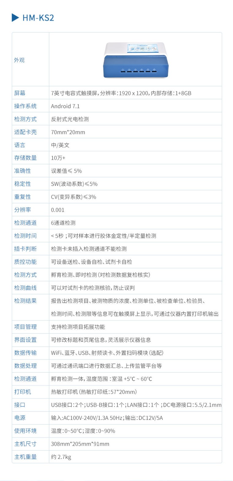 一、产品简介: 荧光抗生素定量检测仪采用荧光定量快速检测原理,主要检测水产品中的抗生素等;该设备广泛应用于农贸市场、海鲜市场、食品肉产品深加工企业、食药监局、卫生部门、水产养殖场、检验检疫部门、农业部门、第三方机构等单位使用。 二、产品特点: 1、智能人机交互:安卓智能操作系统,7英寸高清彩色触摸屏,操作简单直观; 2、操作系统:内置Android操作系统,运行流畅,支持在线升级,可WIFI联网; 3、检测原理:采用荧光免疫层析原理,准确度高,读数更精确; 4、检测稳定性极高:全部采用进口荧光微球,颗粒均一,保证仪器的运行稳定;从根源解决行业内出现批次内、批次间重现性波动的问题; 5、集成化设计:孵育和检测统一集成,(10分钟)反应完成直接读取结果,排除人为操作带来的误差; 6、多通道设计:6个独立检测通道,可同时进行一种或多种项目的检测,检测效率高,且互不干扰; 7、内置曲线:仪器出厂内置定量标准曲线,检测过程中无需使用标准品重做曲线,节省检测成本,也避免了操作人员与真菌毒素的接触,保护操作人员的安全; 8、标准曲线升级:远程OTA升级 9、数据传输:两个USB Type-A接口,一个USB Type-B接口,一个直连网口,内置wifi连接;支持各种条件下的多方式数据传输; 10、数据存储:存储数量10万+条、内置查询、统计、批量数据处理等功能; 11、结果显示:除内置数据查看,仪器自带热敏打印机,可实时打印检测结果; 12、3分钟工作状态(37℃),封闭系统,不受外界环境(光、热)干扰; 13、配备800×340×540mm精密仪器拉杆箱,**级防震/IP54防水,静音万向轮+航空铝材,轻量化设计更便携。 三、技术参数: 1、7英寸电容式触摸屏,分辨率:1920 x 1200,内部存储:1+8GB 2、操作系统:Android 7.1 3、检测方式:反射式光电检测 4、适配卡壳:70mm*20mm 5、语言:中/英文 6、存储数量:10万+ 7、准确性:误差值≤ 5% 8、稳定性:SW(波动系数)≤5% 9、重复性:CV(变异系数)≤3% 10、分辨率:0.001 11、检测通道:6通道检测 12、检测时间:< 5秒 ;可对样本进行胶体金定性/半定量检测。 13、插卡判断:检测卡未插入检测通道不能检测 14、内置质控功能,可设备送检、设备自检、试剂卡自检 15、检测方式:孵育检测、即时检测(对检测数据复检核实) 16、检测曲线:可以对试剂卡的检测核验,防止误判 17、检测结果:报告出检测项目、被测物质的浓度、检测单位、被检查单位、检验员、检测时间、检测限等信息可在触摸屏上显示,可通过仪器内置打印机输出 18、项目管理:支持检测项目拓展功能 19、界面设置:可修改标题和页尾信息,灵活展示仪器信息 20、数据传输:WiFi、蓝牙、USB、射频读卡、外置扫码模块(选配) 21、数据处理:可通过通讯端口进行数据汇总、上传监管平台等 22、检测通道孵育检测一体,温度范围 :室温 +5℃ ~ 60℃ 23、打印机:热敏打印机(热敏打印纸:57*20mm) 24、接口:USB接口:2个;USB-B接口:1个;LAN接口:1个 ;DC电源接口:5.5/2.1mm 25、电源:输入:AC100V-240V/1.3A 50Hz;输出:DC12V/5A 30、使用环境:温度:0~50℃;湿度:0~90% 26、主机尺寸 :308mm*205mm*91mm 27、主机重量:约 2.7kg 四、检测项目: