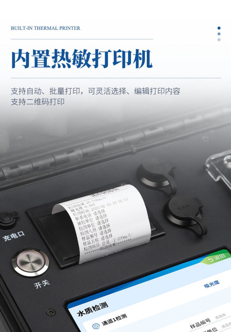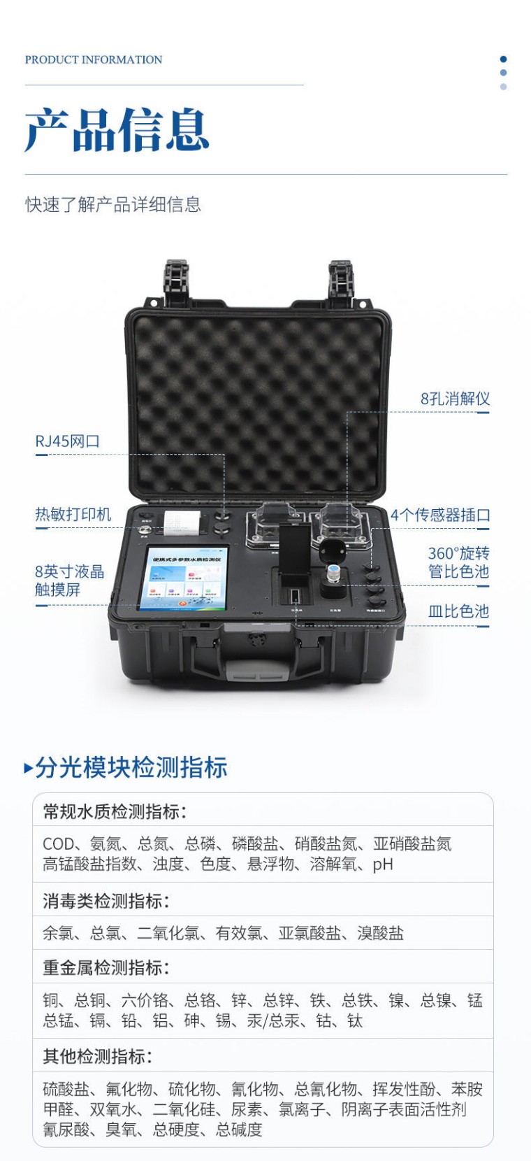 一、设备简介: 多功能水质检测仪采用高强度PVC工程塑料手提箱设计,消解检测一体式设计,其中消解模块具备双温区功能,检测部分同时具备360°旋转比色管检测和比色皿检测,安卓智能操作系统,8英寸高清液晶触摸屏,光纤检测技术,进口光源,内置大容量锂电池,便携多参数水质检测仪具有性能稳定、测量准确、测定范围广、功能强大、操作简单等特点。 二、应用广泛: 适用于生活污水、工业废水、地下水、地表水中多种水质污染物的检测;运用于水质检测实验室、市政、污水处理厂、环境监测站及教育科研高校、电厂、疾控中心、造纸电镀、水产养殖、生物制药、石化、煤炭、冶金、纺织、食品等行业的水质分析。 三、检测项目: 常规水质检测指标:COD、氨氮、总氮、总磷、磷酸盐、硝酸盐氮、亚硝酸盐氮、高锰酸盐指数、浊度、色度、悬浮物、溶解氧、pH; 消毒类检测指标:余氯、总氯、二氧化氯、有效氯、亚氯酸盐、溴酸盐; 重金属检测指标:铜、总铜、六价铬、总铬、锌、总锌、铁、总铁、镍、总镍、锰、总锰、镉、铅、铝、砷、锡、汞/总汞、钴、钛; 其他检测指标:硫酸盐、氟化物、硫化物、氰化物、总氰化物、挥发性酚、苯胺、甲醛、双氧水、二氧化硅、尿素、氯离子、阴离子表面活性剂、氰尿酸、臭氧、总硬度、总碱度; 四、功能特点: 1、采用安卓智能系统7.1.1版本,更流畅的交互体验,运转速度更快速,稳定性更强。 2、双比色检测系统,同时支持预制试管比色和比色皿比色; 3、比色管检测部分采用360°精密旋转装置,有效保证精度,稳定性10倍提升。 4、内置双温区8孔消解仪,左右温区独立控制,可对COD总磷总氮等进行快速消解。 5、便携一体式检测设备,内置大容量锂电池,可一机实现户外水样消解、测定。 6、内置热敏打印机,支持自动、批量打印,可灵活选择、编辑打印内容,支持二维码打印。 7、仪器具有WIFi无线、4G远传和RJ45有线联网功能,将数据上传; 8、配备数据云平台,可接收仪器的检测数据,应用于线上数据存储、长短期动态分析; 9、用户可自建标样曲线,提供系数曲线和样品曲线的自定义标定。 10、仪器内置教学演示视频,用户可边看视频边操作实验,更容易上手。 11、检测、消解可同时进行,大大提高效率。 12、可根据用户要求定制检测项目。 13、配备工厂预制试剂耗材,无需反复移液和配制浓硫酸,只需要在试管内加入水质样品即可进行检测。 14、内置人性化置顶功能,可将常测定指标进行置顶,置顶后显示在项目列表最上方,无需每次繁琐找取; 15、仪器具有GPS定位功能,实时实地显示检测点的经纬度信息和**位置信息,经纬度信息会跟随数据保存到仪器内,亦可将经纬度信息上传至云平台; 五、技术参数: 比色方式:预制比色试管16mm;比色皿50mm(含)以下; 操作系统:安卓智能操作系统; 屏幕显示:8英寸高清触摸屏,1024*768分辨率; 示值误差:≤±5%; 重复性:<0.5%; 稳定性:<0.5%; 分辨率:0.001; 光学稳定性:≤±0.001Abs/20分钟(10万小时寿命); 自动校准:仪器具有自动校准功能; 打印方式:微型热敏打印机; 操作视频:≥4个项目的操作步骤演示视频; 上传功能:可无线联网上传数据至云平台,可在手机及电脑端实时查看; 电池容量:锂电池48V8AH; 满电使用时间:以COD为例,消解检测同时进行,可连续使用6小时以上; 数据传输:USB、RJ45、WIFI; 消解数量:8个,双温区独立控制; 加热速度:10min内升至165℃; 消解温度:室温-200℃可调; 消解容量:0-10ml; 控温模式:智能PID温控; 控温精度:±0.5℃; 预设消解模式:COD、总磷、总氮、高锰酸盐、硫酸盐、甲醛; 自定义消解模式:4条; 数据储存:1000万组,可自由调用查看; 仪器电源:DC48V2A; 仪器尺寸:430mmx350mmx200mm; 仪器重量:11kg; 仪器包装尺寸:510*370*375mm 试剂包装尺寸:470*320*250mm 仪器包装重量:15kg 试剂包装重量:3.1kg