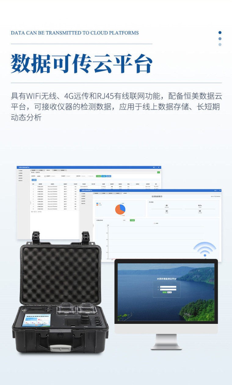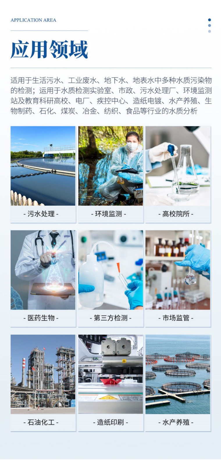 一、设备简介: 便携多参数水质检测仪采用高强度PVC工程塑料手提箱设计,消解检测一体式设计,其中消解模块具备双温区功能,检测部分同时具备360°旋转比色管检测和比色皿检测,安卓智能操作系统,8英寸高清液晶触摸屏,光纤检测技术,进口光源,内置大容量锂电池,便携多参数水质检测仪具有性能稳定、测量准确、测定范围广、功能强大、操作简单等特点。 二、应用广泛: 适用于生活污水、工业废水、地下水、地表水中多种水质污染物的检测;运用于水质检测实验室、市政、污水处理厂、环境监测站及教育科研高校、电厂、疾控中心、造纸电镀、水产养殖、生物制药、石化、煤炭、冶金、纺织、食品等行业的水质分析。 三、检测项目: <�分光模块检测指标> 常规水质检测指标:COD、氨氮、总氮、总磷、磷酸盐、硝酸盐氮、亚硝酸盐氮、高锰酸盐指数、浊度、色度、悬浮物、溶解氧、pH; 消毒类检测指标:余氯、总氯、二氧化氯、有效氯、亚氯酸盐、溴酸盐; 重金属检测指标:铜、总铜、六价铬、总铬、锌、总锌、铁、总铁、镍、总镍、锰、总锰、镉、铅、铝、砷、锡、汞/总汞、钴、钛; 其他检测指标:硫酸盐、氟化物、硫化物、氰化物、总氰化物、挥发性酚、苯胺、甲醛、双氧水、二氧化硅、尿素、氯离子、阴离子表面活性剂、氰尿酸、臭氧、总硬度、总碱度; <�传感器模块检测指标> pH传感器、ORP传感器、溶解氧传感器(荧光法)、余氯传感器(恒压法)、电导率传感器、盐度传感器、臭氧传感器、浊度传感器、硬度传感器、悬浮物传感器、污泥浓度传感器、COD传感器、氨氮传感器、叶绿素传感器、蓝绿藻传感器、水中油传感器、CDOM有色可溶性有机物传感器等几十余种; 四、功能特点: 1、采用安卓智能系统7.1.1版本,更流畅的交互体验,运转速度更快速,稳定性更强。 2、双比色检测系统,同时支持预制试管比色和比色皿比色; 3、比色管检测部分采用360°精密旋转装置,有效保证精度,稳定性10倍提升。 4、内置双温区8孔消解仪,左右温区独立控制,可对COD总磷总氮等进行快速消解。 5、便携一体式检测设备,内置大容量锂电池,可一机实现户外水样消解、测定。 6、内置热敏打印机,支持自动、批量打印,可灵活选择、编辑打印内容,支持二维码打印。 7、仪器具有WIFi无线、4G远传和RJ45有线联网功能,将数据上传; 8、配备数据云平台,可接收仪器的检测数据,应用于线上数据存储、长短期动态分析; 9、用户可自建标样曲线,提供系数曲线和样品曲线的自定义标定。 10、内置传感器检测模块,可同时插入4个不同指标传感器同时检测,插入即测,浓度直读。 11、传感器测量支持定时储存或手动储存,并可打印数据; 12、仪器内置教学演示视频,用户可边看视频边操作实验,更容易上手。 13、检测、消解、传感器测量可同时进行,大大提高效率。 14、可根据用户要求定制检测项目。 15、配备工厂预制试剂耗材,无需反复移液和配制浓硫酸,只需要在试管内加入水质样品即可进行检测。 16、内置人性化置顶功能,可将常测定指标进行置顶,置顶后显示在项目列表最上方,无需每次繁琐找取; 17、仪器具有GPS定位功能,实时实地显示检测点的经纬度信息和**位置信息,经纬度信息会跟随数据保存到仪器内,亦可将经纬度信息上传至云平台; 五、技术参数: 比色方式:预制比色试管16mm;比色皿50mm(含)以下; 操作系统:安卓智能操作系统; 屏幕显示:8英寸高清触摸屏,1024*768分辨率; 示值误差:≤±5%; 重复性:<0.5%; 稳定性:<0.5%; 分辨率:0.001; 光学稳定性:≤±0.001Abs/20分钟(10万小时寿命); 自动校准:仪器具有自动校准功能; 打印方式:微型热敏打印机; 操作视频:≥4个项目的操作步骤演示视频; 上传功能:可无线联网上传数据至云平台,可在手机及电脑端实时查看; 电池容量:锂电池48V8AH; 满电使用时间:以COD为例,消解检测同时进行,可连续使用6小时以上; 数据传输:USB、RJ45、WIFI; 传感器接口:4个,可同时插入,同时检测,可定时储存或手动储存; 消解数量:8个,双温区独立控制; 加热速度:10min内升至165℃; 消解温度:室温-200℃可调; 消解容量:0-10ml; 控温模式:智能PID温控; 控温精度:±0.5℃; 预设消解模式:COD、总磷、总氮、高锰酸盐、硫酸盐、甲醛; 自定义消解模式:4条; 数据储存:1000万组,可自由调用查看; 仪器电源:DC48V2A; 仪器尺寸:430x350x200mm; 仪器重量:11kg; 仪器包装尺寸:510*390*375mm 试剂包装尺寸:470*320*250mm 仪器包装重量:16kg 试剂包装重量:3.1kg