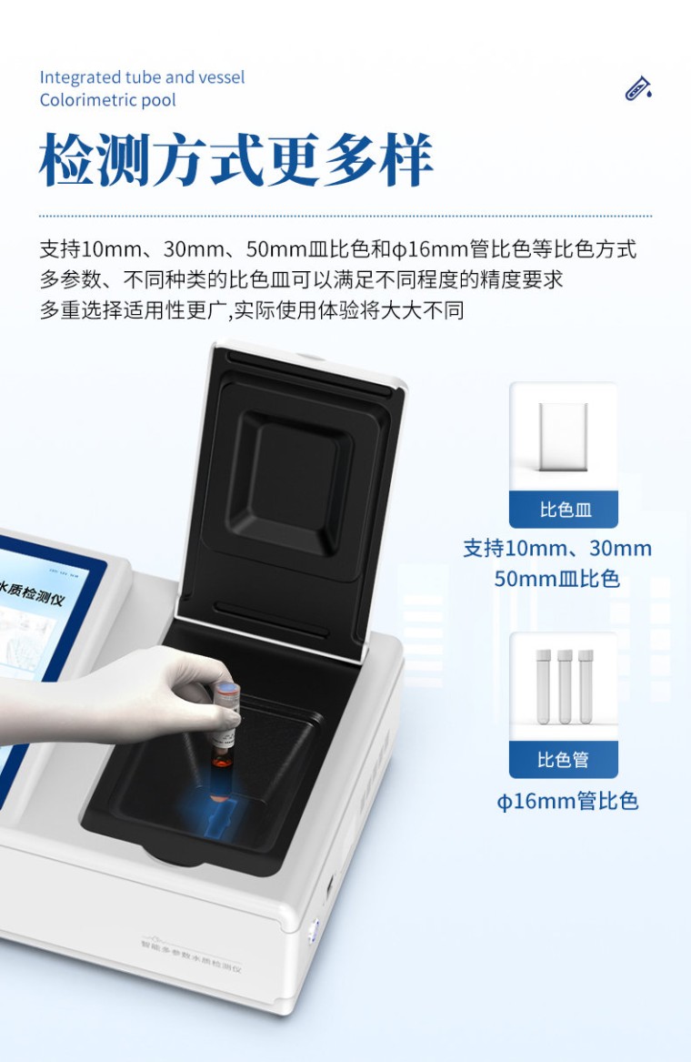 一、设备简介: 智能COD测定仪是依据《快速消解分光光度法(HJ/T 399-2007)》设计制造,主要检测水质中COD的含量;本仪器兼具智能数据分析功能,图表、列表显示数据,分析一目了然;高清晰度彩色液晶触摸显示屏,Android智能操作系统,中文显示界面,中英文键盘,人性化操作,使用更简单。 二、应用广泛: 能够广泛的应用于各种行业(工业废水、城市污水、生活污水及江湖流域地表水)废水的检测,可适合不同用户的多种需求,可在化工、石油、焦化、造纸、冶金、酿造、医药等工业废水及各种生活污水监测应用。 三、功能特点: 1、采用全新安卓7.1.1智能操作系统,人性化中文操作界面,运转速度更快速,稳定性更强。 2、10.1英寸液晶触摸屏显示,人性化中文操作界面,读数直观、简单。 3、采用精密比色池设计,使用光源一致,可以解决由于光源误差带来的检测结果误差问题,检测结果更加精准。 4、光源采用进口超高亮发光二极管,光源亮度可以自动调节与校准。 5、支持10mm、30mm、50mm皿比色和φ16mm管比色等比色方式,多元选择,确保测量的准确性; 6、具有无线通讯功能,支持WIFI、RJ45、手机热点联网传输,检测数据亦可通过U盘导出; 7、多功能样品管理,可对样品进行中英文命名,方便样品记录和数据存储; 8、仪器可**存储800万组数据,为方便大量数据查找,可通过时间检索,并随意选择分析; 9、支持HDMI输出,方便用户培训、讲解、及大屏展示。 10、仪器带有监管云平台,数据可通过局域网和互联网上传,亦可对接上传至环境监管部门平台。 11、内置热敏行式打印机,打印纸上的内容可自由选择(包括二维码打印); 12、交流220V,可选配6ah大容量充电锂电池,方便户外流动测试; 13、后期产品固件可升级。 四、技术参数: 示值误差:≤±5%; 仪器稳定性:<0.5%; 仪器重复性:<0.5%; 光化学稳定性:20min内数值漂移≤0.002A(10万小时寿命); 检测方法:水质化学需氧量快速检测法; 参考标准:HJ/T399-2007; 检测量程:0-15000mg/L(分段); 检测下限:3mg/L; 五、物理参数 操作系统:Android 7.1.1 智能操作系统; 显示屏:10.1英寸高清晰度彩色液晶触摸屏; 网络接口:USB2.0、WiFi、蓝牙、热点、RJ45; 操作界面:中文/英文(出厂可选); 比色方式:比色管、比色皿; 打印机:热敏行式打印机; 通讯接口:USB2.0; 供电方式:交流220V,可选配大容量充电锂电池; 数据导出格式:Excel表格; 云平台:仪器带有监管平台,连接网络,检测结果直接传至环境安全监管平台; 仪器尺寸:444 x 303 x 173 mm; 仪器重量:5.2kg(不含适配器或充电器及电池); 六:环境及工作参数 环境温度:(5 - 40)℃; 环境湿度:相对湿度<85%(无冷凝); 额定功率:20W 工作电源:AC220V±10%/50Hz; 可配置:大容量锂电池。