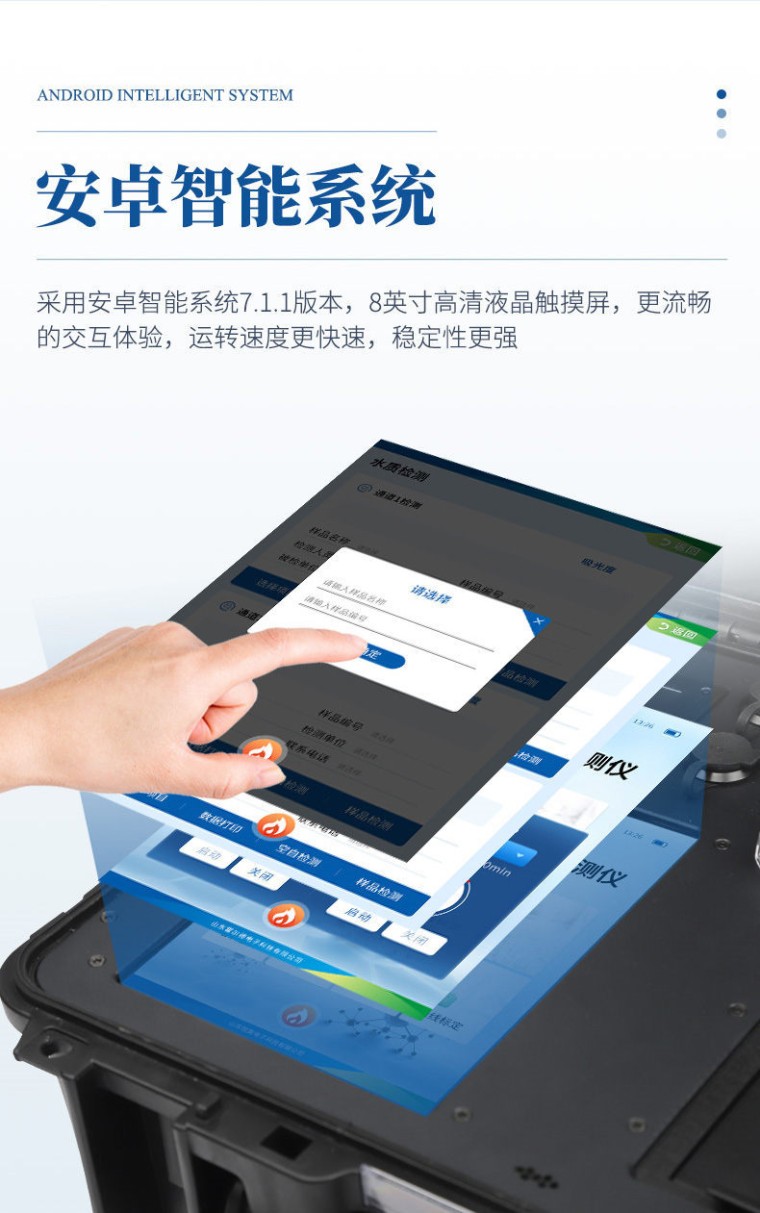 便携式COD氨氮总磷检测仪采用高强度PVC工程塑料手提箱设计,消解检测一体式设计,其中消解模块具备双温区功能,检测部分同时具备360°旋转比色管检测和比色皿检测,安卓智能操作系统,8英寸高清液晶触摸屏,光纤检测技术,进口光源,内置大容量锂电池,便携多参数水质检测仪具有性能稳定、测量准确、测定范围广、功能强大、操作简单等特点。 广泛应用: 适用于生活污水、工业废水、地下水、地表水中多种水质污染物的检测;运用于水质检测实验室、市政、污水处理厂、环境监测站及教育科研高校、电厂、疾控中心、造纸电镀、水产养殖、生物制药、石化、煤炭、冶金、纺织、食品等行业的水质分析。 功能特点: 1、采用安卓智能系统7.1.1版本,更流畅的交互体验,运转速度更快速,稳定性更强。 2、双比色检测系统,同时支持预制试管比色和比色皿比色; 3、比色管检测部分采用360°精密旋转装置,有效保证精度,稳定性10倍提升。 4、内置双温区8孔消解仪,左右温区独立控制,可对COD总磷总氮等进行快速消解。 5、便携一体式检测设备,内置大容量锂电池,可一机实现户外水样消解、测定。 6、内置热敏打印机,支持自动、批量打印,可灵活选择、编辑打印内容,支持二维码打印。 7、仪器具有WIFi无线、4G远传和RJ45有线联网功能,将数据上传; 8、配备霍尔德数据云平台,可接收仪器的检测数据,应用于线上数据存储、长短期动态分析; 9、用户可自建标样曲线,提供系数曲线和样品曲线的自定义标定。 10、仪器内置教学演示视频,用户可边看视频边操作实验,更容易上手。 11、检测、消解可同时进行,大大提高效率。 12、可根据用户要求定制检测项目。 13、配备工厂预制试剂耗材,无需反复移液和配制浓硫酸,只需要在试管内加入水质样品即可进行检测。 14、内置人性化置顶功能,可将常测定指标进行置顶,置顶后显示在项目列表最上方,无需每次繁琐找取; 15、仪器具有GPS定位功能,实时实地显示检测点的经纬度信息和**位置信息,经纬度信息会跟随数据保存到仪器内,亦可将经纬度信息上传至云平台; 技术参数: 1、COD 检测方法:水质化学需氧量快速检测法; 参考标准:HJ/T399-2007; 检测量程:10-15000mg/L(分段) ; 2、氨氮 参考标准:水质 氨氮的测定 纳氏试剂分光光度法 /水质 氨氮的测定 水杨酸分光光度法 标准方法:HJ535-2009/HJ536-2009 检测量程:0.2-200mg/L(分段)/ 0.025-25mg/L(分段) 3、总磷 检测方法:水质总磷的测定钼酸铵分光光度法 参考标准:GB11893-89; 检测量程:0.02-30mg/L(分段); 比色方式:预制比色试管16mm;比色皿50mm(含)以下; 操作系统:安卓智能操作系统; 屏幕显示:8英寸高清触摸屏,1024*768分辨率; 示值误差:≤±5%; 重复性:<0.5%; 稳定性:<0.5%; 分辨率:0.001; 光学稳定性:≤±0.001Abs/20分钟(10万小时寿命); 自动校准:仪器具有自动校准功能; 打印方式:微型热敏打印机; 操作视频:≥4个项目的操作步骤演示视频; 上传功能:可无线联网上传数据至云平台,可在手机及电脑端实时查看; 电池容量:锂电池48V8AH; 满电使用时间:以COD为例,消解检测同时进行,可连续使用6小时以上; 数据传输:USB、RJ45、WIFI; 消解数量:8个,双温区独立控制; 加热速度:10min内升至165℃; 消解温度:室温-200℃可调; 消解容量:0-10ml; 控温模式:智能PID温控; 控温精度:±0.5℃; 预设消解模式:COD、总磷、总氮、高锰酸盐、硫酸盐、甲醛; 自定义消解模式:3条; 数据储存:1000万组,可自由调用查看; 仪器电源:DC48V2A; 仪器尺寸:430mmx350mmx200mm; 仪器重量:11kg;