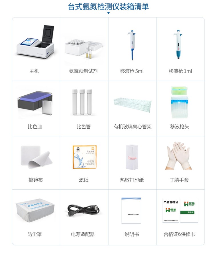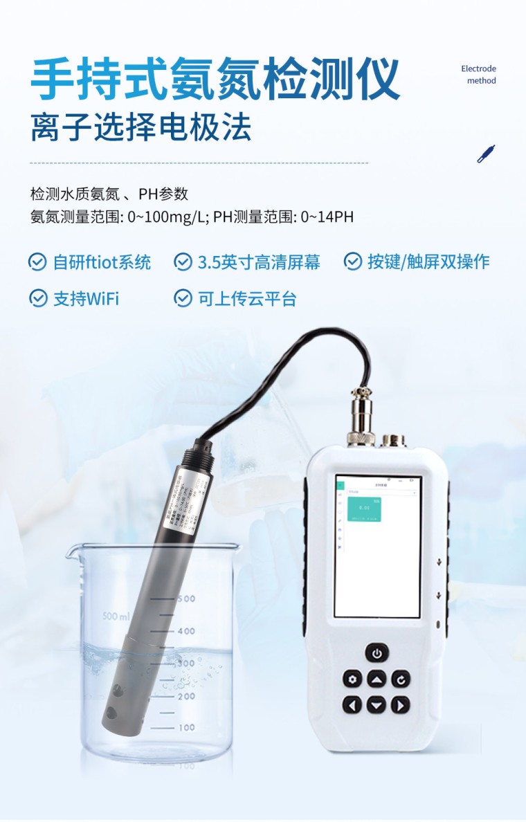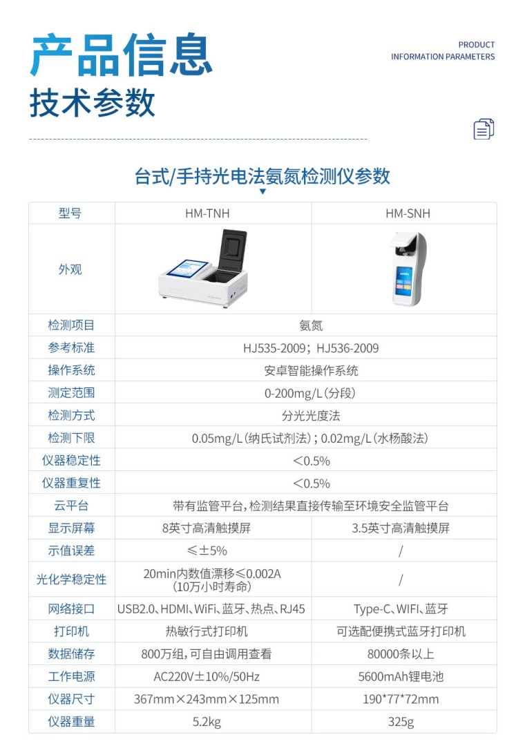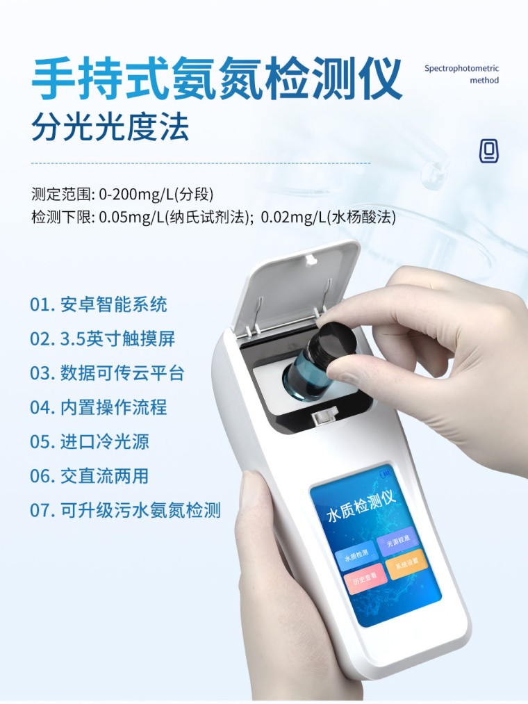 一、设备简介: 智能氨氮快速检测仪主要检测水体中的氨氮含量;设备内置多个光源,对应不同的检测波长,可同时满足纳氏试剂法和水杨酸法检测水体中的氨氮含量。纳氏试剂法参考环境标准HJ 535-2009 《水质 氨氮的测定 纳氏试剂分光光度法》,水杨酸法参考环境标准HJ 536-2009 《水质 氨氮的测定 水杨酸分光光度法》。本仪器兼具智能数据分析功能,图表、列表显示数据,分析一目了然;高清晰度彩色液晶触摸显示屏,Android智能操作系统,中文显示界面,中英文键盘,人性化操作,使用更简单。 二、应用广泛: 能够广泛的应用于各种行业(工业废水、城市污水、生活污水及江湖流域地表水)废水的检测,可适合不同用户的多种需求,可在化工、石油、焦化、造纸、冶金、酿造、医药等工业废水及各种生活污水监测应用。 三、功能特点: 1、采用全新安卓7.1.1智能操作系统,人性化中文操作界面,运转速度更快速,稳定性更强。 2、10.1英寸液晶触摸屏显示,人性化中文操作界面,读数直观、简单。 3、采用精密比色池设计,使用光源一致,可以解决由于光源误差带来的检测结果误差问题,检测结果更加精准。 4、光源采用进口超高亮发光二极管,光源亮度可以自动调节与校准。 5、支持10mm、30mm、50mm皿比色和φ16mm管比色等比色方式,多元选择,确保测量的准确性; 6、具有无线通讯功能,支持WIFI、RJ45、手机热点联网传输,检测数据亦可通过U盘导出; 7、多功能样品管理,可对样品进行中英文命名,方便样品记录和数据存储; 8、仪器可**存储800万组数据,为方便大量数据查找,可通过时间检索,并随意选择分析; 9、仪器带有监管云平台,数据可通过局域网和互联网上传,亦可对接上传至环境监管部门平台。 10、内置热敏行式打印机,打印纸上的内容可自由选择(包括二维码打印); 11、交流220V,可选配6ah大容量充电锂电池,方便户外流动测试; 12、内置教学演示视频,用户可一边看仪器内操作视频,一边进行实验操作,更易上手。 13、后期产品固件可升级。 四、技术参数: 示值误差:≤±5%; 仪器稳定性:<0.5%; 仪器重复性:<0.5%; 光化学稳定性:20min内数值漂移≤0.002A(10万小时寿命); 检测方法:纳氏试剂分光光度法;水杨酸分光光度法 参考标准:HJ535-2009; HJ536-2009 测定范围:0-200mg/L(分段); 检测下限:0.05mg/L(纳氏试剂法); 0.02mg/L(水杨酸法); 五、物理参数: 操作系统:Android 7.1.1 智能操作系统; 显示屏:10.1英寸高清晰度彩色液晶触摸屏; 网络接口:USB2.0、WiFi、蓝牙、热点、RJ45; 操作界面:中文/英文(出厂可选); 比色方式:比色管、比色皿; 打印机:热敏行式打印机; 通讯接口:USB2.0; 供电方式:交流220V,可选配大容量充电锂电池; 数据导出格式:Excel表格; 云平台:仪器带有监管平台,连接网络,检测结果直接传至环境安全监管平台; 仪器尺寸:444 x 303 x 173 mm; 仪器重量:5.2kg(不含适配器或充电器及电池); 六:环境及工作参数: 环境温度:(5 - 40)℃; 环境湿度:相对湿度<85%(无冷凝); 额定功率:20W 工作电源:AC220V±10%/50Hz; 可配置:大容量锂电池。