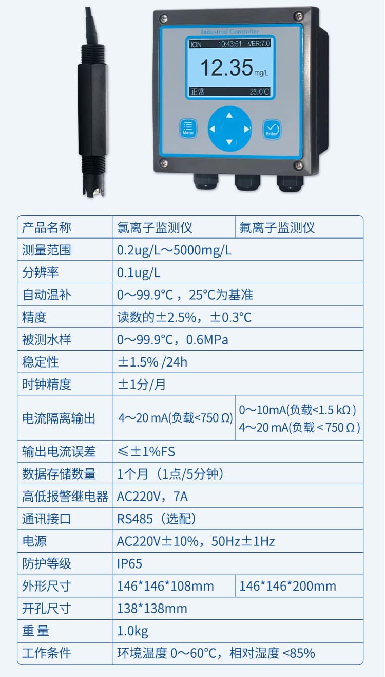 氯离子在线监测仪由传感器和二次表两部分组成。可广泛监测江湖水、地表水、自来水厂、污水处理厂、企业废水排放的水体中氯离子浓度连续监测。随机提供多种常用离子模式如:H+、Ag+、Na+、K+、NH4+、cl-、F-、NO3-、BF4-、CN-、Cu2+、Pb2+等,并支持用户自定义离子模式,测量其他离子。必须选择相对应的离子电极,才能测量对应的离子。 主要特点 中文液晶显示,中文菜单式,中文记事。 微机化: 采用高性能CPU芯片、高精度AD转换技术和SMT贴片技术,完成多参数测量、温度补偿、仪表自检,精度高,重复性好。响应迅速、测量准确、稳定。 高可靠性:单板结构,触摸式按键,无开关旋钮和电位器。 防水防尘设计:防护等级IP65,适宜户外使用。 电磁兼容性(EMC/RFI)设计:按欧洲标准EN50081/50082设计制造。 报警功能:报警信号隔离输出,报警上、下限可任意设定,报警滞后撤消。 历史曲线:连续记录一个月数据,五分钟一个点。记事本功能:记载200条信息。 工业控制式看门狗:确保仪表不会死机。密码管理:参数设置和维护均有密码保护。 可离线测量:代替实验室钠表,可测标液检查仪器的性能。使用费用低,维护量小。 技术指标 1、测量范围: 氯离子浓度值:0~5000 mg/L, 分度值0.01mg/L; 温 度: 0~99.9℃, 分度值 0.1℃; 电位值:–1999~+1999mV, 分度值 0.1mV; 2、精度:氯离子浓度值: 读数的±2.5% ; 温度:±0.5℃(0~60.0℃) 3、自动温度补偿范围: 0~99.9℃ ,25℃为基准 4、精 度: 读数的±2.5%,±0.3℃ 5、被测水样: 0~99.9℃,0.6Mpa 6、电子单元自动温度补偿误差:±1.5% 7、电子单元重复性误差: 读数的±2.5% 8、稳 定 性 : ±1.5% /24h 9、时钟精度: ±1分/月 10、电流隔离输出: 4~20 mA(负载<750 Ω) 11、输出电流误差: ≤±1%FS 12、数据存储数量: 1个月(1点/5分钟) 13、高低报警继电器: AC220V,7A 14、通讯接口: RS485(选配) 15、电 源: AC220V±10%,50Hz±1Hz;可选配DC24V供电 16、防护等级: IP65 17、外形尺寸: 146(长)×146(宽)×108(深)mm。 开孔尺寸: 138×138 mm 18、重 量: 1.0kg 19、工作条件: 环境温度 0~60℃,相对湿度 <85%<>