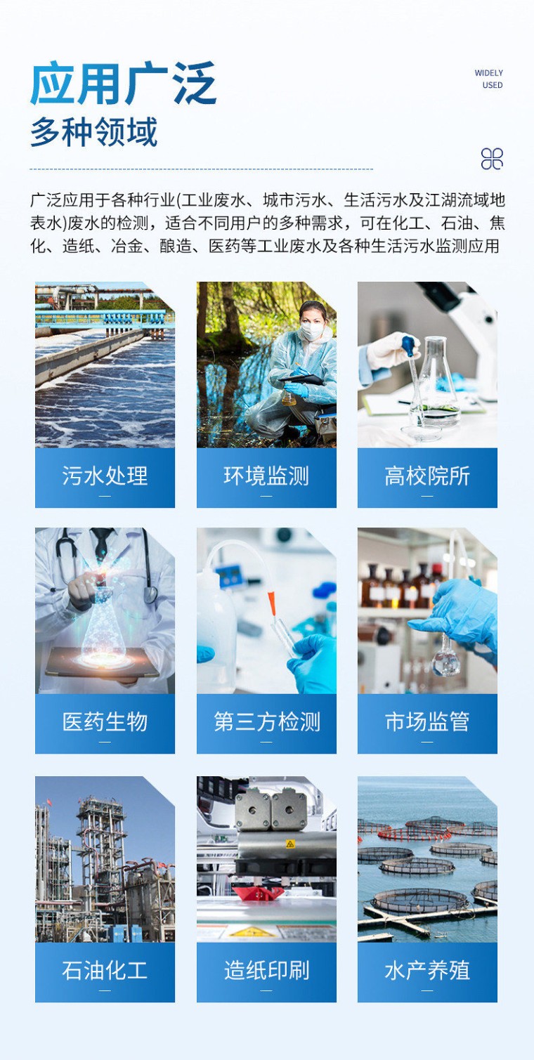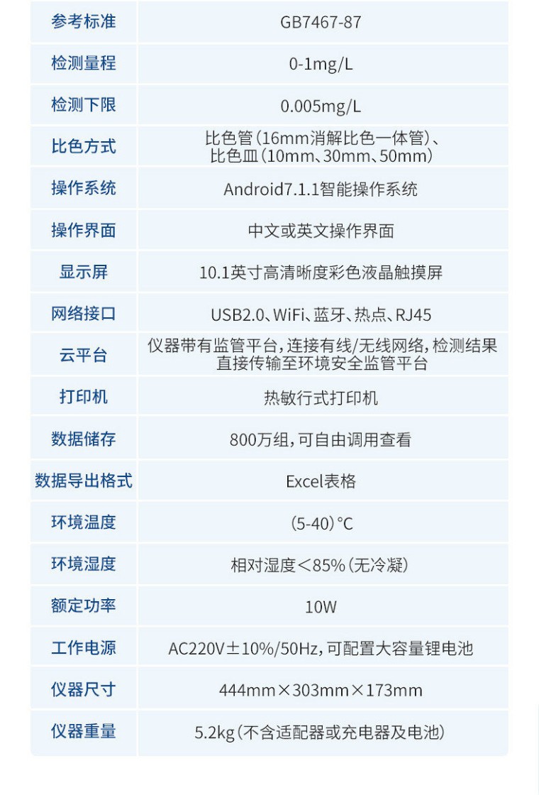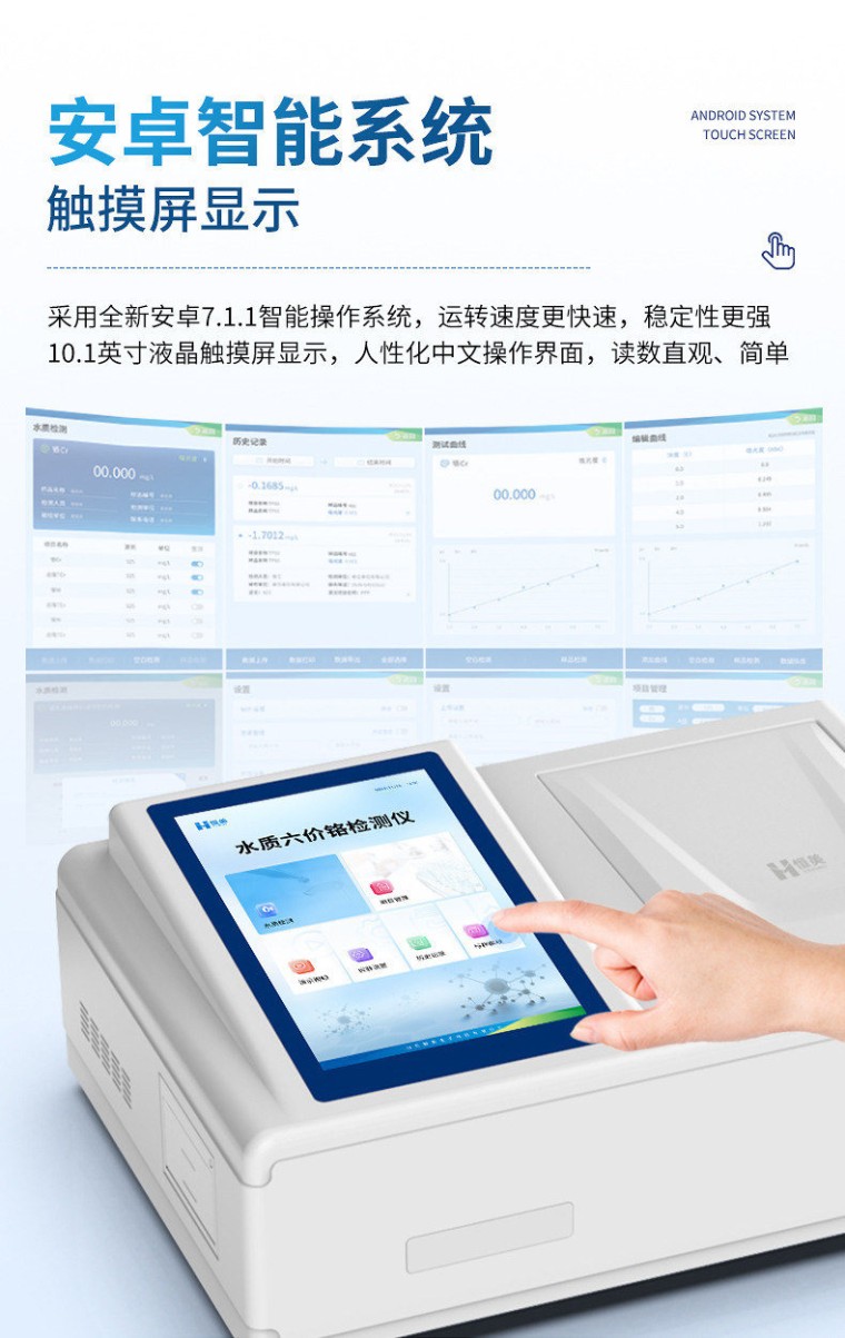 一、设备简介: 水质六价铬检测仪是参考国家标准、环境标准等相关标准设计制造,适用于国内外众多检测标准。 主要检测水质六价铬重金属含量指标,兼具智能数据分析功能,图表、列表显示数据,分析一目了然;高清晰度彩色液晶触摸显示屏,Android智能操作系统,中文显示界面,中英文键盘,人性化操作,使用更简单。 二、应用广泛: 能够广泛的应用于各种行业(工业废水、城市污水、生活污水及江湖流域地表水)废水的检测,可适合不同用户的多种需求,可在化工、石油、焦化、造纸、冶金、酿造、医药等工业废水及各种生活污水监测应用。 三、功能特点: 1、采用全新安卓7.1.1智能操作系统,人性化中文操作界面,运转速度更快速,稳定性更强。 2、10.1英寸液晶触摸屏显示,人性化中文操作界面,读数直观、简单。 3、采用精密比色池设计,使用光源一致,可以解决由于光源误差带来的检测结果误差问题,检测结果更加精准。 4、光源采用进口超高亮发光二极管,光源亮度可以自动调节与校准。 5、支持10mm、30mm、50mm皿比色和φ16mm管比色等比色方式,多元选择,确保测量的准确性; 6、具有无线通讯功能,支持WIFI、RJ45、手机热点联网传输,检测数据亦可通过U盘导出; 7、多功能样品管理,可对样品进行中英文命名,方便样品记录和数据存储; 8、仪器可**存储800万组数据,为方便大量数据查找,可通过时间检索,并随意选择分析; 9、仪器带有监管云平台,数据可通过局域网和互联网上传,亦可对接上传至环境监管部门平台。 10、内置热敏行式打印机,打印纸上的内容可自由选择(包括二维码打印); 11、交流220V,可选配6ah大容量充电锂电池,方便户外流动测试; 12、内置教学演示视频,用户可一边看仪器内操作视频,一边进行实验操作,更易上手。 13、后期产品固件可升级。 四、技术参数: 示值误差:≤±5%; 仪器稳定性:<0.5%; 仪器重复性:<0.5%; 光化学稳定性:20min内数值漂移≤0.002A(10万小时寿命); 检测方法:二苯碳酰二肼分光光度法 参考标准:GB7467-87; 检测量程:0-1mg/L; 检测下限:0.005mg/L; 五、物理参数 比色方式:比色管(16mm消解比色一体管)、比色皿(10mm、30mm、50mm); 操作系统:Android7.1.1智能操作系统 操作界面:中文或英文操作界面; 显示屏:10.1英寸高清晰度彩色液晶触摸屏; 网络接口:USB2.0、WiFi、蓝牙、热点、RJ45; 云平台:仪器带有监管平台,连接有线/无线网络,检测结果直接传输至环境安全监管平台。 打印机:热敏行式打印机; 数据储存:800万组,可自由调用查看; 数据导出格式:Excel表格; 仪器尺寸:444 x 303 x 173 mm; 仪器重量:5.2kg(不含适配器或充电器及电池); 六:环境及工作参数 环境温度:(5-40)℃; 环境湿度:相对湿度<85%(无冷凝); 额定功率:10W 工作电源:AC220V±10%/50Hz; 可配置:大容量锂电池。