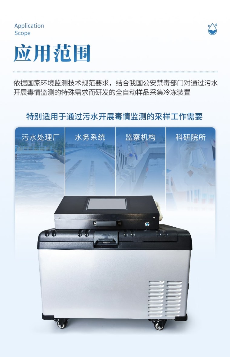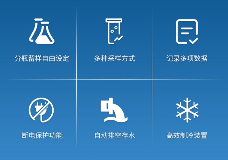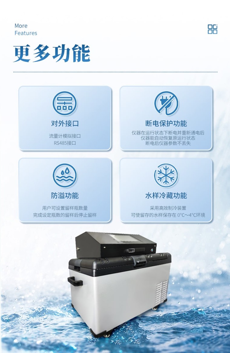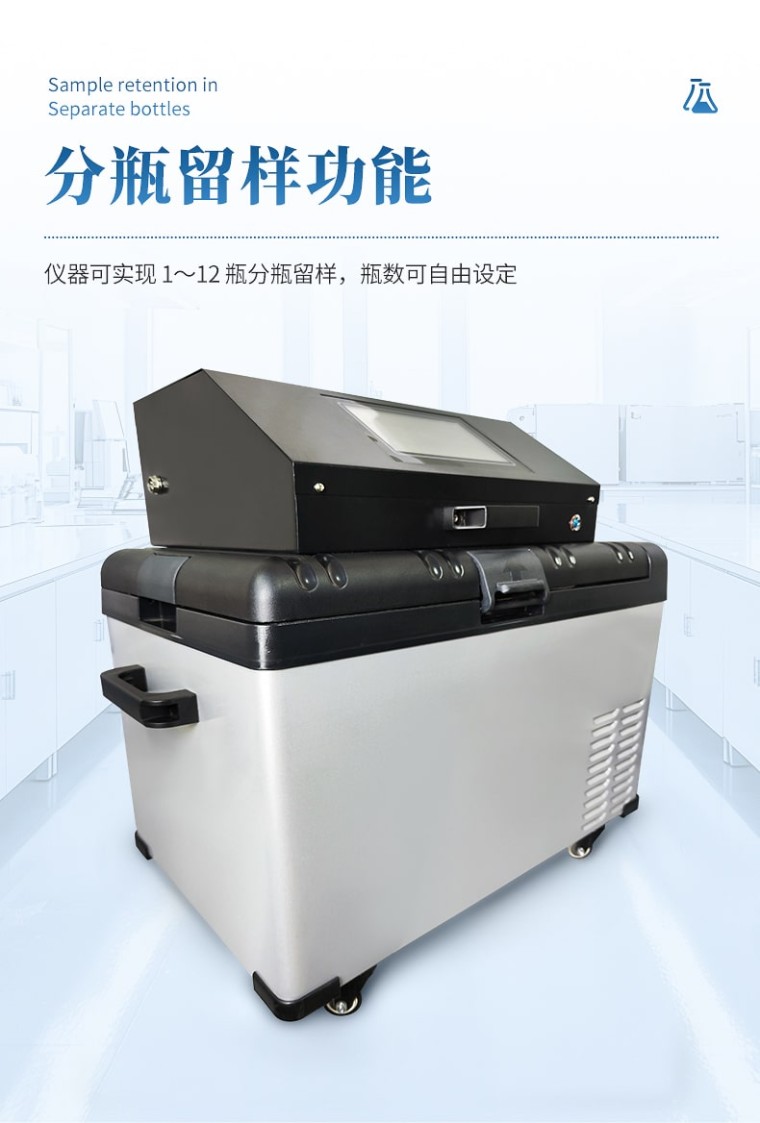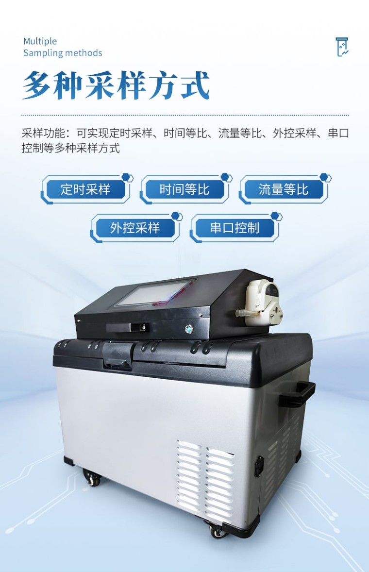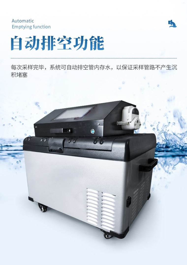 等比例水质采样器是依据国家环境监测技术规范要求,结合我国公安禁毒部门对通过污水开展毒情监测的特殊需求而研发的全自动样品采集冷冻装置。独特的即采即冻和智能锁设计能够有效降低采样工作量和人为干预风险,保证样品质量,增强样品真实性,特别适用于通过污水开展毒情监测的采样工作需要。该仪器具有密码保护、断电保护等保护功能,可实现按定时、时间等比例、流量等比例、外控采样、串口控制等多种方式采样。 功能特点: 1、分瓶留样功能:仪器可实现 1~12 瓶分瓶留样,瓶数可自由设定; 2、采样功能:可实现定时采样、时间等比、流量等比、外控采样、串口控制等多种采样方式; 3、记录功能:可记录每次采样的留样瓶号、留样时间、留样量、COD 值和 NH3-N 值,可记录** 1000 条数据记录; 4、对外接口:流量计模拟接口,RS485 接口; 5、断电保护功能:仪器在运行状态下断电并重新通电后,仪器能自动恢复原 运行状态,断电后仪器参数不丢失; 6、自动排空功能:每次采样完毕,系统可自动排空管内存水,以保证采样管 路不产生沉积堵塞; 7、防溢功能:用户可设置留样瓶数量,完成设定瓶数的留样后停止留样; 8、水样冷藏功能:采用高效制冷装置,可使留存的水样保存在 0℃~4℃环境; 技术参数: