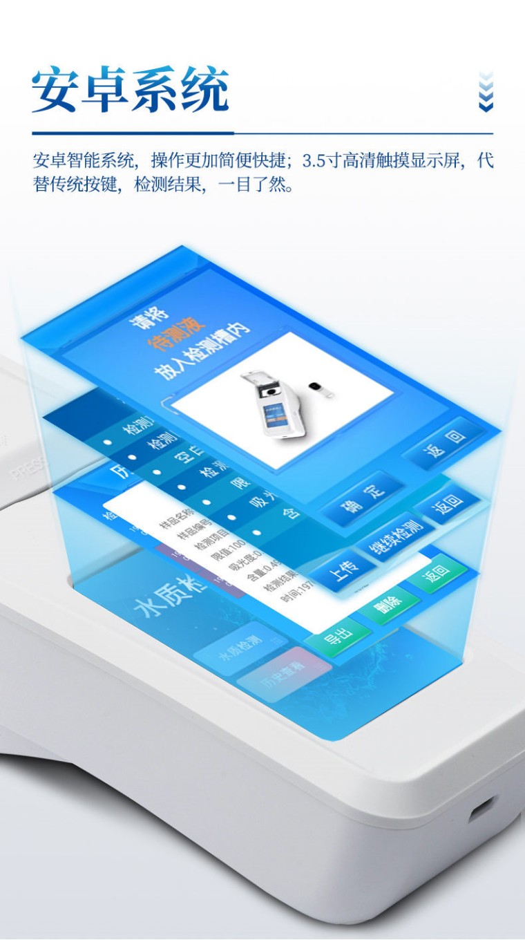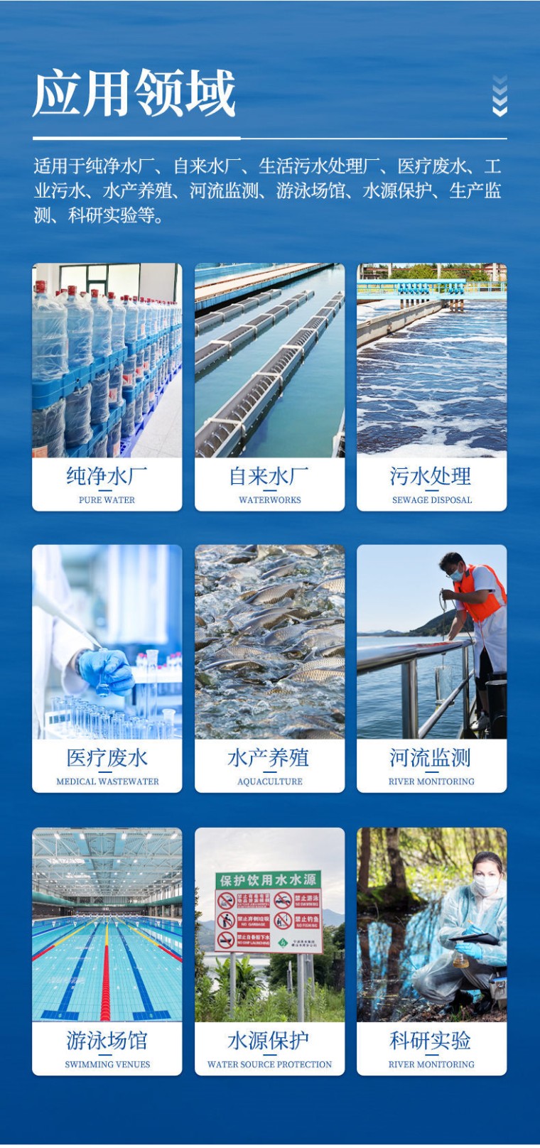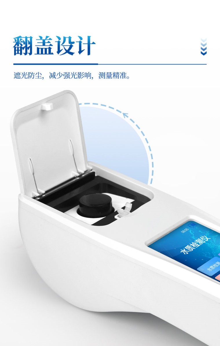 便携式余氯检测仪配合快速显色检测试剂,可“快速、简单、准确、稳定”进行水中余氯指标的测量,该仪器拥有精美的外观造型,简单的操作界面,准确的检测系统,帮助用户获得精细的数据,可更准确、有效的分析水体状况。 应用行业: 适用于纯净水厂、自来水厂、生活污水处理厂、医疗废水、工业污水、游泳场馆、水产养殖、河流监测、水源保护、生产监测、科研实验等。 仪器特点: ①安卓智能系统,操作更佳简便快捷; ②配置云监控平台,检测结果可直接无线传至平台,进行水质长短期分析,辅助管理。 ③内置操作流程、操作简单、无需培训、直接上手; ④检测速度更快,现场读取数据; ⑥便携式体积小,重量轻,方便户外检测; ⑦外形小巧美观,工作稳定免维护,具有较好的性价比; ⑧采用进口冷光源,光学性能稳定,寿命长达10万小时; ⑨交直流两用,内置充电锂电池,环保耐用可支持连续室内外工作。 参数指标: 检测项目:水体余氯 参考标准:HJ 586-2010;GB/T 5750.11-2023; 测量范围:0.04~3mg/L、0.2~15mg/L; 测量方式:光电比色 重复性:<0.5% 稳定性:<0.5% 波长选择:自动 操作系统:安卓智能操作系统 显示屏幕:3.5寸彩色液晶触摸屏 灵敏度(吸光度):0.001 使用环境:温度0~50℃,湿度0~90% 数据存储:80000条以上 通讯:Type-C、WIFI、热点、蓝牙 电池:5600mAh锂电池 连续工作时间:8小时 供电电压:5V/DC直流 外形尺寸:190*77*72mm 主机重量:325g 支持语言:简体中文或英文
