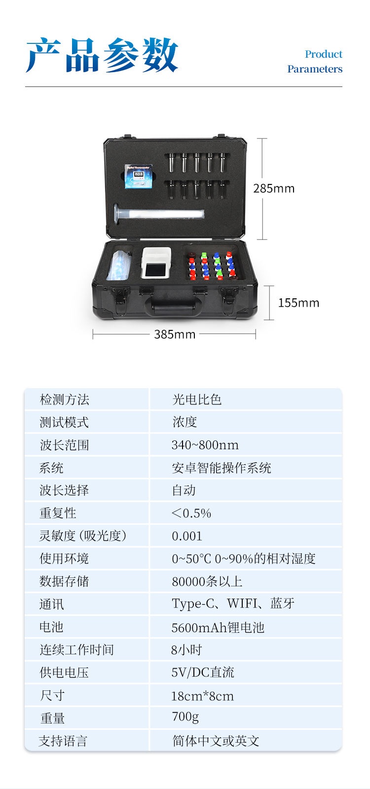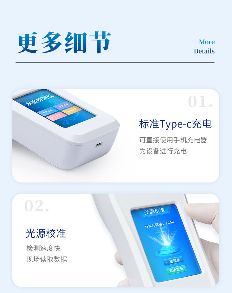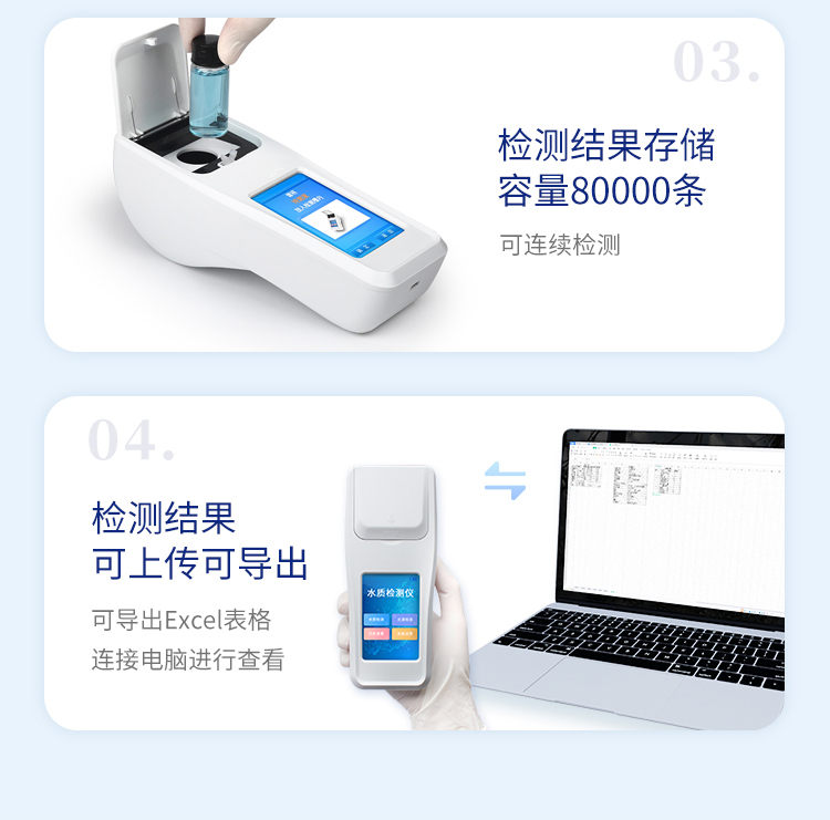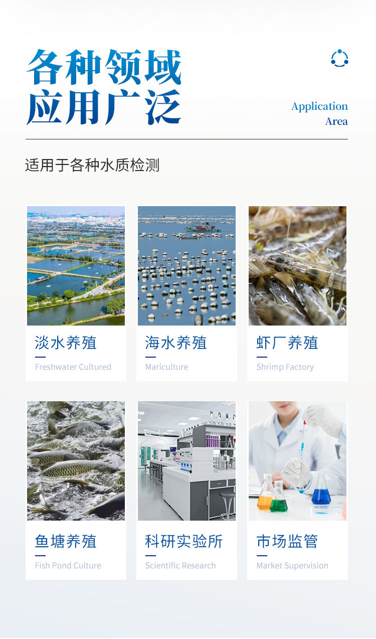 水产养殖检测仪是一款适用于工业污水、水产养殖、河流监测、游泳场馆等领域的检测仪,配合快速显色检测试剂,可“快速、简单、准确、稳定”进行测量,拥有精美的外观造型,简单的操作界面,准确的检测系统,帮助用户获得精细的数据,可更准确、有效的分析水体状况,提前预防养殖风险,及时避免损失。 应用行业: 适用于纯净水厂、自来水厂、生活污水处理厂、工业污水、水产养殖、河流监测、游泳场馆、水源保护、生产监测、科研实验等。 仪器特点: ①安卓智能系统,操作更佳简便快捷; ②配置云监控平台,检测结果可直接无线传至平台,进行水质长短期分析,辅助管理。 ③内置操作流程、操作简单、无需培训、直接上手; ④检测速度更快,现场读取数据; ⑥便携式体积小,重量轻,方便户外检测; ⑦外形小巧美观,工作稳定免维护,具有较好的性价比; ⑧采用进口冷光源,光学性能稳定,寿命长达10万小时; ⑨交直流两用,内置充电锂电池,环保耐用可支持连续室内外工作。 参数指标: pH:5.5~9.5; 溶解氧:1~12mg/L; 氨氮:0.05~5mg/L(以N计); 亚硝酸盐:0.005~0.4mg/L(以N计); 硫化氢:0.02~2mg/L(以S2-计); 总碱度:8~400mg/L,40~2000mg/L(以CaCO3计); 测量方式:光电比色 重复性:<0.5% 稳定性:<0.5% 波长选择:自动 操作系统:安卓智能操作系统 显示屏幕:3.5寸彩色液晶触摸屏 灵敏度(吸光度):0.001 使用环境:温度0~50℃,湿度0~90% 数据存储:80000条以上 通讯:Type-C、WIFI、热点、蓝牙 电池:5600mAh锂电池 连续工作时间:8小时 供电电压:5V/DC直流 外形尺寸:190*77*72mm 主机重量:325g 支持语言:简体中文或英文