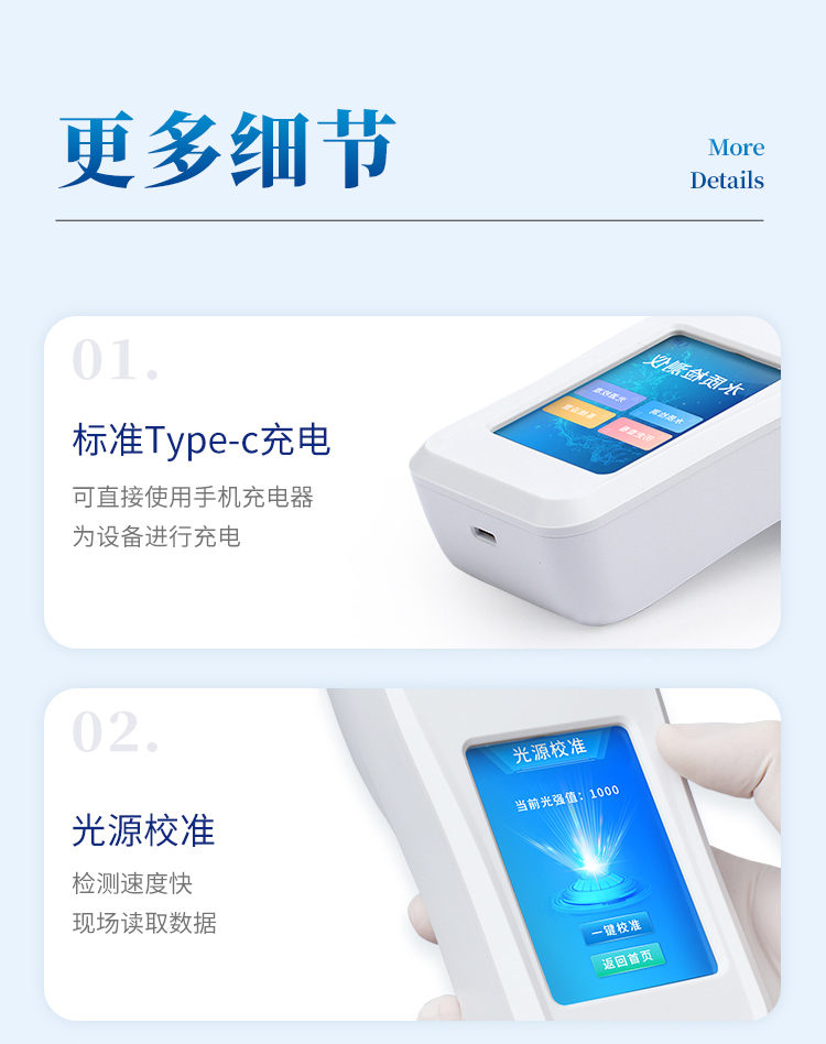 色度检测仪配合快速显色检测试剂,可“快速、简单、准确、稳定”进行水中色度指标的测量,该仪器拥有精美的外观造型,简单的操作界面,准确的检测系统,帮助用户获得精细的数据,可更准确、有效的分析水体状况,提前预防,及时避免损失。 仪器特点: ①安卓智能系统,操作更佳简便快捷; ②配置云监控平台,检测结果可直接无线传至平台,进行水质长短期分析,辅助管理。 ③内置操作流程、操作简单、无需培训、直接上手; ④检测速度更快,现场读取数据; ⑥便携式体积小,重量轻,方便户外检测; ⑦外形小巧美观,工作稳定免维护,具有较好的性价比; ⑧采用进口冷光源,光学性能稳定,寿命长达10万小时; ⑨交直流两用,内置充电锂电池,环保耐用可支持连续室内外工作。 参数指标: 检测项目:色度 参考标准:GB11903-89 测量范围:5~200度 重复性:<0.5% 稳定性:<0.5% 波长选择:自动 操作系统:安卓智能操作系统 显示屏幕:3.5寸彩色液晶触摸屏 灵敏度(吸光度):0.001 使用环境:温度0~50℃,湿度0~90% 数据存储:80000条以上 通讯:Type-C、WIFI、热点、蓝牙 电池:5600mAh锂电池 连续工作时间:8小时 供电电压:5V/DC直流 外形尺寸:190*77*72mm 主机重量:325g 支持语言:简体中文或英文