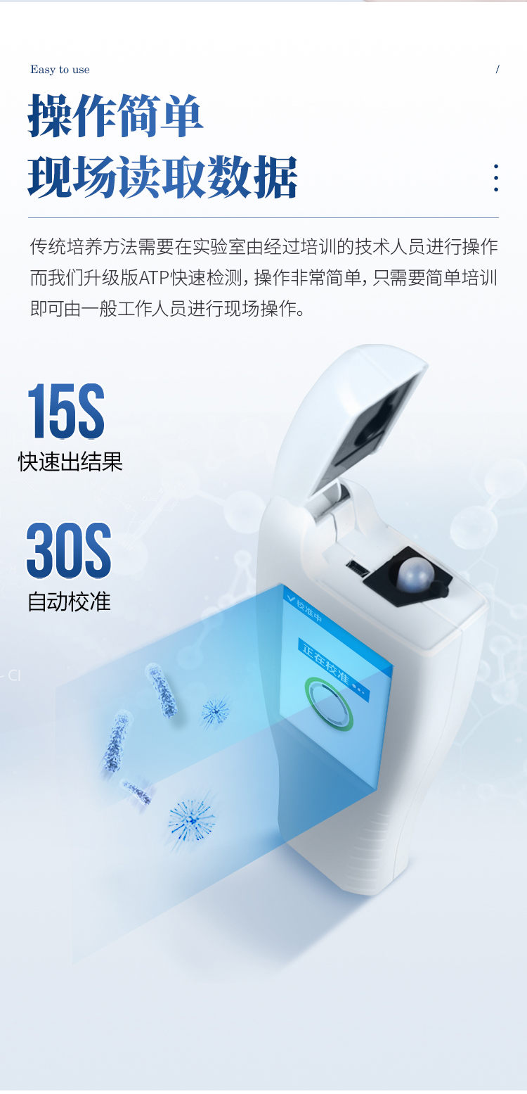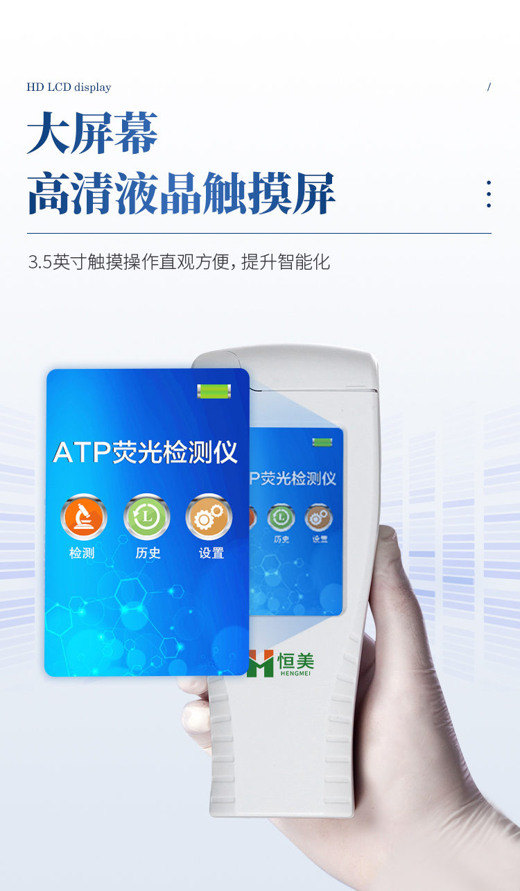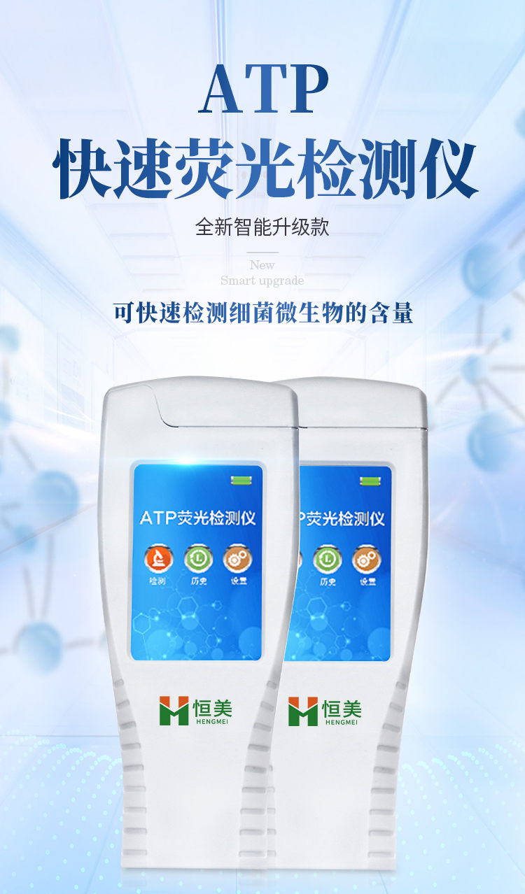 产品简介: 水中微生物检测仪器可快速检测各种水质中微生物、细菌含量。设备为全新升级产品,大屏幕触摸显示屏,代替传统按键。操作采用生物化学反应方法检测ATP含量,水中微生物检测仪器基于萤火虫发光原理,利用“荧光素酶—荧光素体系”快速检测三磷酸腺苷(ATP)。ATP拭子含有可以裂解细胞膜的试剂,能将细胞内ATP释放出来,与试剂中含有的特异性酶发生反应,产生光,再用荧光照度计检测发光值,微生物的数量与发光值成正比,由于所有生物活细胞中含有恒量的ATP,所以ATP含量可以清晰地表明样品中微生物与其他生物残余的多少,用于判断卫生状况。 仪器特性: 实用性 —— 可根据环境检测需求设定上下限值,做到数据快速评估预警,表面洁净度快速筛查。 灵敏度高 —— 10-15~10-18 mol 速度快 —— 常规培养法18-24h以上,而ATP只需要十几秒钟 . 可行性 —— 微生物数量与微生物体内所含ATP有明确的相关性。 通过检测ATP含量,可间接得出反应中微生物数量 可操作性 —— 传统培养方法需要在实验室由经过培训的技术人员进行操作;而ATP快速洁净度检测操作非常简便,只需简单的培训即可由一般工作人员进行现场操作。 体验更好 —— 试子套管采用插拔式灵活设计,可定期清洗长期使用,延长仪器寿命。 主要参数: 1、显示屏:3.5英寸高精度图形触摸屏 2、处理器:32位高速数据处理芯片 3、检测精度:1×10-18mol 4、大肠菌群:1-106cfu 5、检测范围:0 to 999999 RLUs 6、检测时间:15秒 7、检测干扰:±5﹪或±5 RLUs 8、操作温度范围:5℃到40℃ 9、操作湿度范围:20—85﹪ 10、ATP回收率:90-110% 11、检出模式:RLU、大肠菌群筛查 12、50个用户ID 设定 13、可任意设定上限值,下限值 14、自动判断合格与不合格 15、自动统计合格率 16、内置自校光源 17、开机30秒自检 18、配有miniUSB接口,可将结果上传至PC 19、配备专用软件驱动U盘代替传统光盘 20、仪器尺寸(W×H×D):188 mm×77mm×37mm 21、使用可充电锂电池免电池更换 22、备用状态(20℃):6个月 23、中文操作手册 24、稳定的液体荧光素酶 25、润湿的一体化采集拭子 恒美ATP荧光检测仪用途广泛,可用于: 食品、医药卫生、医药、日化、造纸、工业水处理、国防以及环保、水政、海关出入境检疫及其他执法部门等多种行业 。 随机配置:ATP荧光检测仪(手持)主机、仪器包、挂绳、PC数据线、数据分析软件、中文操作手