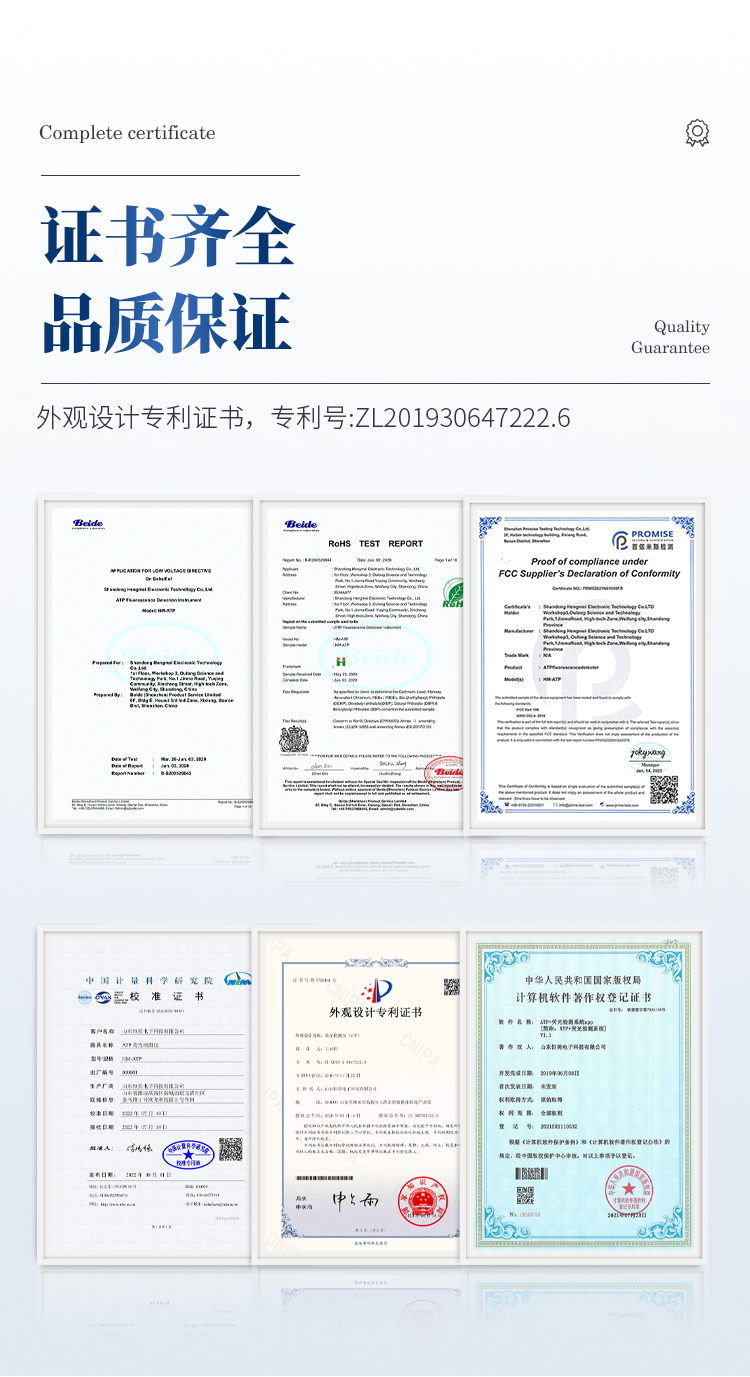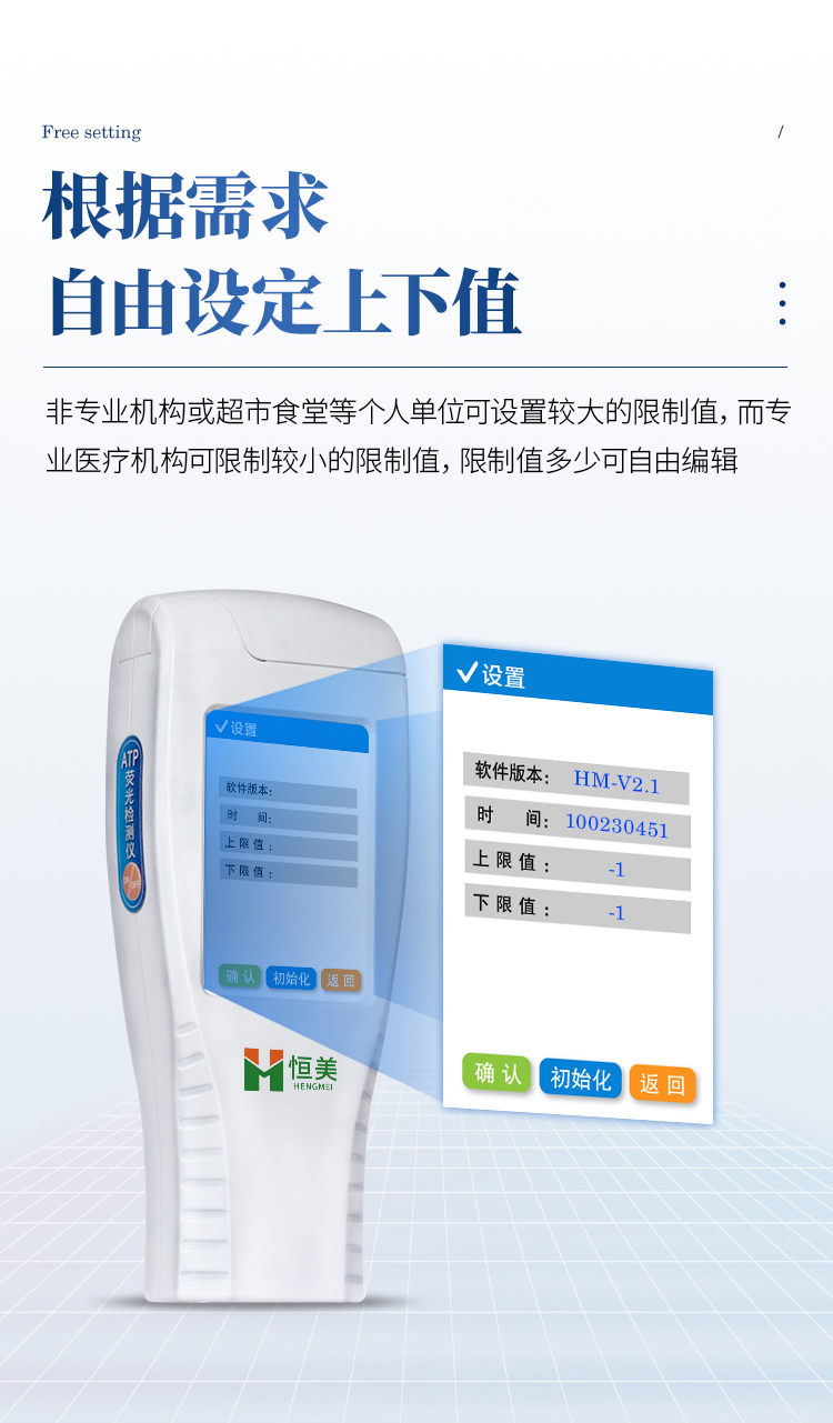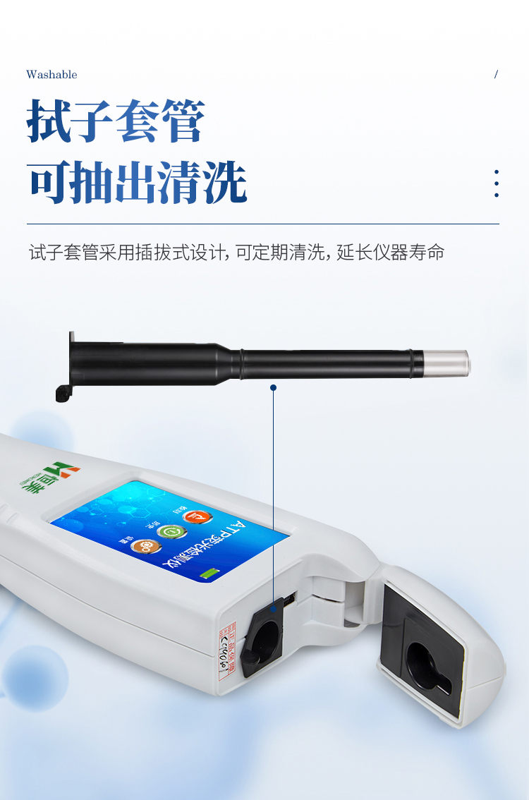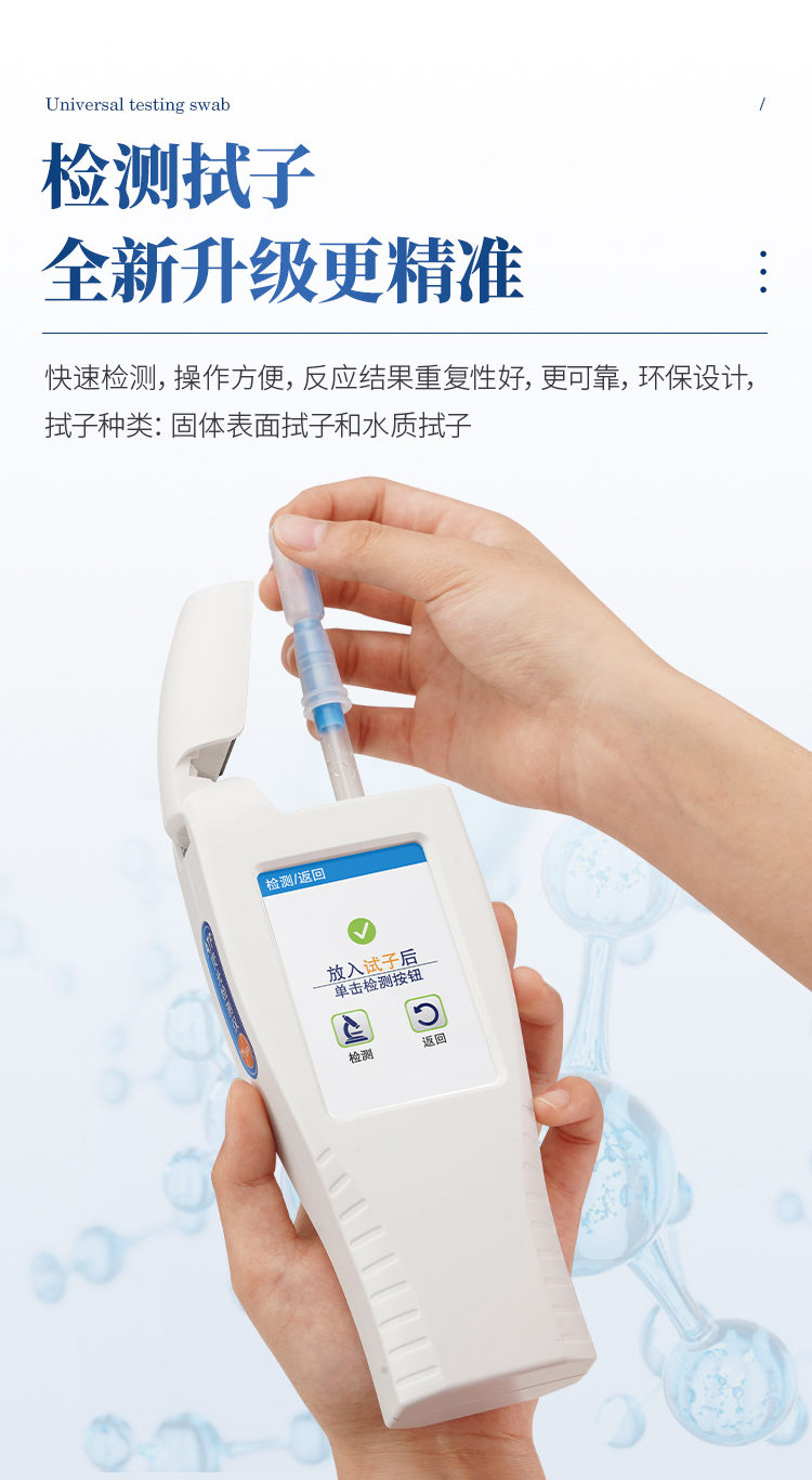 产品简介: 水中微生物检测仪器可快速检测各种水质中微生物、细菌含量。设备为全新升级产品,大屏幕触摸显示屏,代替传统按键。操作采用生物化学反应方法检测ATP含量,水中微生物检测仪器基于萤火虫发光原理,利用“荧光素酶—荧光素体系”快速检测三磷酸腺苷(ATP)。ATP拭子含有可以裂解细胞膜的试剂,能将细胞内ATP释放出来,与试剂中含有的特异性酶发生反应,产生光,再用荧光照度计检测发光值,微生物的数量与发光值成正比,由于所有生物活细胞中含有恒量的ATP,所以ATP含量可以清晰地表明样品中微生物与其他生物残余的多少,用于判断卫生状况。 仪器特性: 实用性 —— 可根据环境检测需求设定上下限值,做到数据快速评估预警,表面洁净度快速筛查。 灵敏度高 —— 10-15~10-18 mol 速度快 —— 常规培养法18-24h以上,而ATP只需要十几秒钟 . 可行性 —— 微生物数量与微生物体内所含ATP有明确的相关性。 通过检测ATP含量,可间接得出反应中微生物数量 可操作性 —— 传统培养方法需要在实验室由经过培训的技术人员进行操作;而ATP快速洁净度检测操作非常简便,只需简单的培训即可由一般工作人员进行现场操作。 体验更好 —— 试子套管采用插拔式灵活设计,可定期清洗长期使用,延长仪器寿命。 主要参数: 1、显示屏:3.5英寸高精度图形触摸屏 2、处理器:32位高速数据处理芯片 3、检测精度:1×10-18mol 4、大肠菌群:1-106cfu 5、检测范围:0 to 999999 RLUs 6、检测时间:15秒 7、检测干扰:±5﹪或±5 RLUs 8、操作温度范围:5℃到40℃ 9、操作湿度范围:20—85﹪ 10、ATP回收率:90-110% 11、检出模式:RLU、大肠菌群筛查 12、50个用户ID 设定 13、可任意设定上限值,下限值 14、自动判断合格与不合格 15、自动统计合格率 16、内置自校光源 17、开机30秒自检 18、配有miniUSB接口,可将结果上传至PC 19、配备专用软件驱动U盘代替传统光盘 20、仪器尺寸(W×H×D):188 mm×77mm×37mm 21、使用可充电锂电池免电池更换 22、备用状态(20℃):6个月 23、中文操作手册 24、稳定的液体荧光素酶 25、润湿的一体化采集拭子 恒美ATP荧光检测仪用途广泛,可用于: 食品、医药卫生、医药、日化、造纸、工业水处理、国防以及环保、水政、海关出入境检疫及其他执法部门等多种行业 。 随机配置:ATP荧光检测仪(手持)主机、仪器包、挂绳、PC数据线、数据分析软件、中文操作手