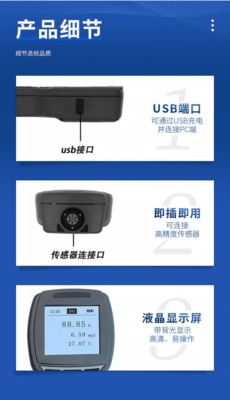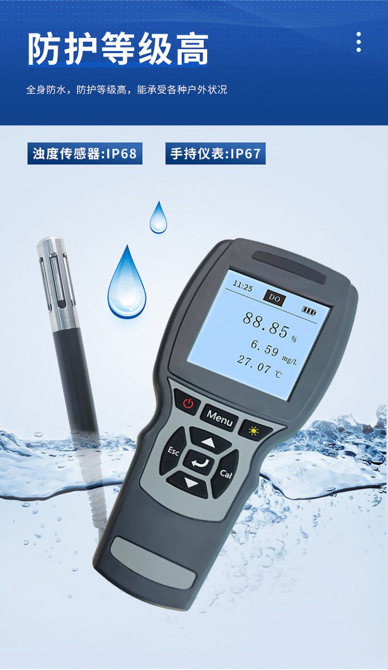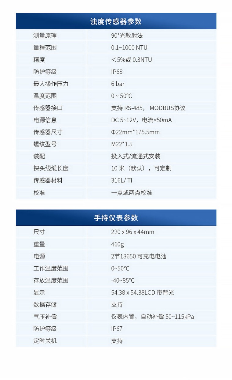 介绍: 恒美全新光学浊度传感器,光纤传感技术,采用 90°散射光测定原理,符合 ISO7027 国际标准,定制光学器件,尺寸小巧,安装维护简便,不易受环境光的干扰,具有更出色的重复性和稳定性。 让浊度测量更精准、更稳定、更迅速、更便捷。 带背光显示和操作键盘,功能全面操作简单,界面简洁,浊度光纤传感器自动识别,测量数据的读取、存储,传感器校准等功能,并且可以 USB 数据导出,实现更多高端功能。追求高性价比是我们一贯的追求。 适用面广,可用于地表水、污水、海水、自来水等多个场景水质检测,满足客户需求。 特点: 数字传感器,RS-485 输出,标准 Modbus; 抗干扰能力强,不受环境光线和色度影响; 90°散射光原理; 蓝宝石光学窗口。 参数: 测量原理:90°光散射法 量程范围:0.1~1000 NTU 精度:<5%或 0.3NTU 防护等级:IP68 最大操作压力:6 bar 温度范围:0 ~ 50℃ 传感器接口:支持 RS-485, MODBUS 协议 电源信息:DC 5~12V,电流<50mA 传感器尺寸:Φ22mm*175.5mm 螺纹型号:M22*1.5 装配:投入式/流通式安装 探头线缆长度:10 米(默认),可定制 传感器材料:316L/ Ti 校准:一点或两点校准 特点: 1、 一机多用,支持恒美多种数字传感器 2、 内置气压传感器,可对溶解氧自动补偿 3、 自动识别传感器类型,开机即可测量 4、 简单易用,无需说明书,也能自如的操作 参数: 1 尺寸:220 x 96 x 44mm 2 重量:460g 3 电源:2 节 18650 可充电电池 4 工作温度范围:0~50℃ 5 存放温度范围:-40~85℃ 6 显示:54.38 x 54.38LCD 带背光 7 数据存储:支持 8 气压补偿:仪表内置,自动补偿 50~115kPa 9 防护等级:IP67 10 定时关机:支持 配置: 手持仪表:1台 光学电极:1个,5m,可以选配线缆长度 18650可充电电池:2节,3.7V USB连接线:1根,Micro USB 腕带:1根 螺丝刀:1把,用来打开电池盖 O-ring:1个,荧光帽密封备件 海绵:2个,荧光帽保湿 橡胶套:1个,荧光帽保存